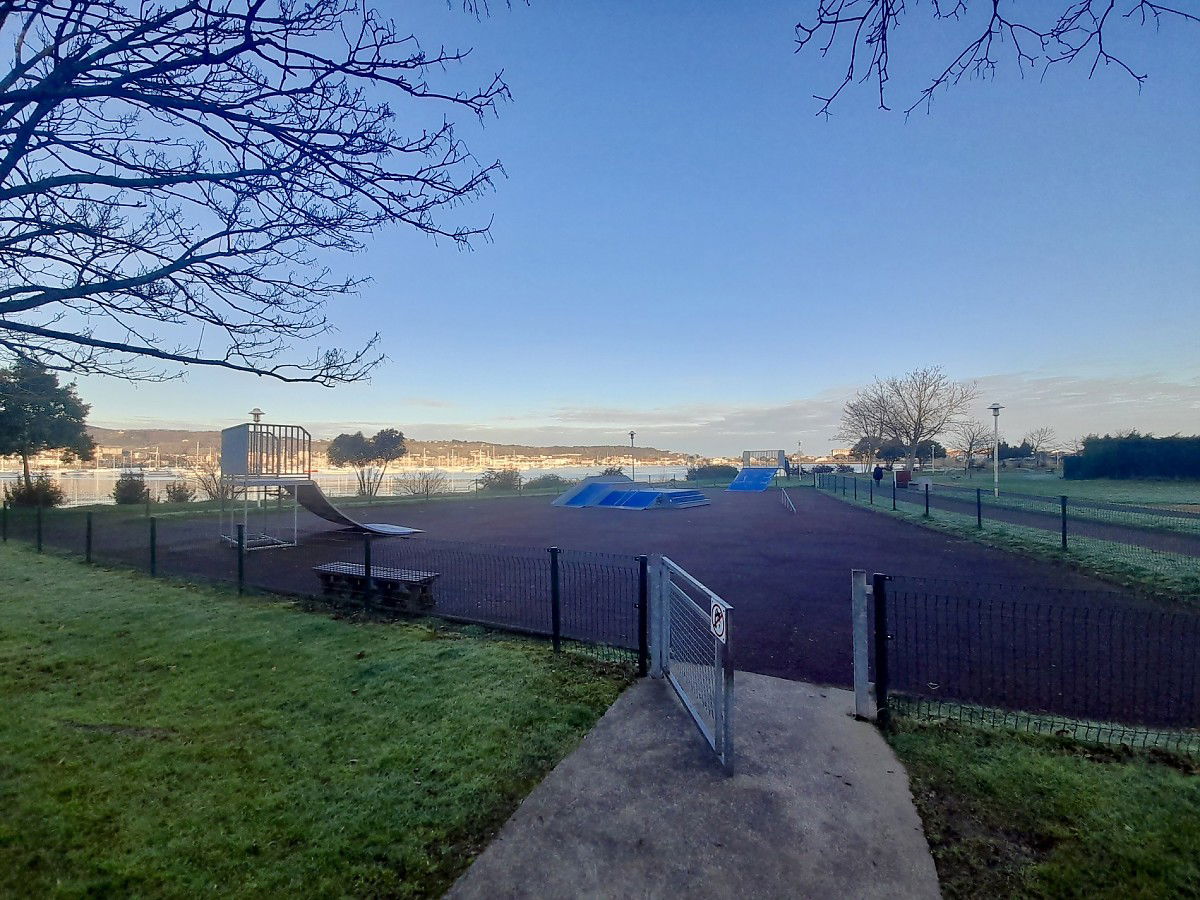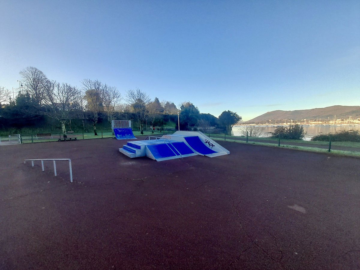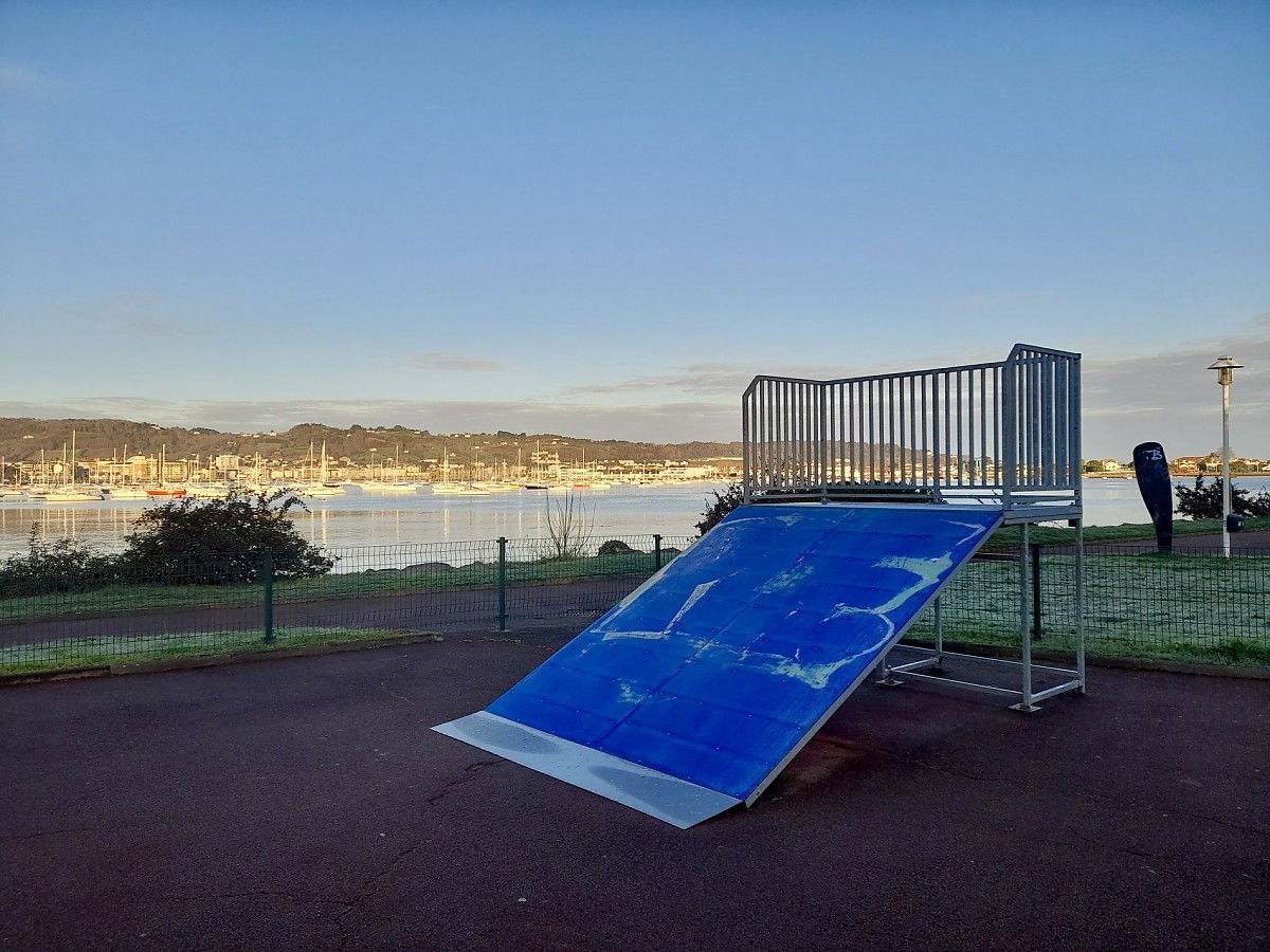 Hendaye skatepark is made up of some metal ramps in a back and forth run with a quarter pipe and bank on the sides of a funbox.