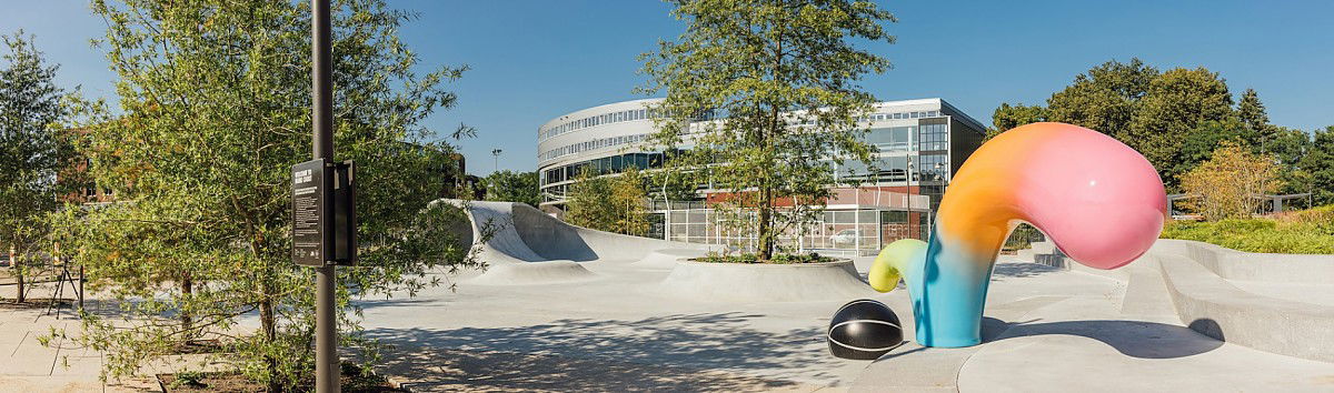 Hilversum’s Nike Skatepark, also known as the Nike HomeCourt Skate Landscape, is a striking public space located in the Arenapark, Hilversum. Opened in 2021, this skatepark is part of the Nike EMEA headquarters campus and was designed by the architecture firm F31 in collaboration with landscape architects Bureau B+B. It spans 2,300 square meters and is built as a unique “skate landscape,” blending traditional architecture with skateboarding features.