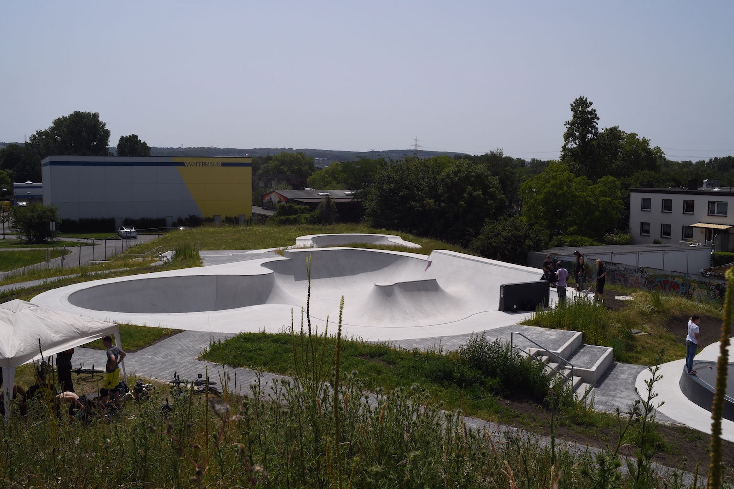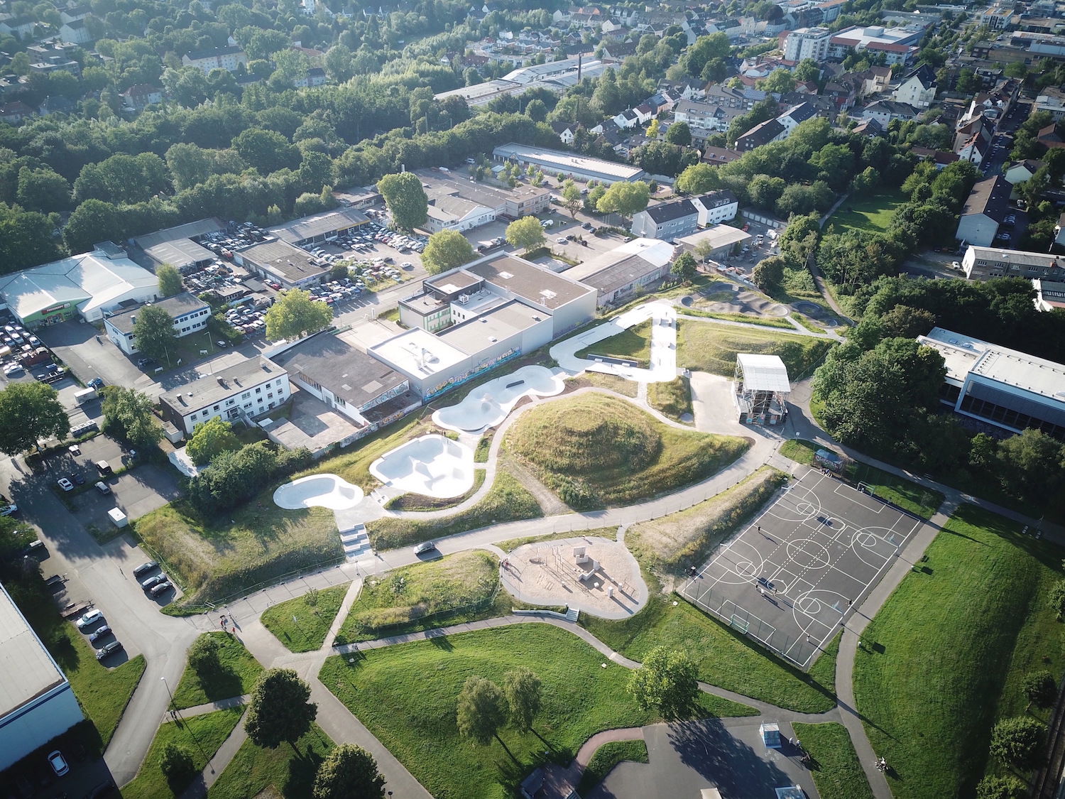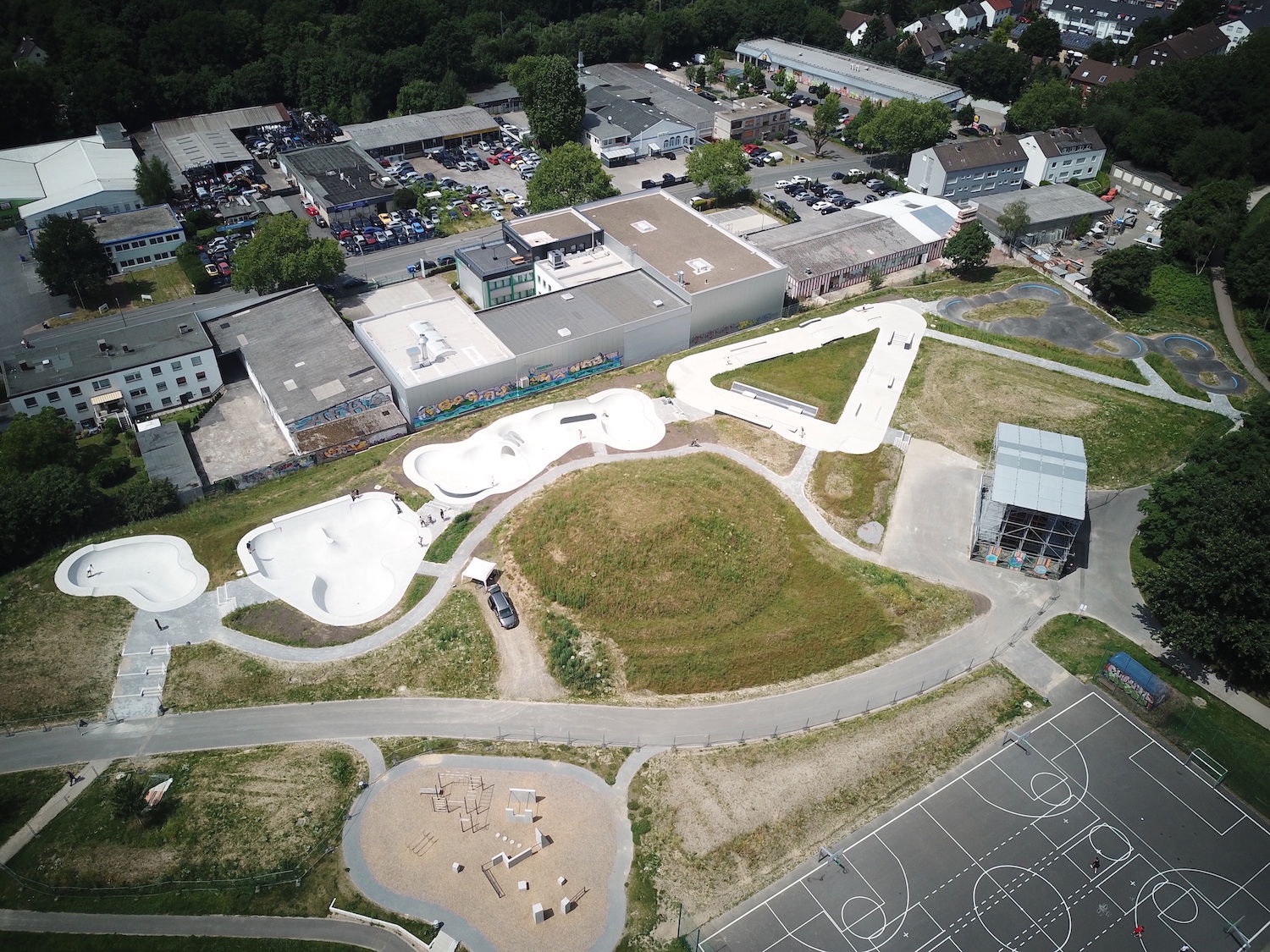The park is called Skatepark Hombruch it is built on an old mining area and symbolizes the industrial aesthetic common to the area. It includes a snake run with tunnel, one large bowl with pool coping and one smaller bowl with steel coping. The street course is around 900 m² and has all kinds of fun features like a china bank and our machine gun obstacle. The park also includes two pumptracks, basketball, calisthenics, parkour and a 14 m tall climbing wall.