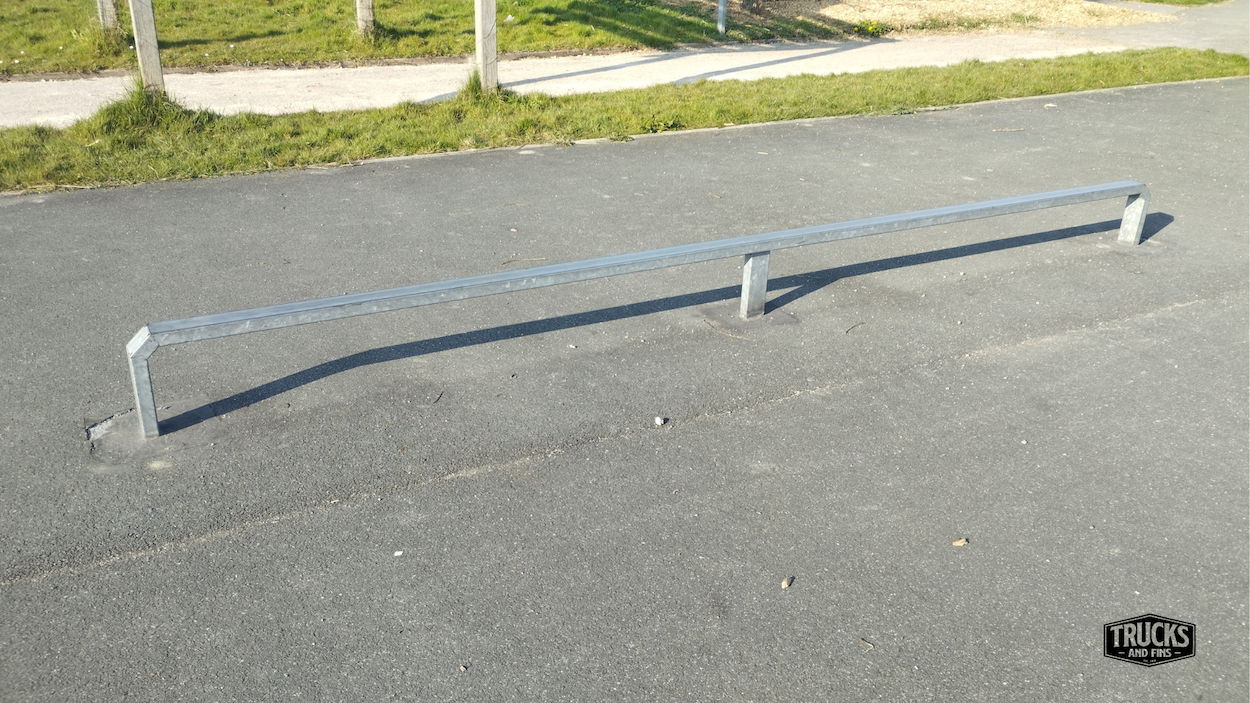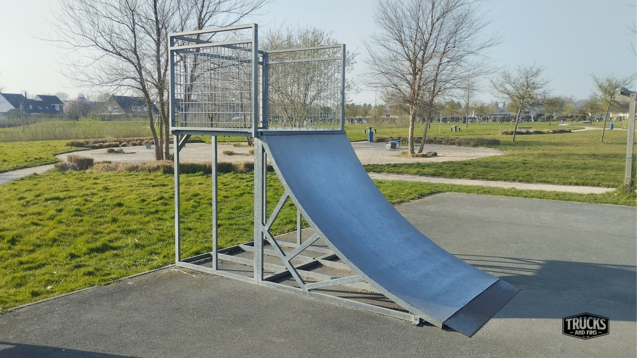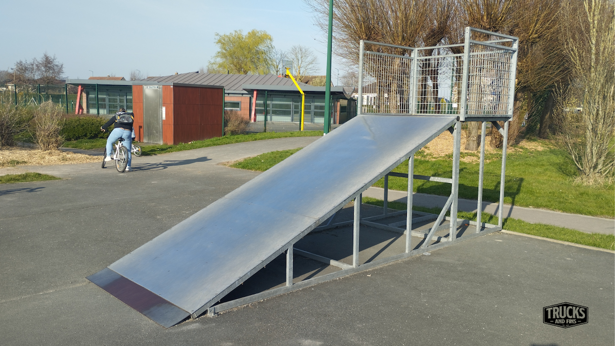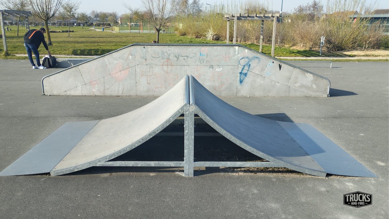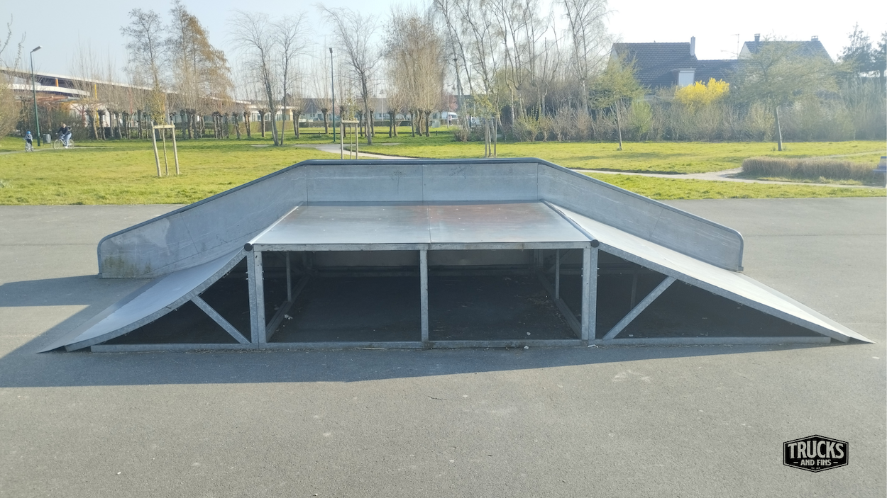 Hoymille skatepark is made up of a back and forth run with a quarter pipe and bank on the sides of a funbox.