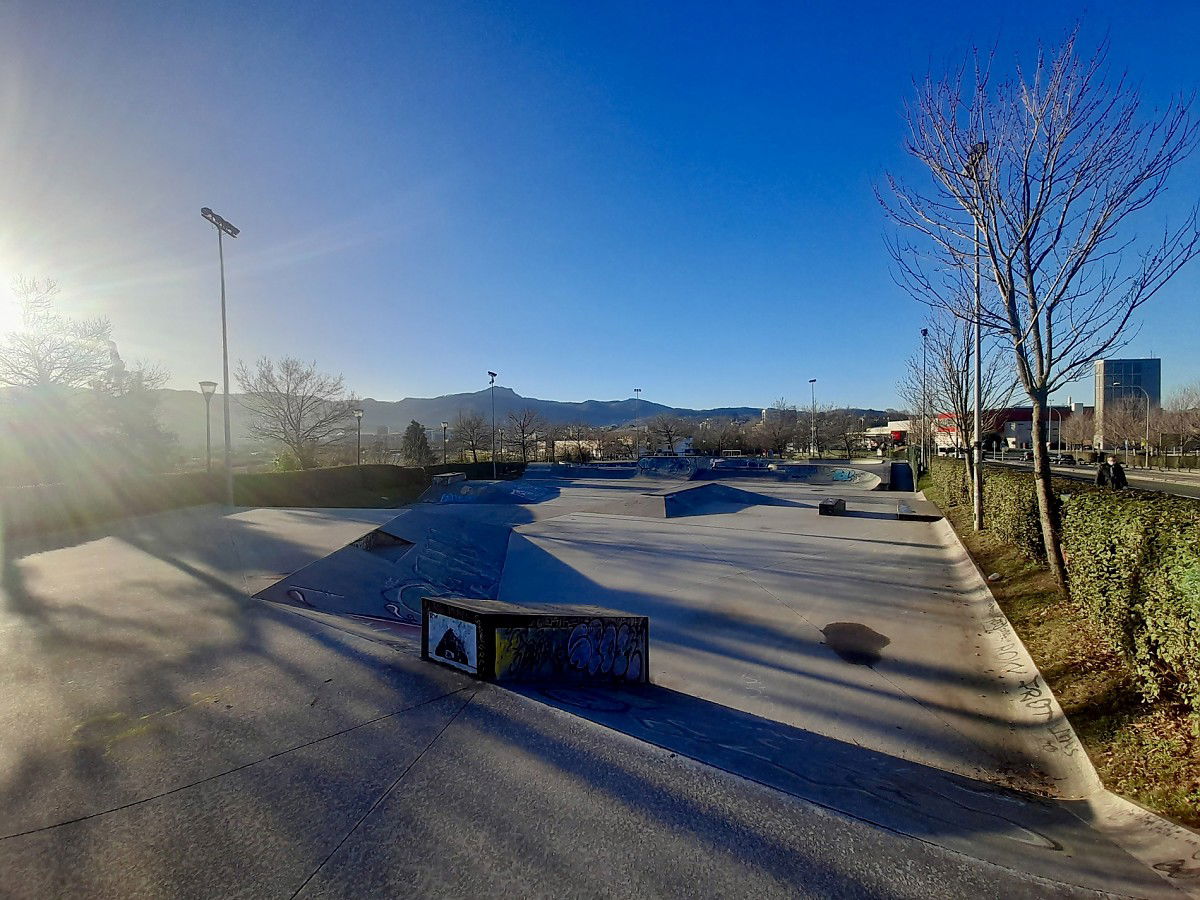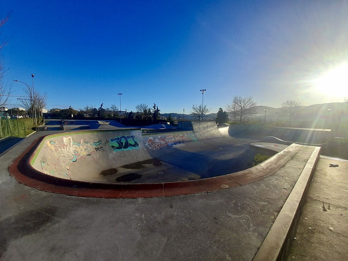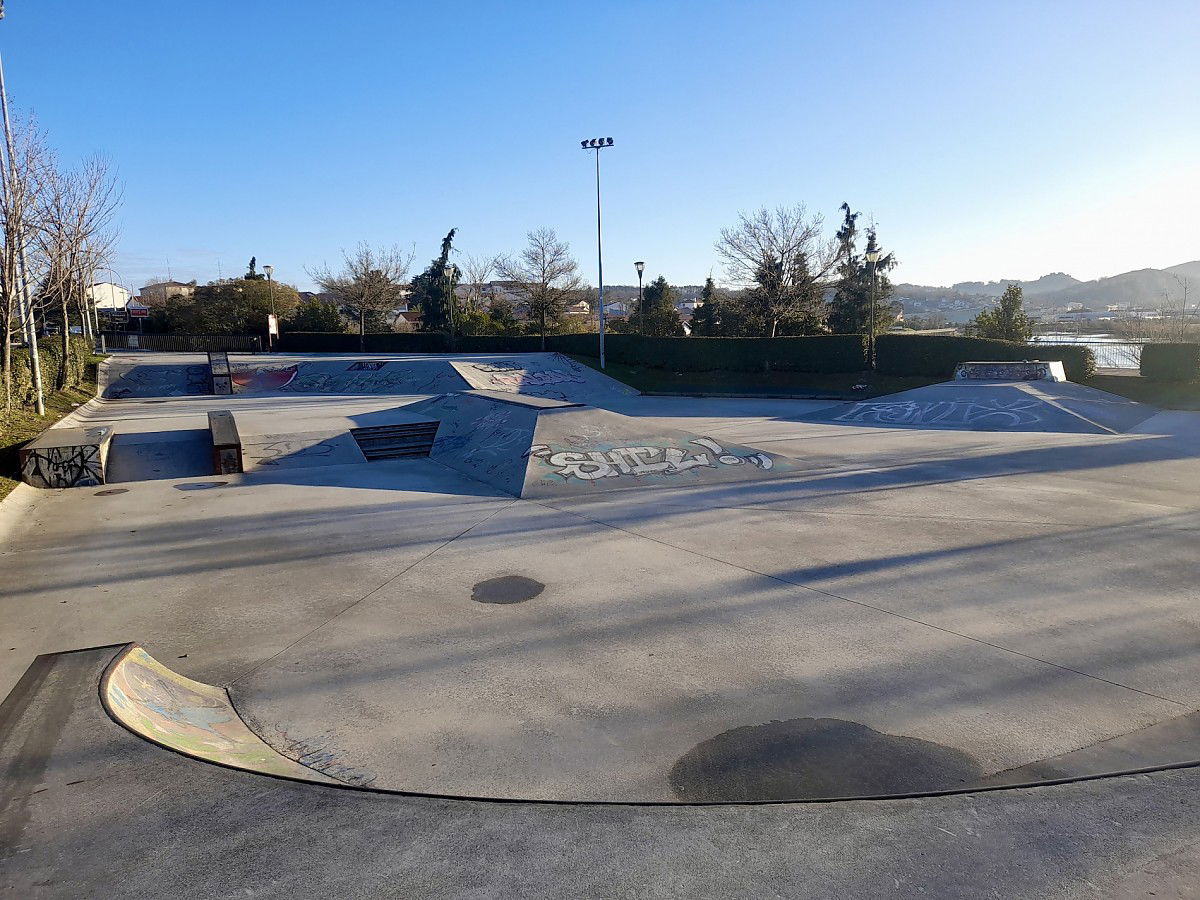 Irun skatepark is a large concrete park featuring a bowl and transition area with several street elements.