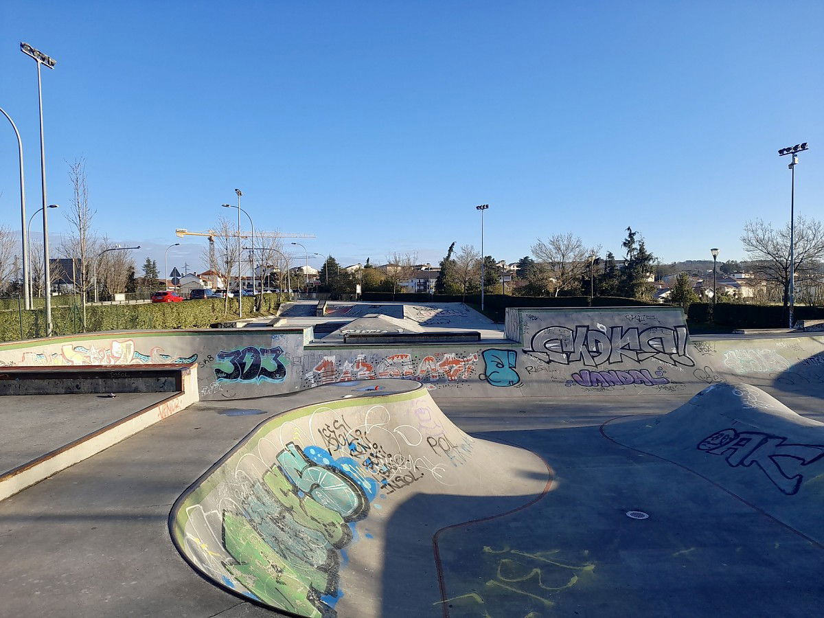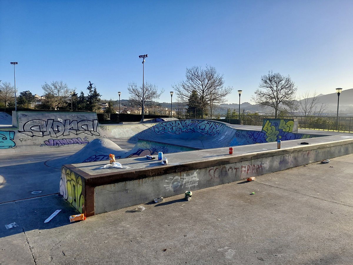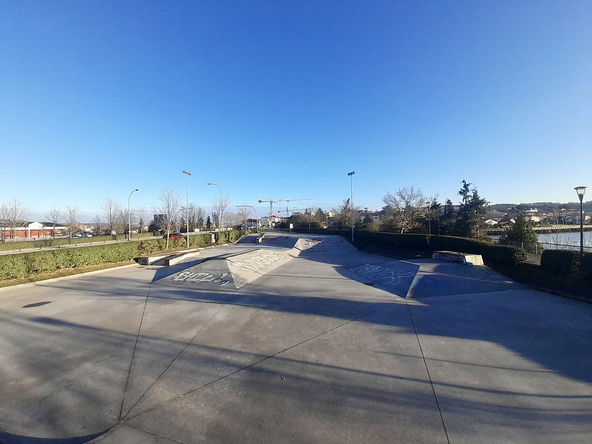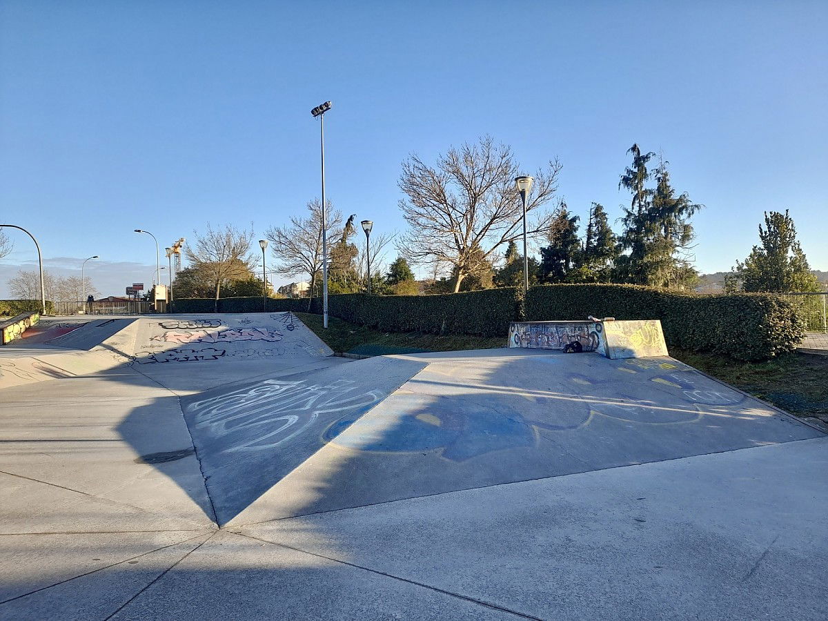 Irun skatepark is a large concrete park featuring a bowl and transition area with several street elements.