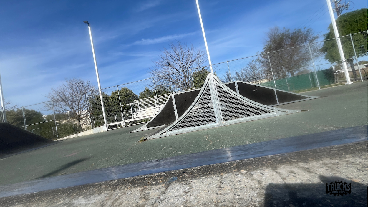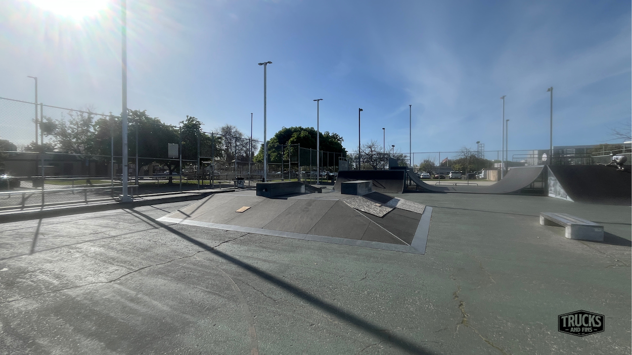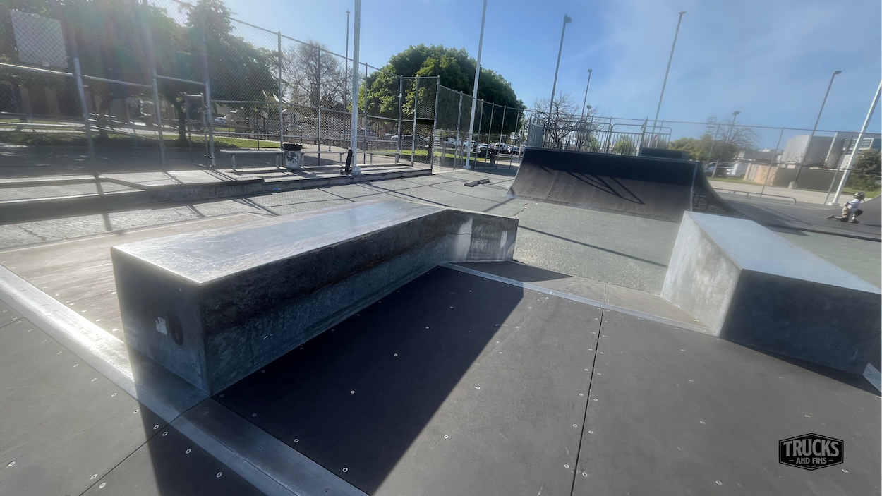 Kaiser skatepark is made up of a back and forth run with quarter pipes and flat banks on the sides of a funbox/spine/jumpbox. The skatepark also features a miniramp.