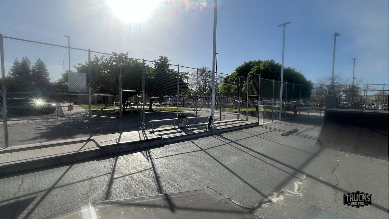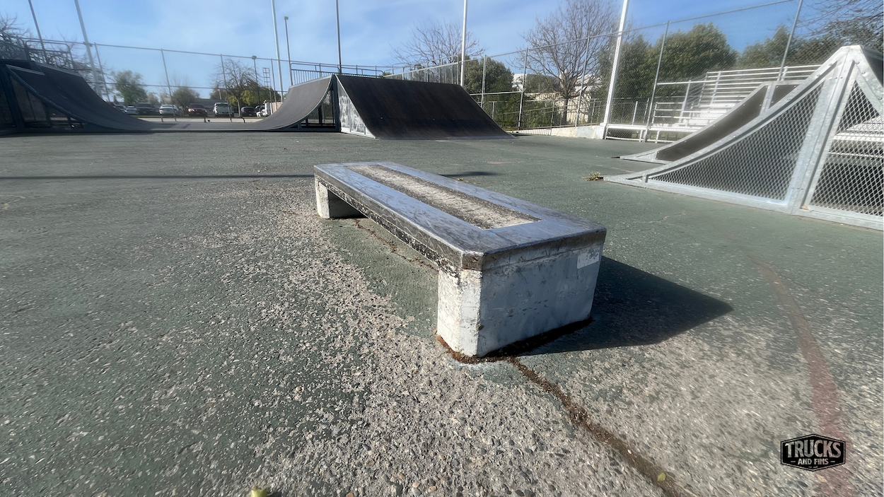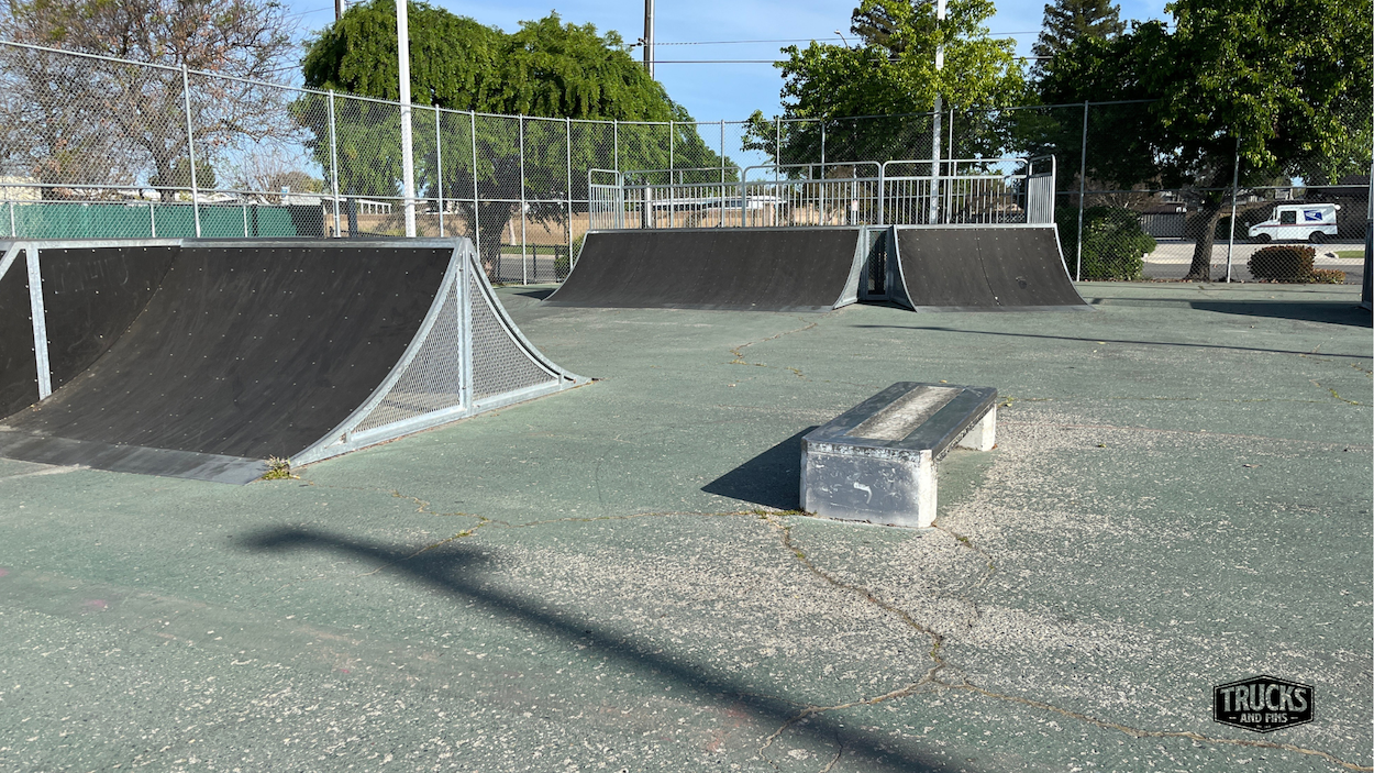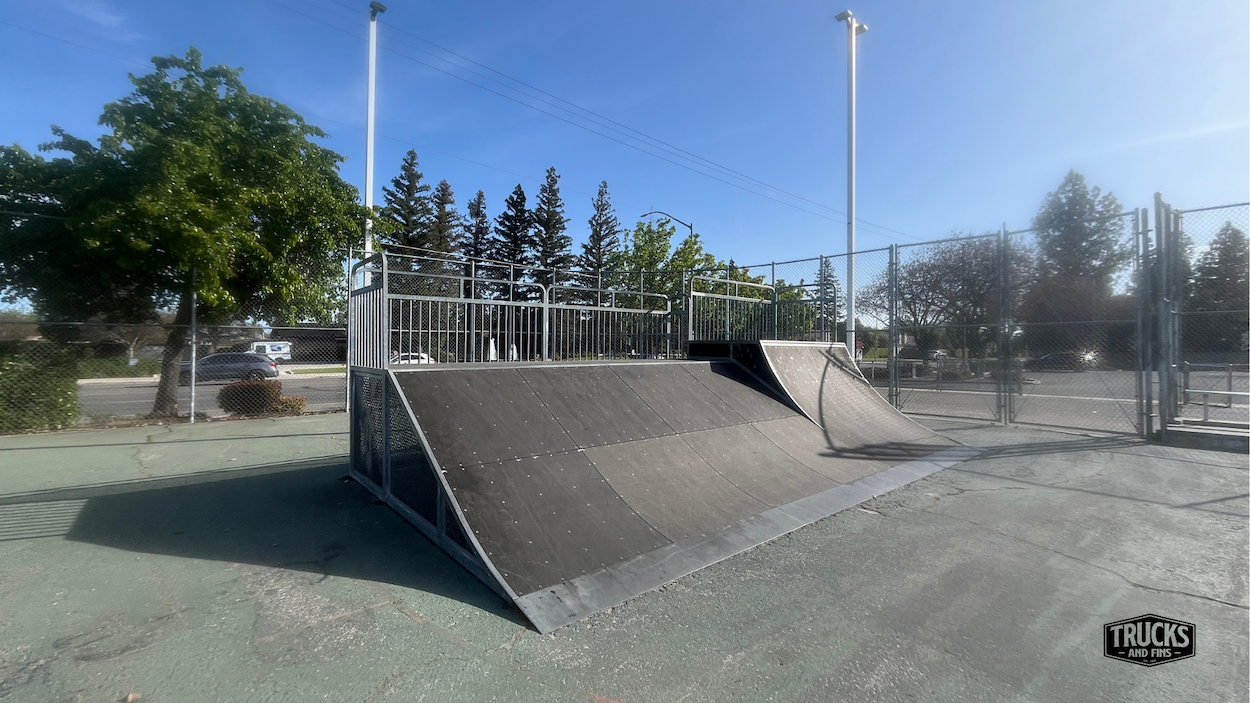 Kaiser skatepark is made up of a back and forth run with quarter pipes and flat banks on the sides of a funbox/spine/jumpbox. The skatepark also features a miniramp.