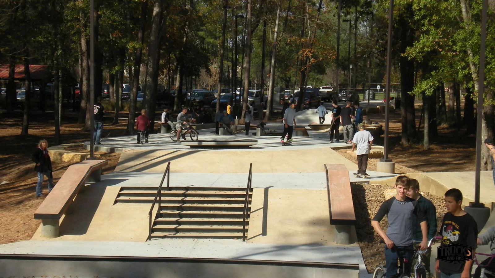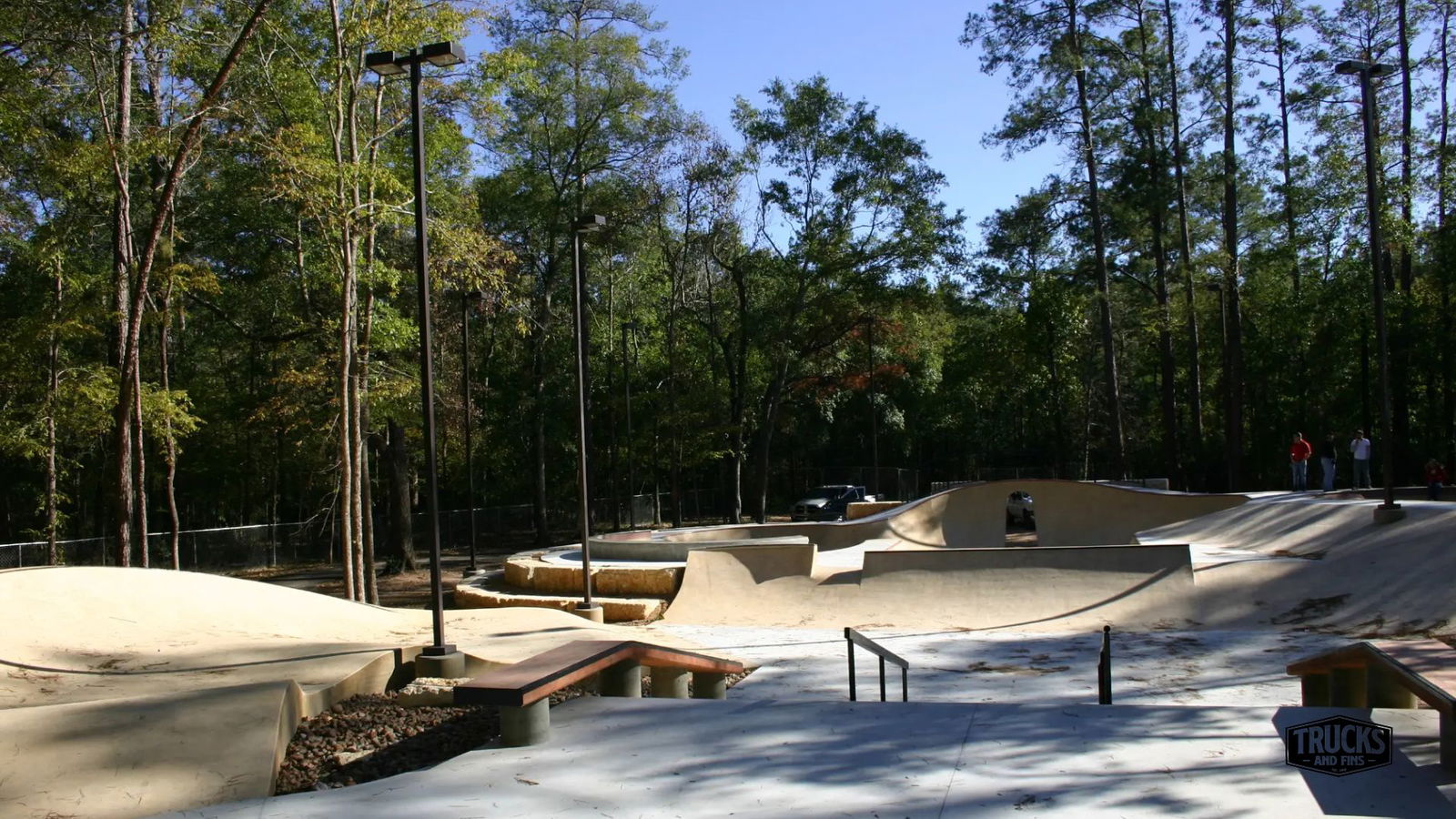 Kasmiersky park skatepark is a concrete skatepark featuring a bowl with stone coping, an open bowl and a plaza style street area. The Kasmiersky Wheeled Sports Plaza boasts a 15,000+ square foot skatepark nestled into the piney woods of Kasmiersky Park in Conroe, Texas. SPA Skateparks’ design-built the “wheeled sports plaza” in 2012. services of providing custom, site integrated public skateparks. Acting as general contractor, SPA Skateparks has partnered with design partner, New Line Skateparks, for this design-build skatepark project.
