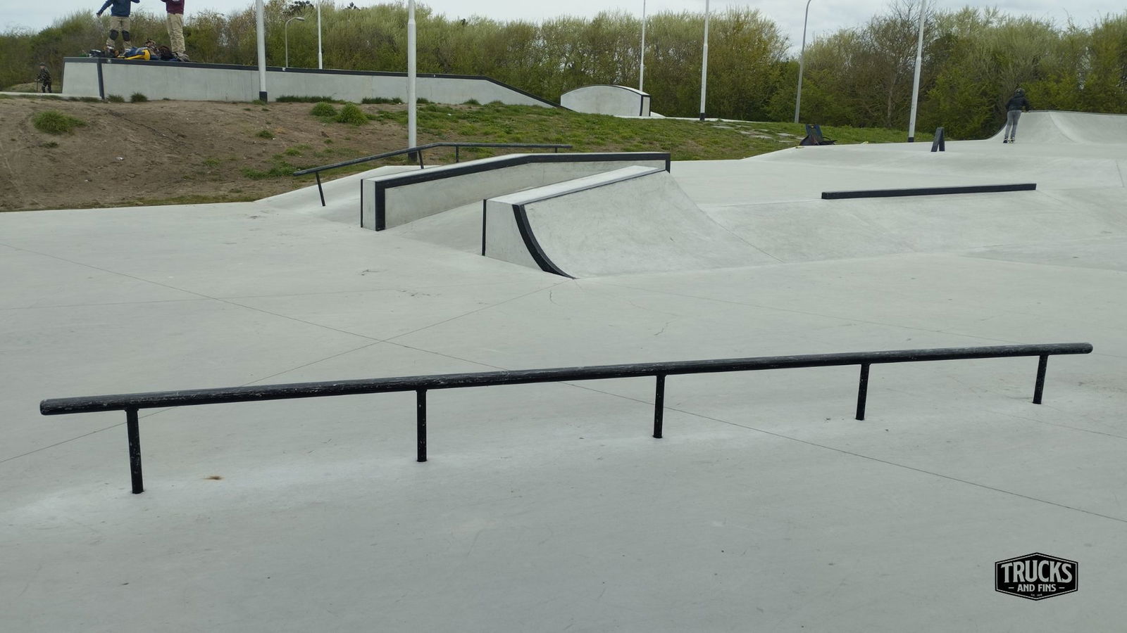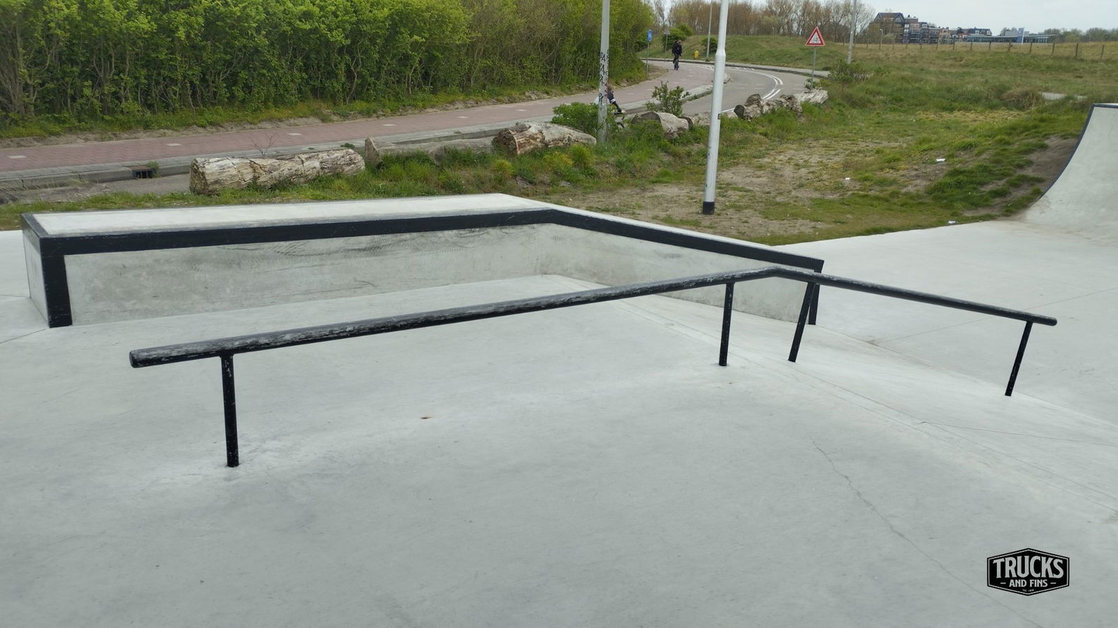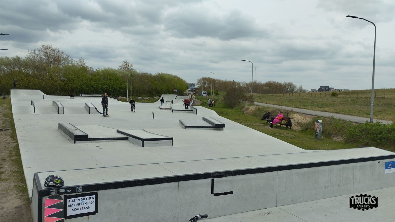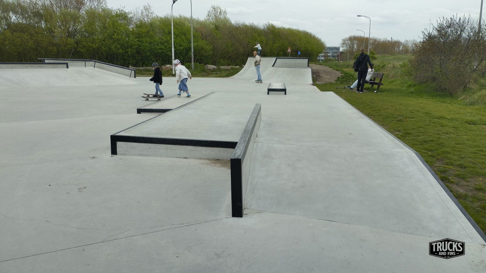 Katwijk skatepark is a large metal skatepark featuring a miniramp with spine, several quarters, banks, ledges, rails, funboxes and jumpboxes.
