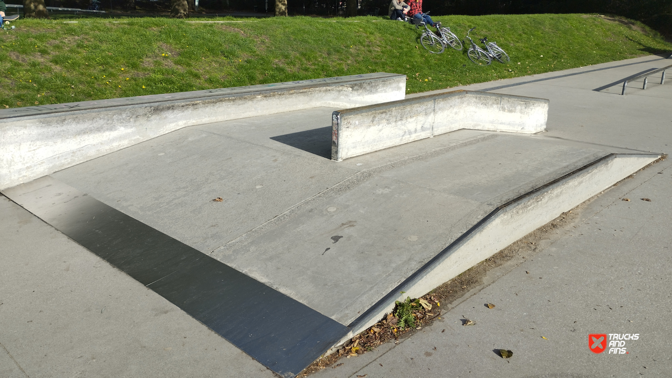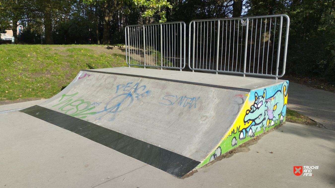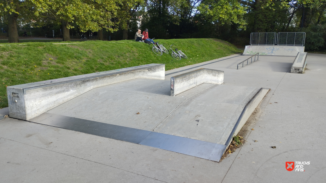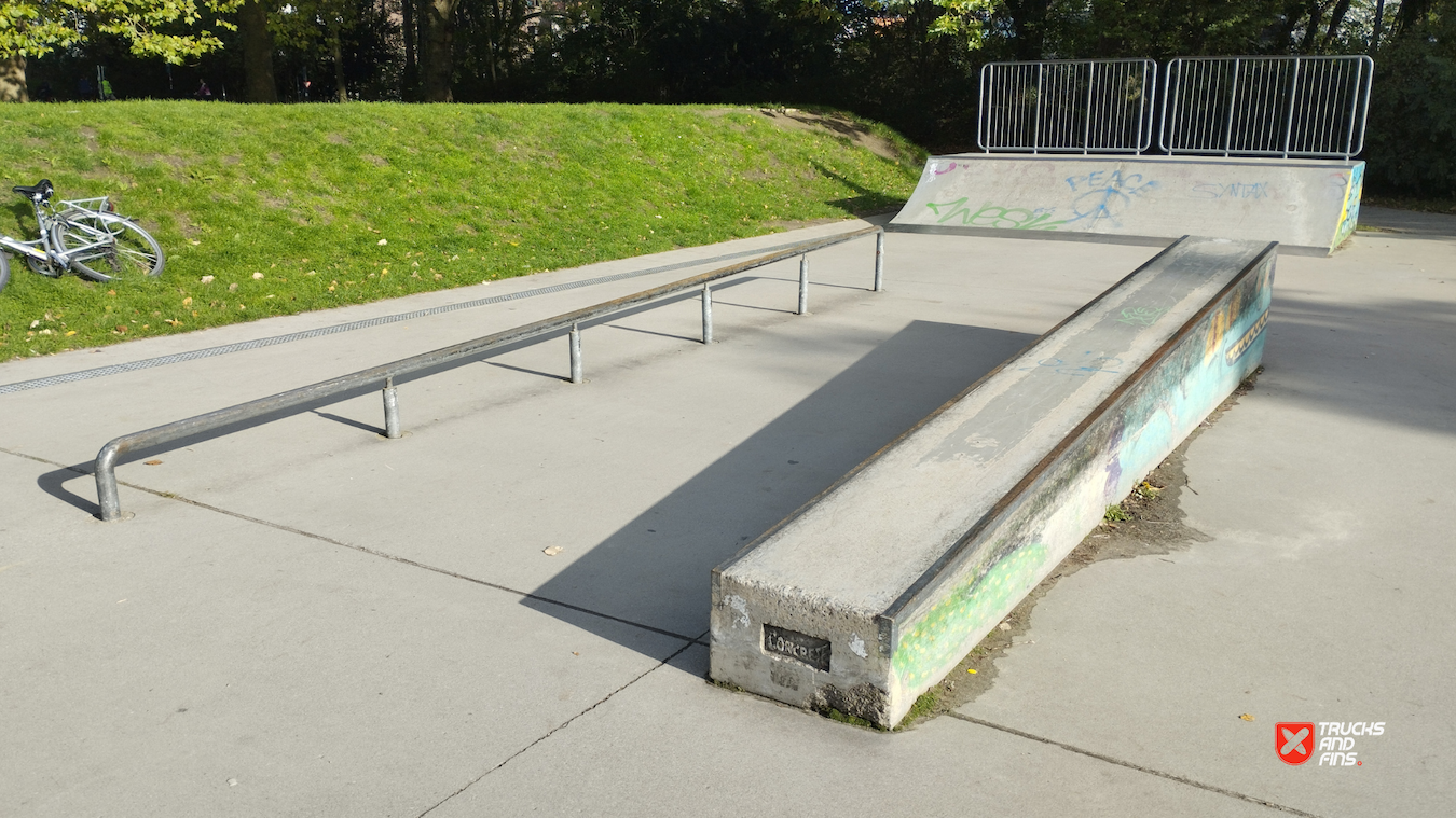 Keizerpark skatepark is made up of a back and forth run with a quarter pipe and flat bank on the sides of a funbox.