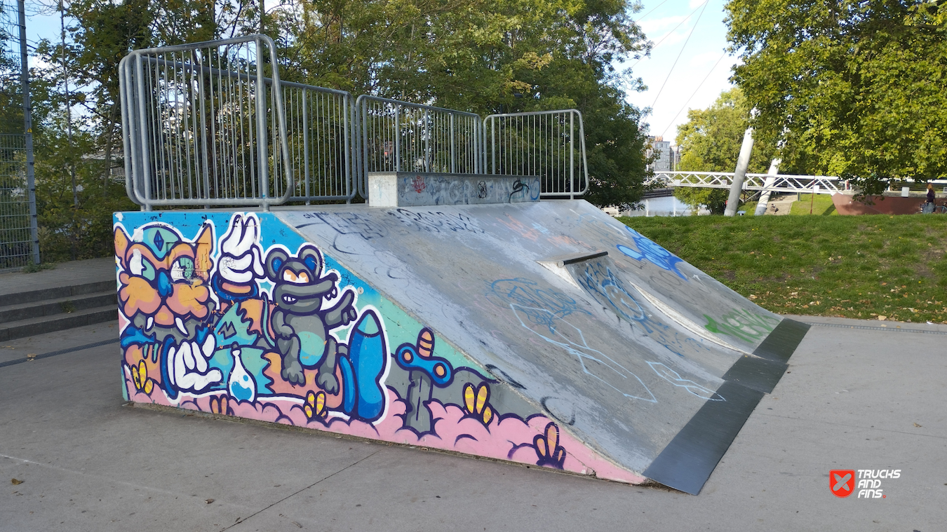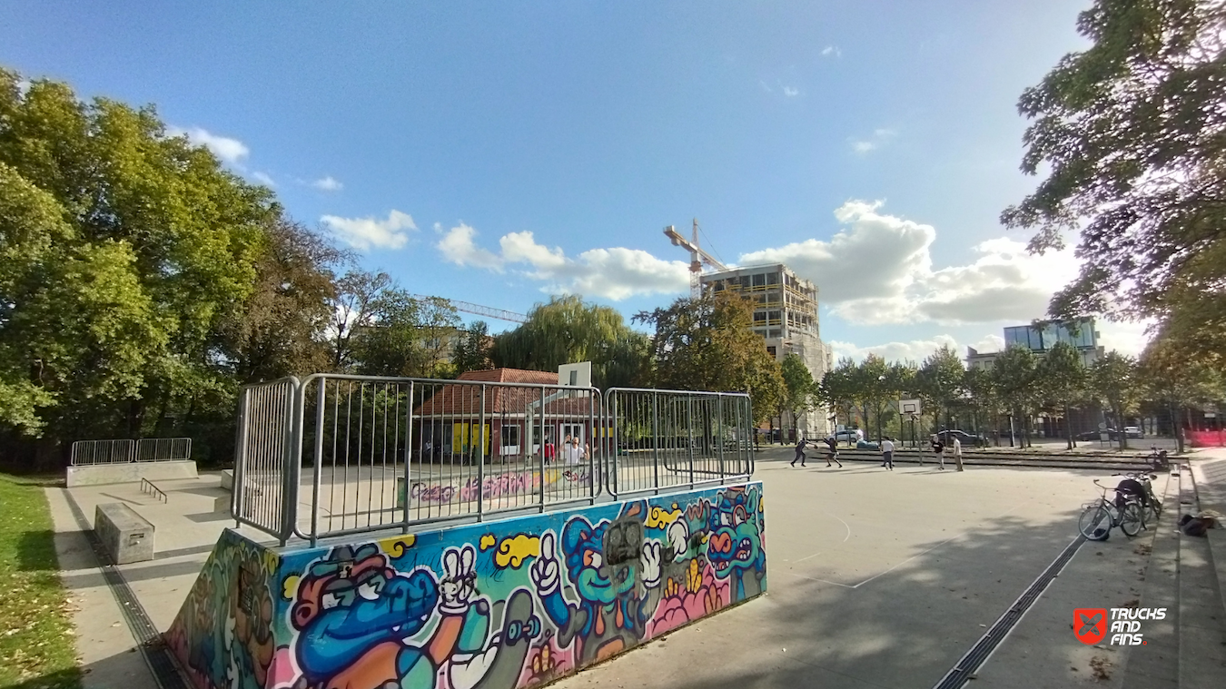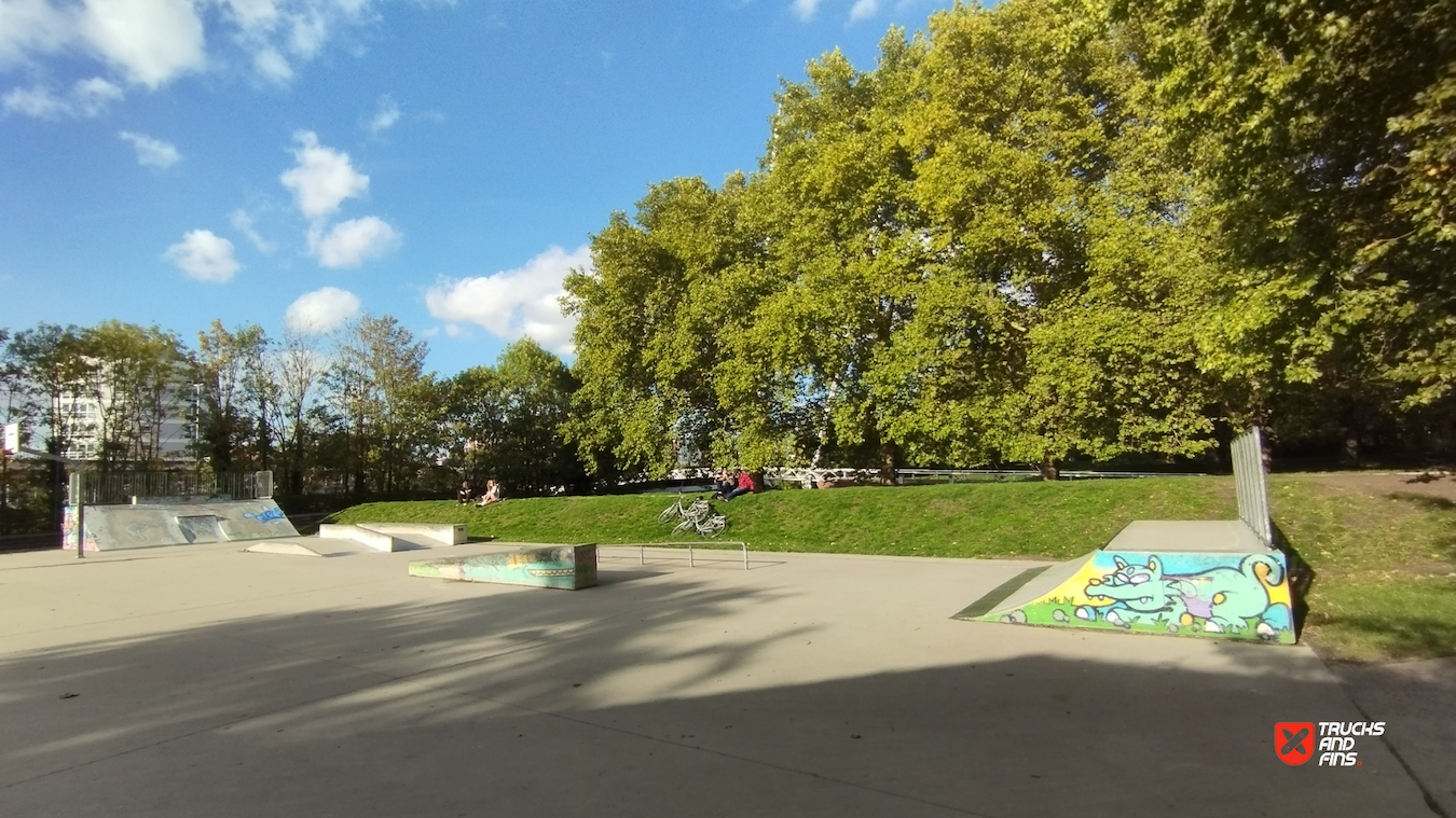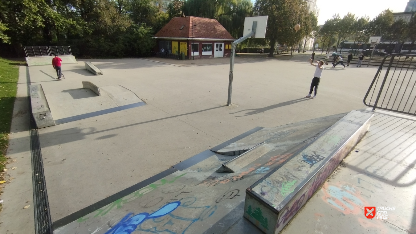 Keizerpark skatepark is made up of a back and forth run with a quarter pipe and flat bank on the sides of a funbox.