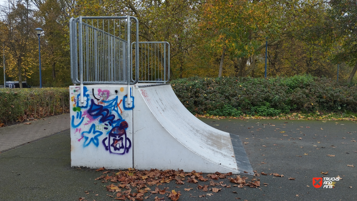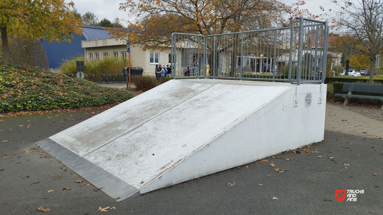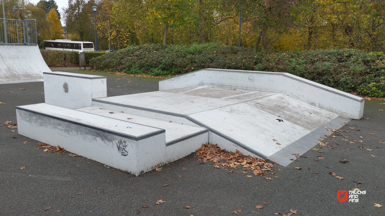 Kraainem skatepark is a concrete park made up of a back and forth run with a quarter pipe and flat bank on either sides of a funbox.