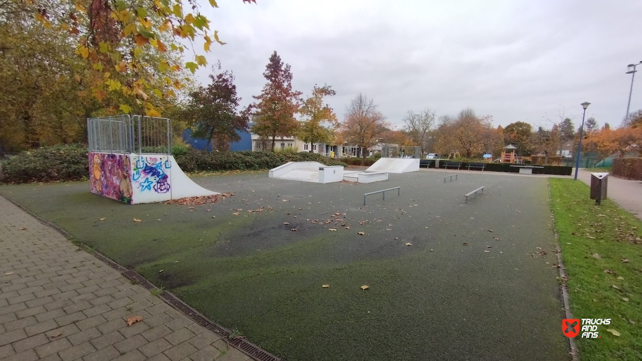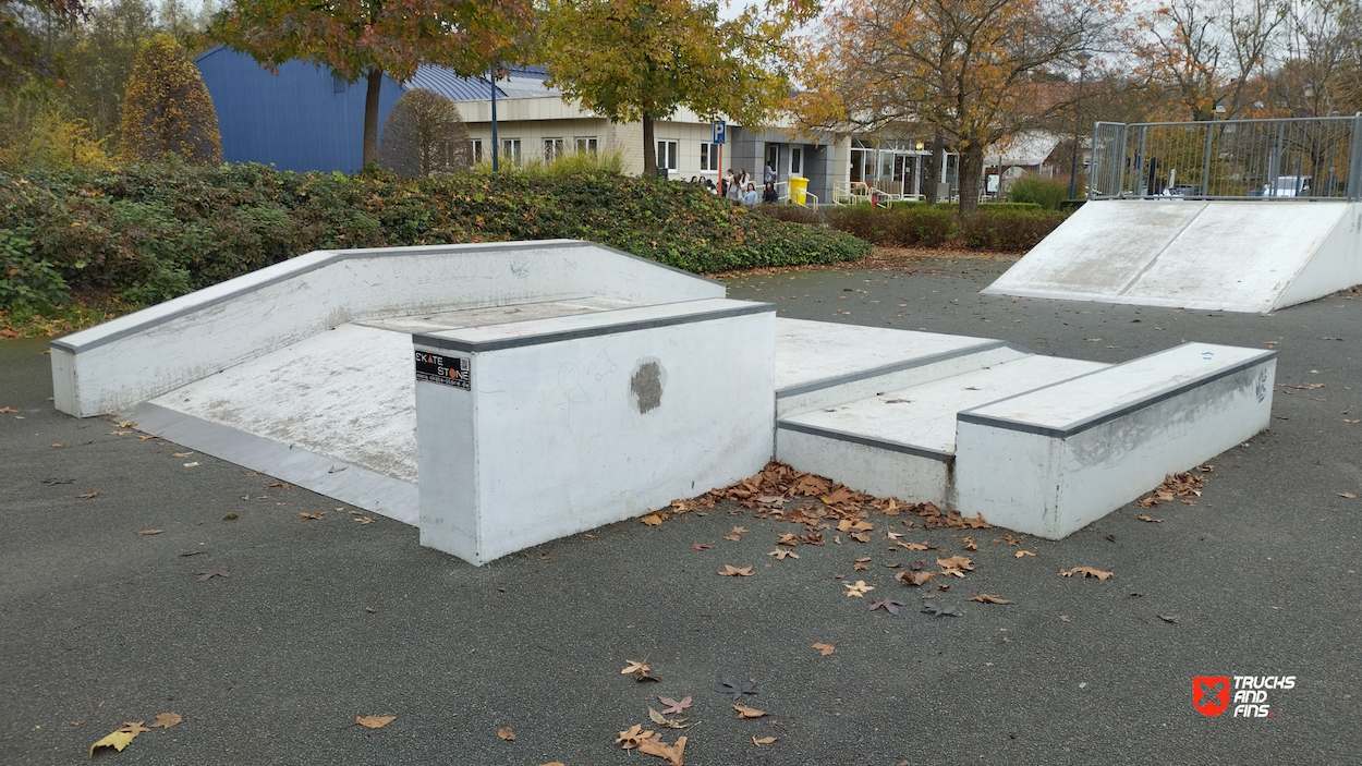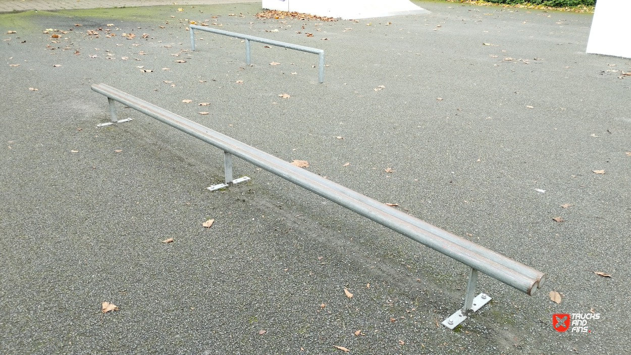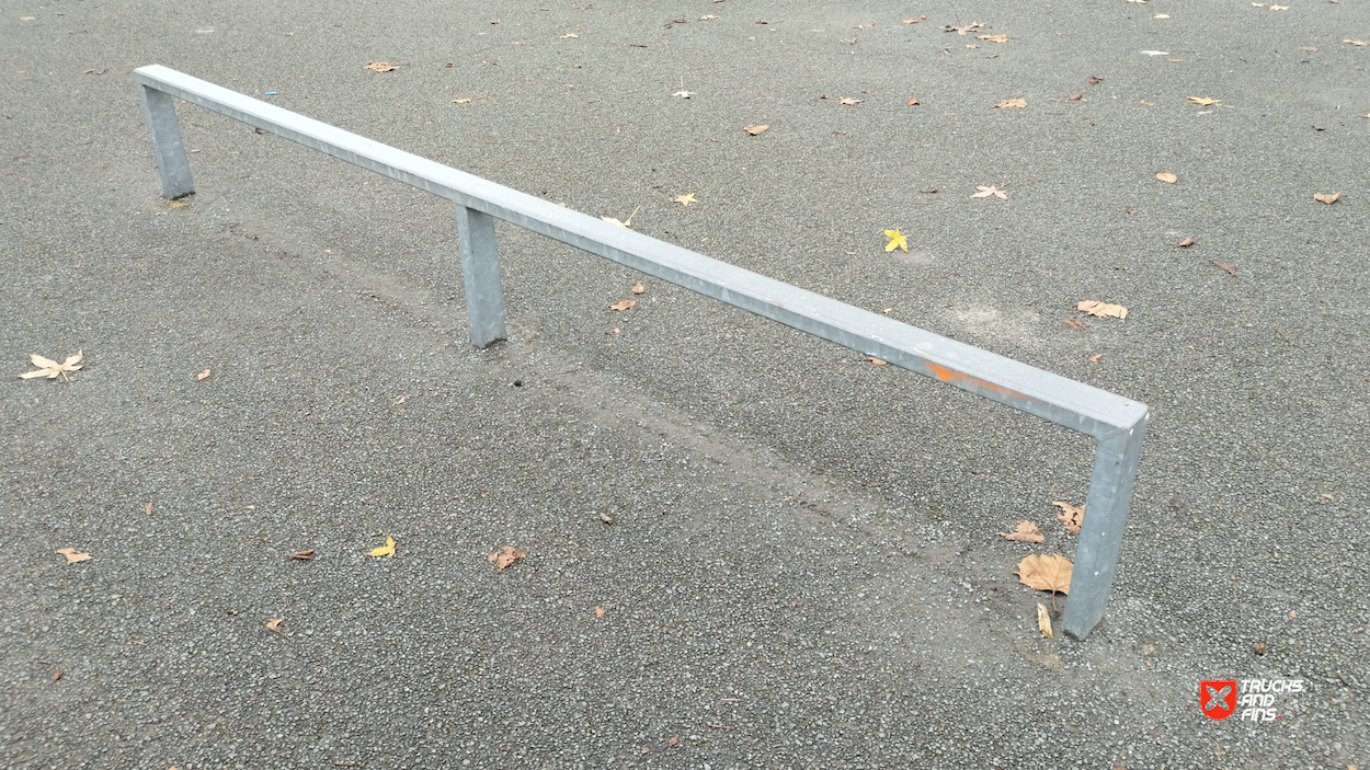 Kraainem skatepark is a concrete park made up of a back and forth run with a quarter pipe and flat bank on either sides of a funbox.