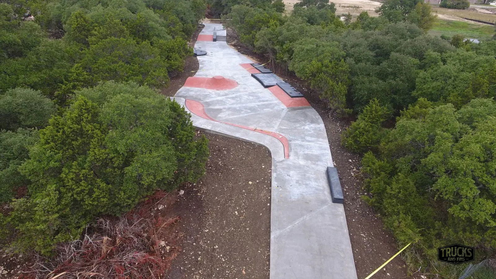 The Lakewood Skatepark is a technical, low-profile plaza-style facility designed with street skating in mind. Its long, winding layout weaves through mature juniper and oak trees, creating a natural, serene environment that blends seamlessly with the surrounding landscape. The park’s linear shape connects to pedestrian pathways at both ends, making it easily accessible and inviting for both skaters and parkgoers.