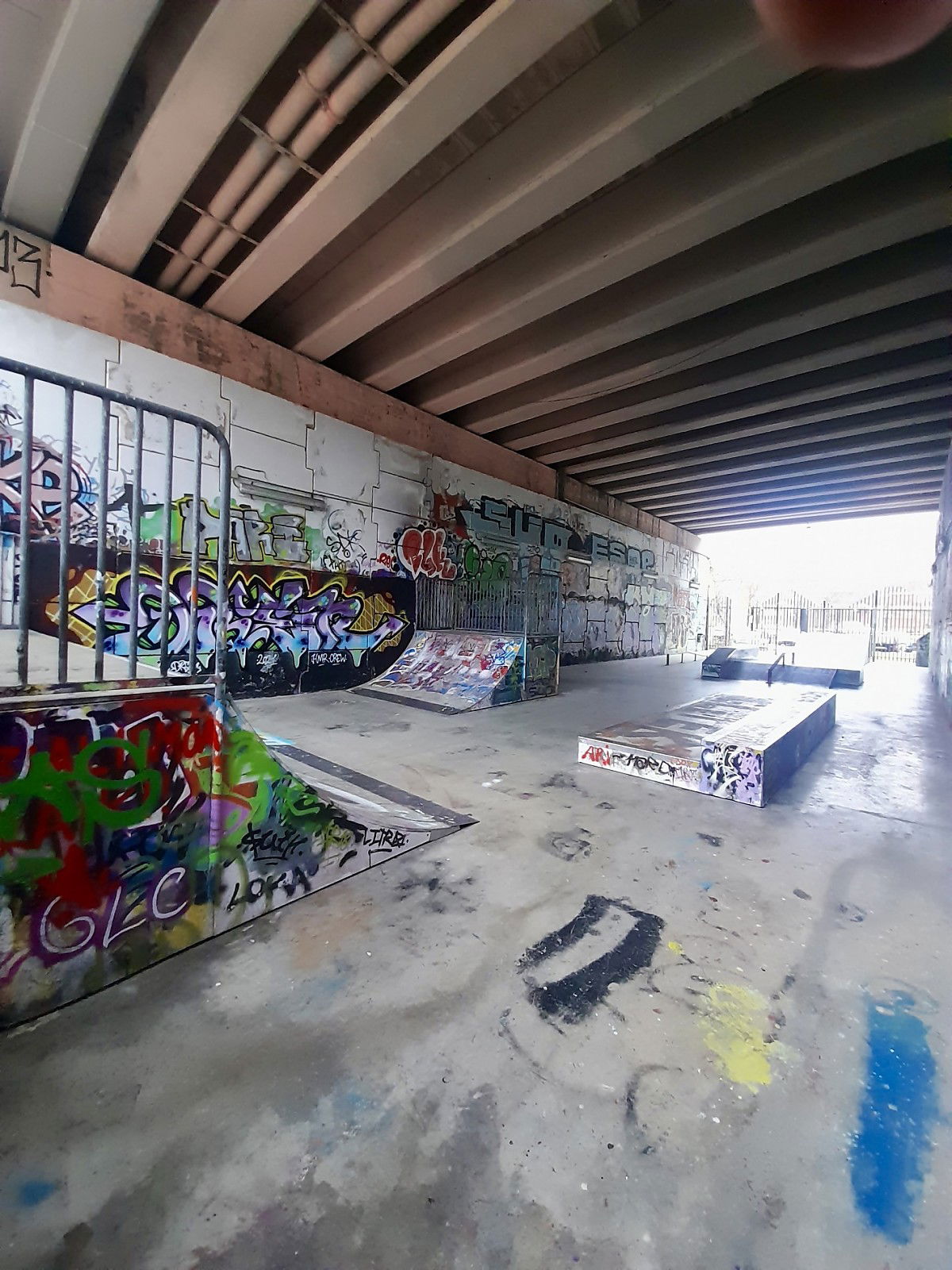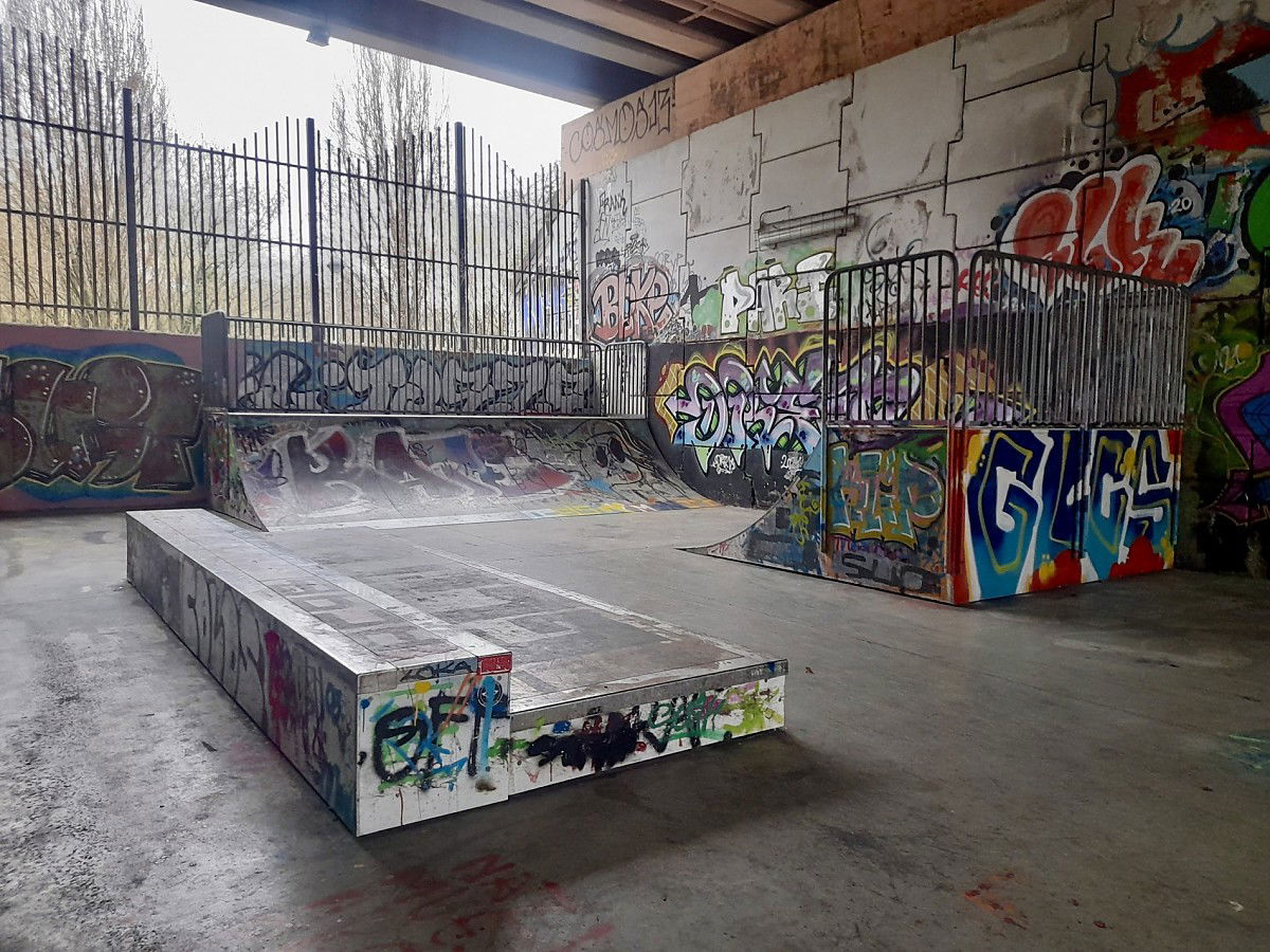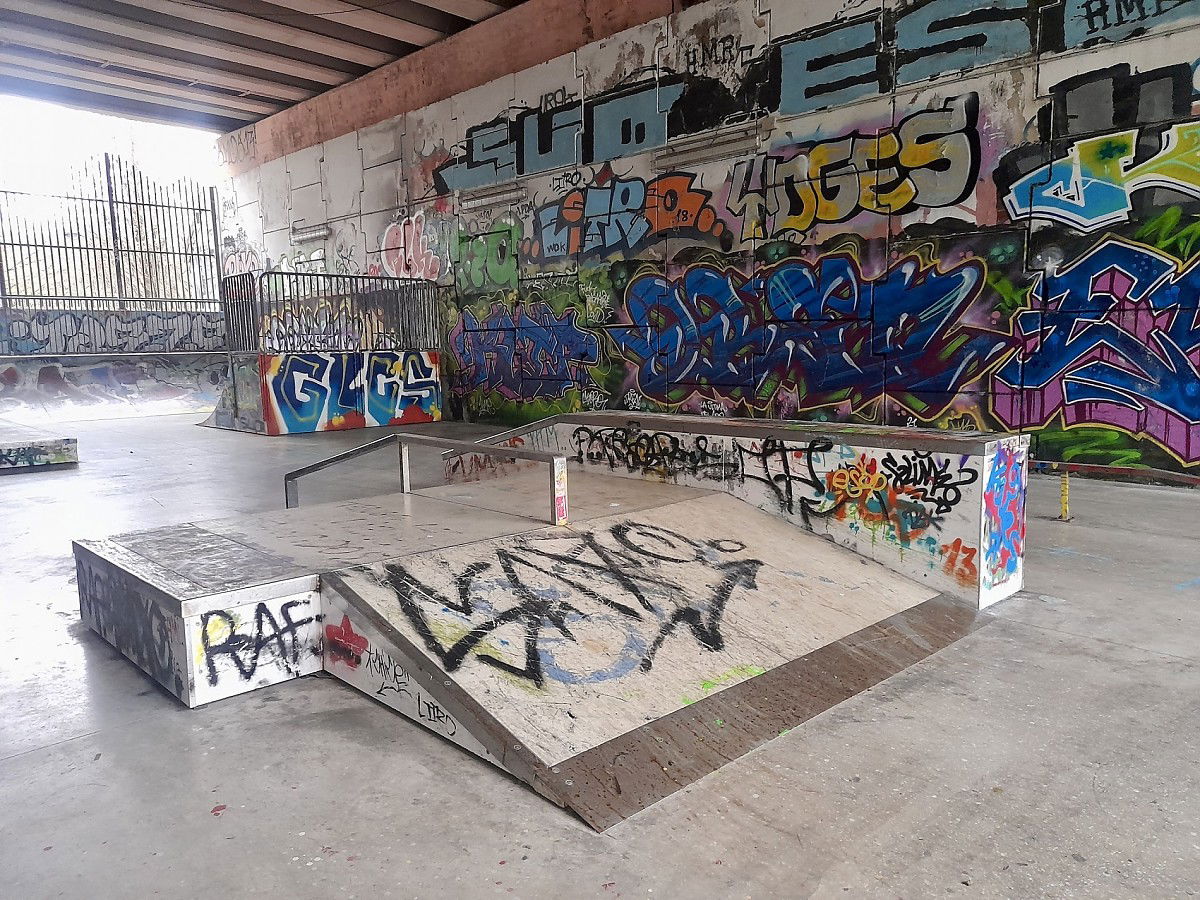 Larratxo skatepark is a concrete park located under a bridge overpass. The skatepark is made up of a back and forth run with a quarter pipe and bank on the sides of a funbox. The skatepark also features a miniramp.