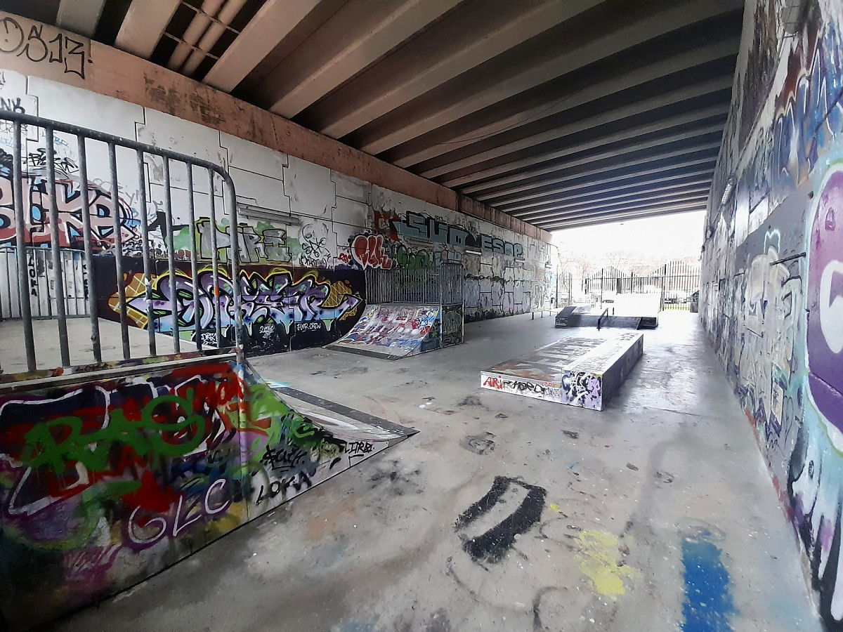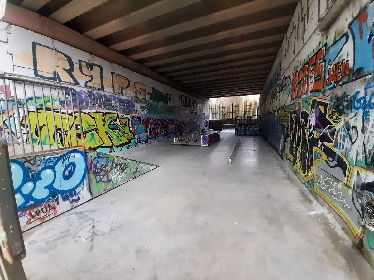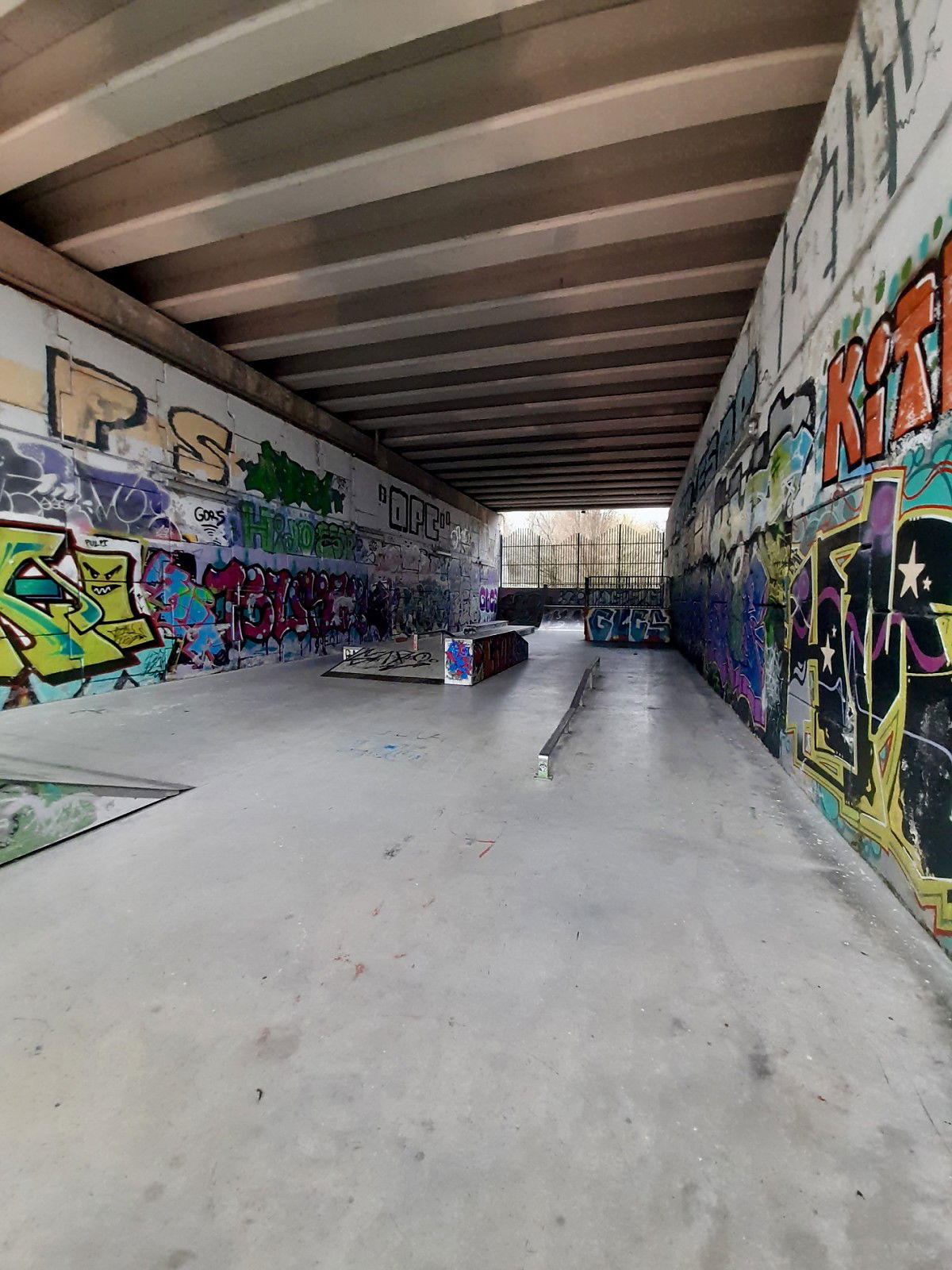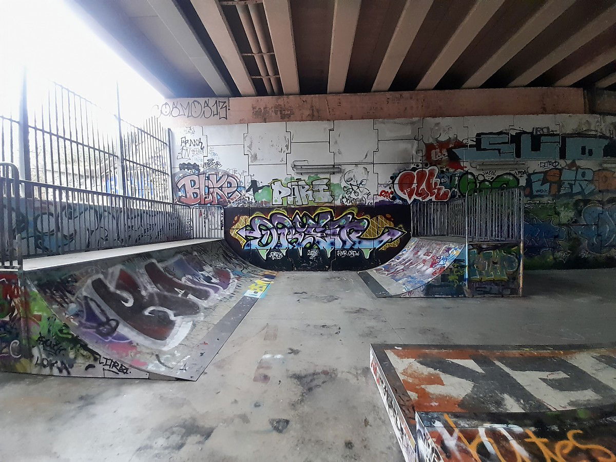 Larratxo skatepark is a concrete park located under a bridge overpass. The skatepark is made up of a back and forth run with a quarter pipe and bank on the sides of a funbox. The skatepark also features a miniramp.