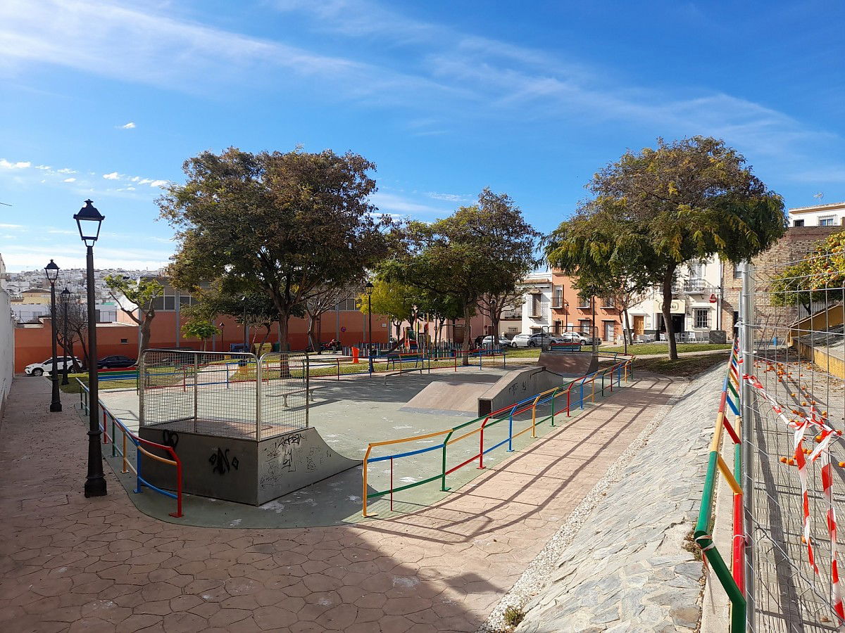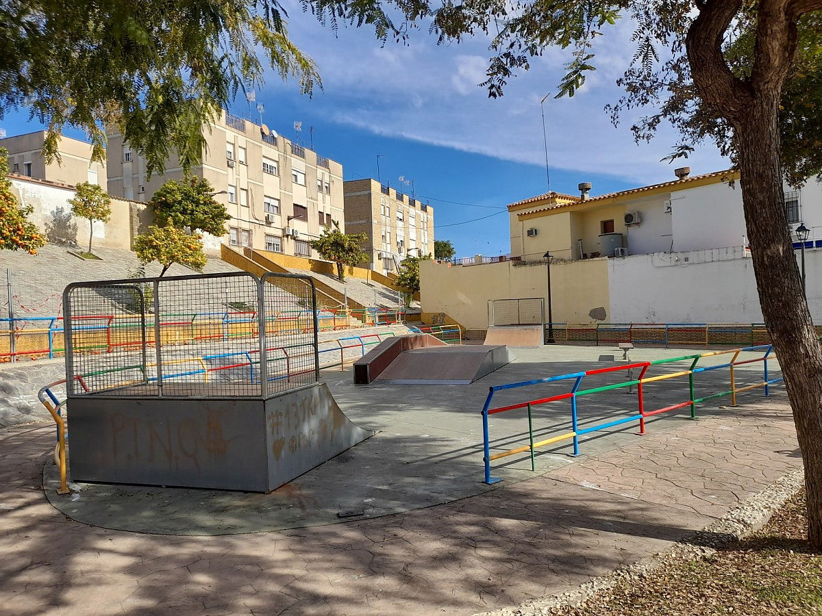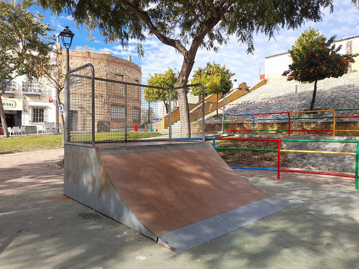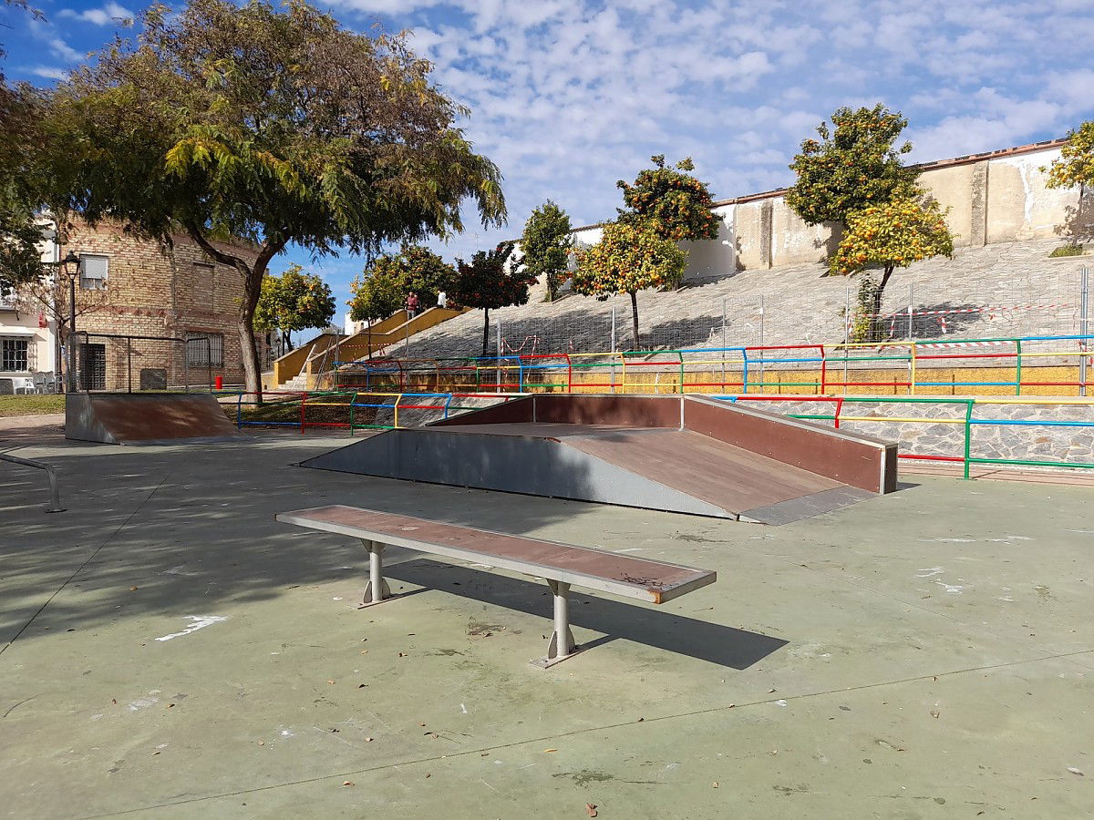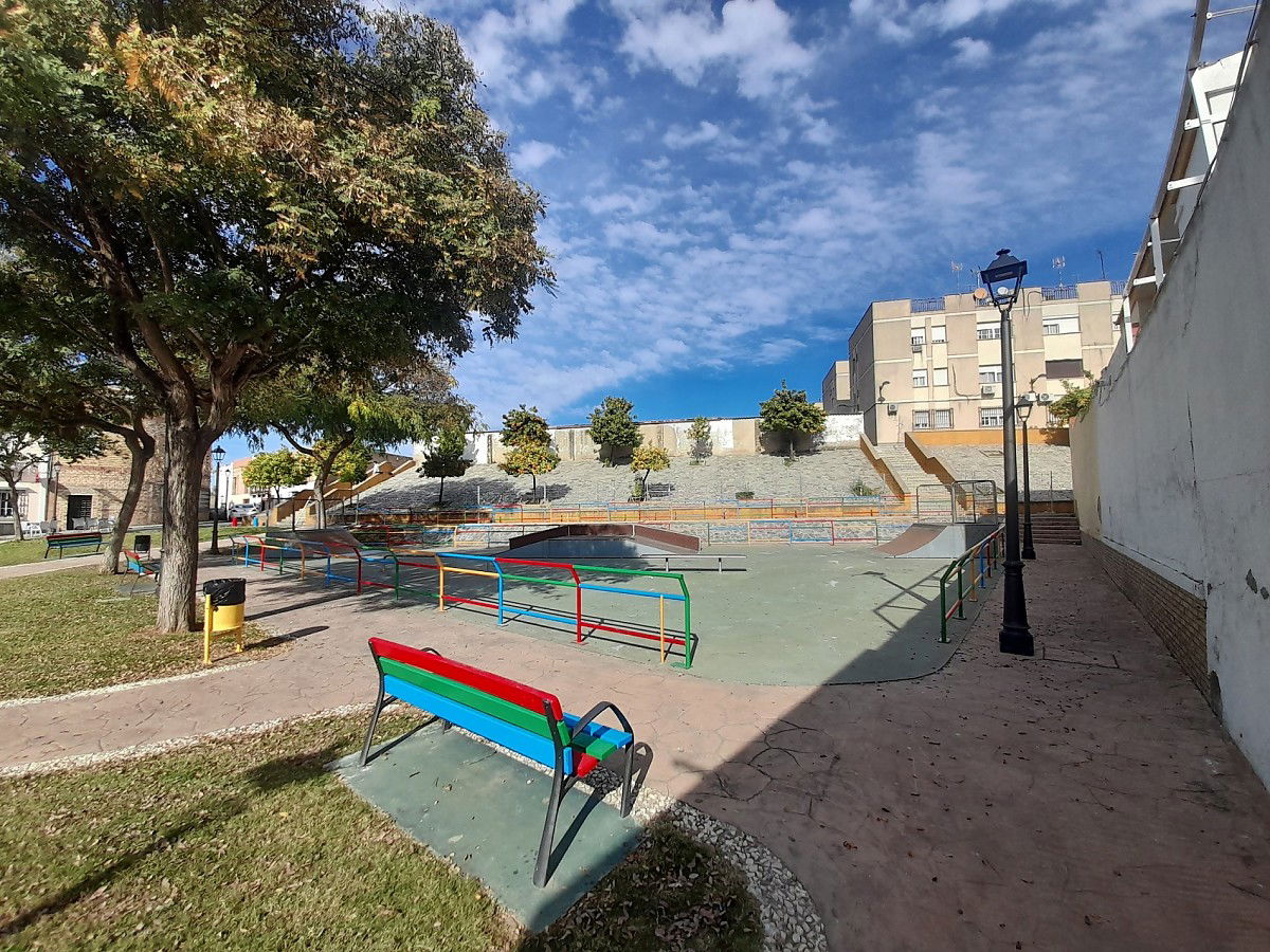 Las Cabezas de San Juan skatepark is made up of a back and forth run with a quarter pipe and bank on the sides of a funbox.
