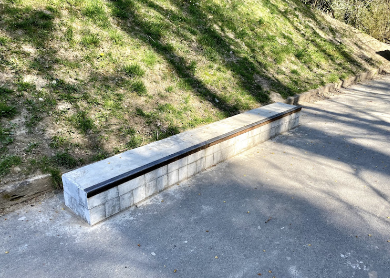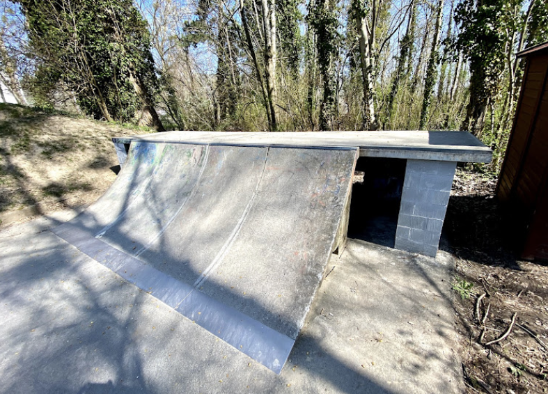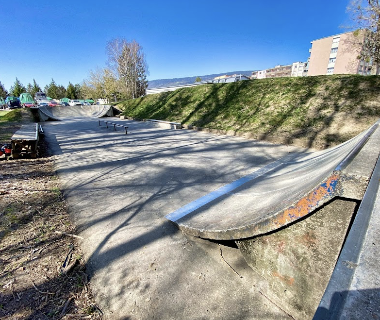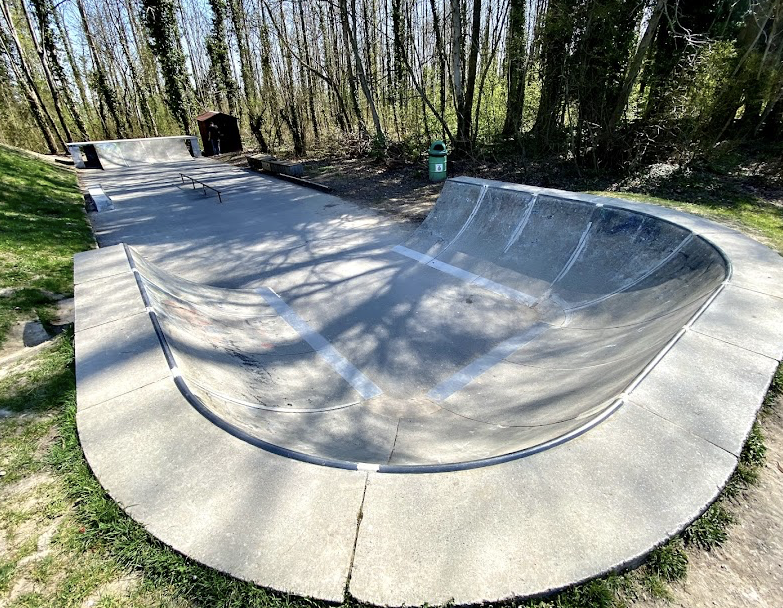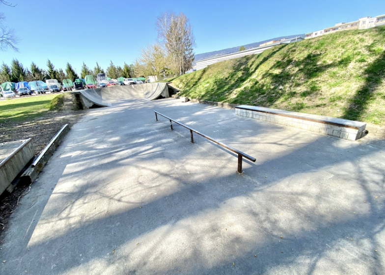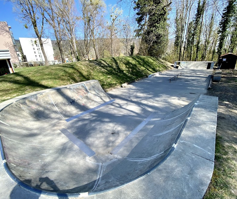 Le Landeron skatepark is a concrete park featuring an open bowl and several basic skate obstacles.