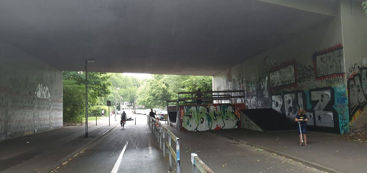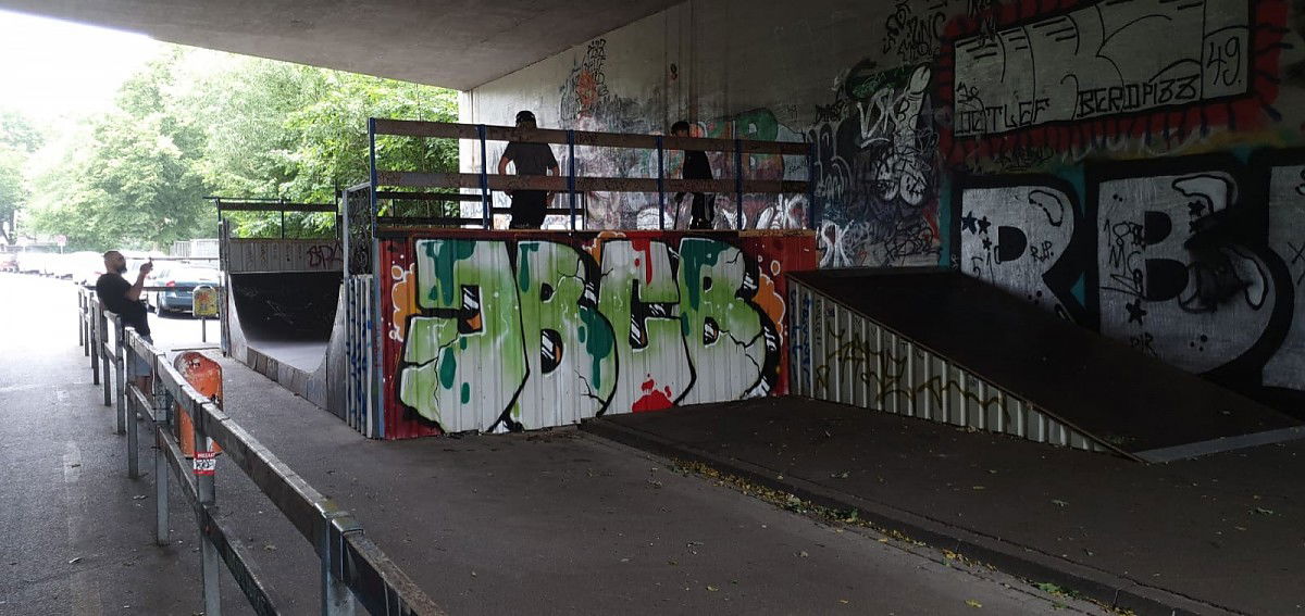 The Liepmannstraße skatepark is a wooden skatepark featuring a miniramp. The miniramp is located under the B6 bridge.