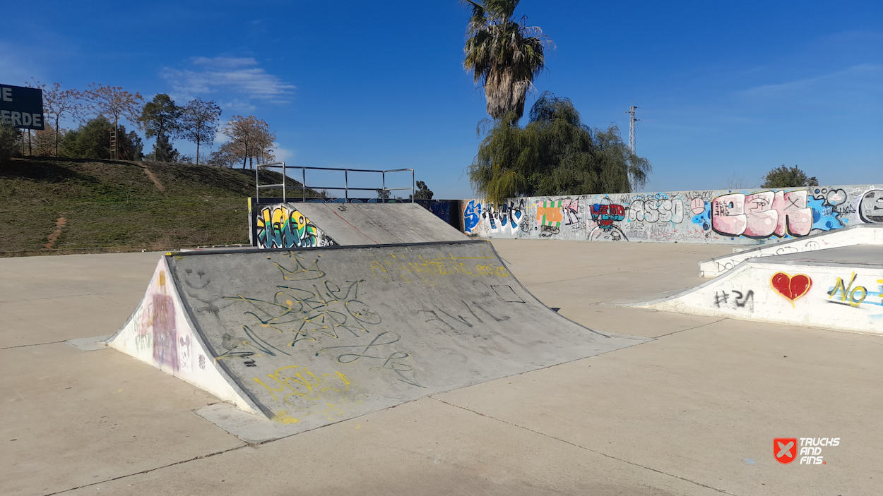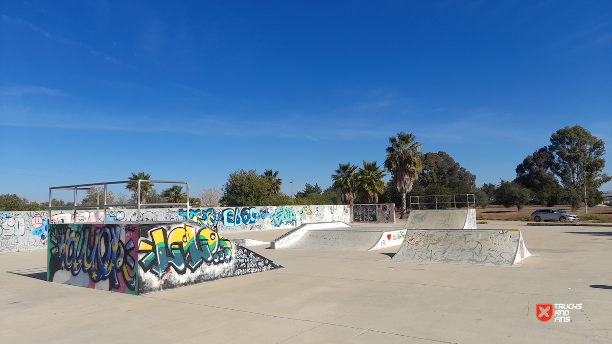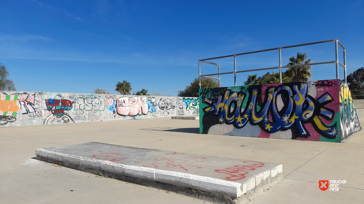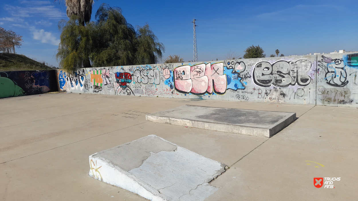 Los Palacios y Villafranca skatepark is made up of a back and forth run with a quarter pipe and bank on the sides of a funbox. The skatepark also features several other basic skateboarding obstacles.