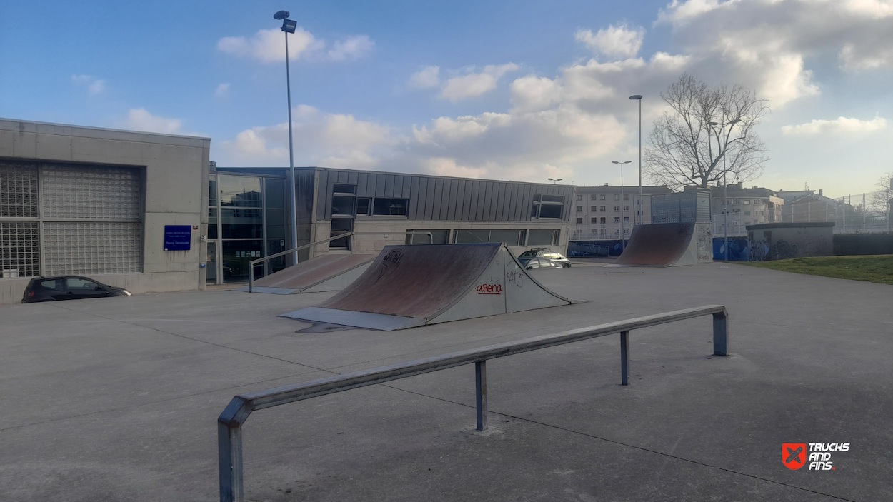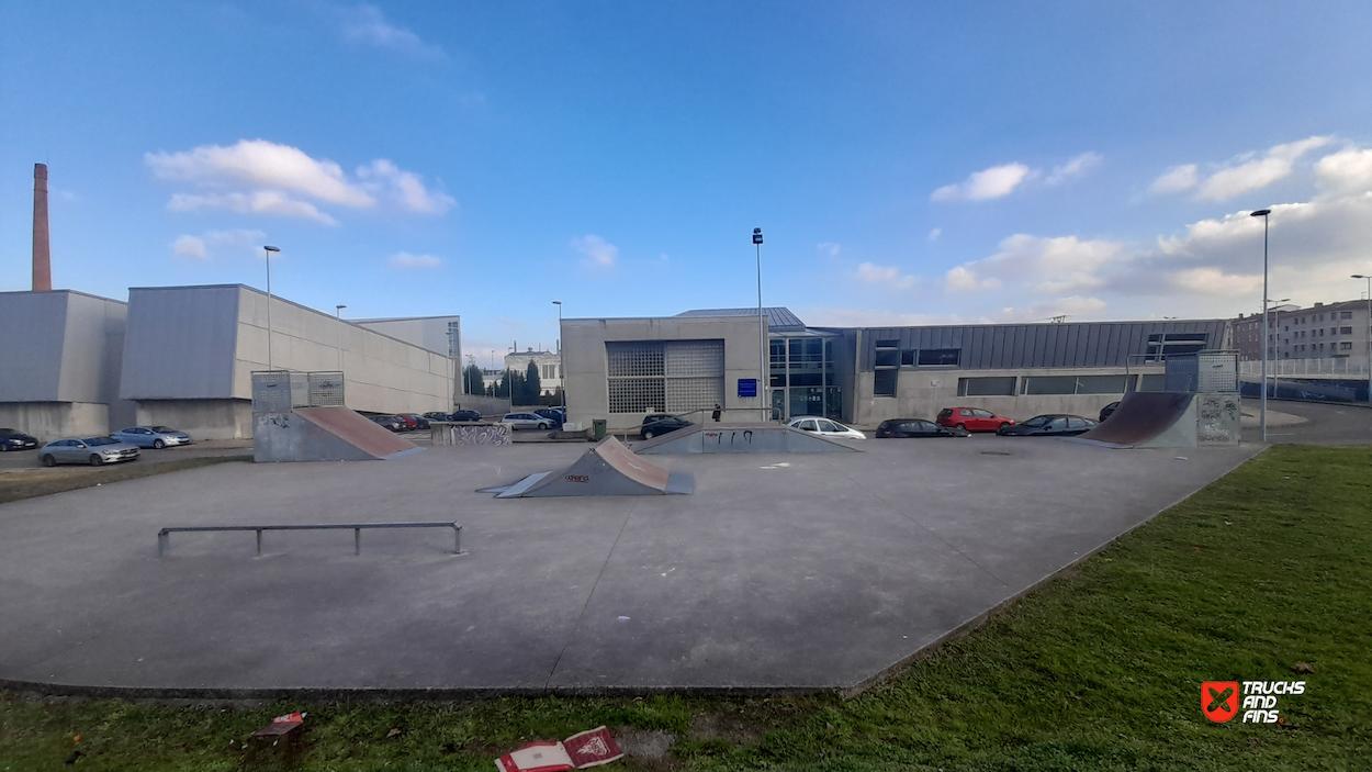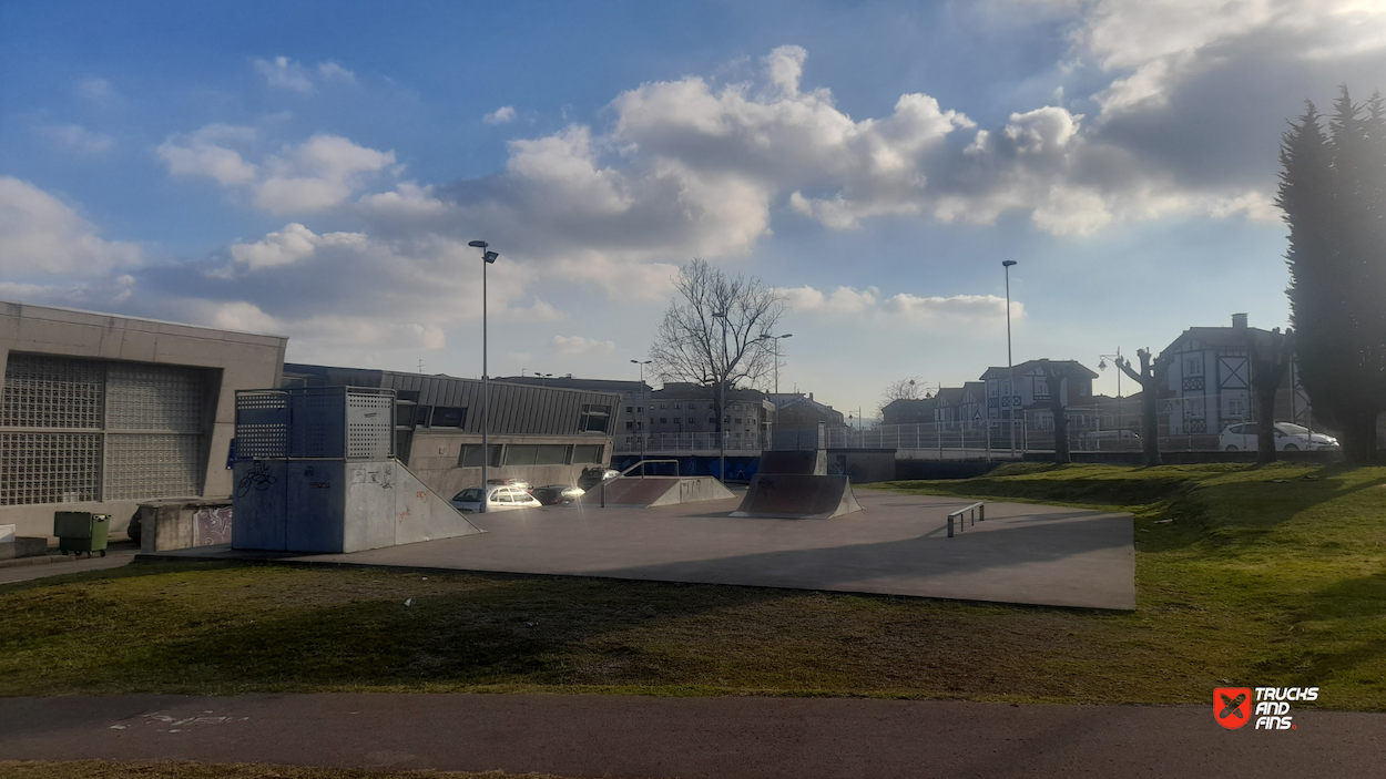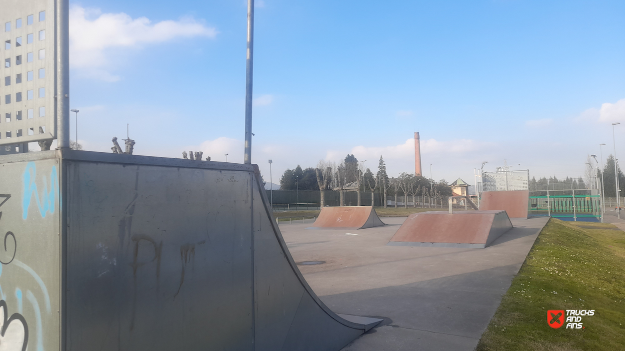 Lugones skatepark is made up of a back and forth run with a quarter pipe and bank on the sides of a funbox.