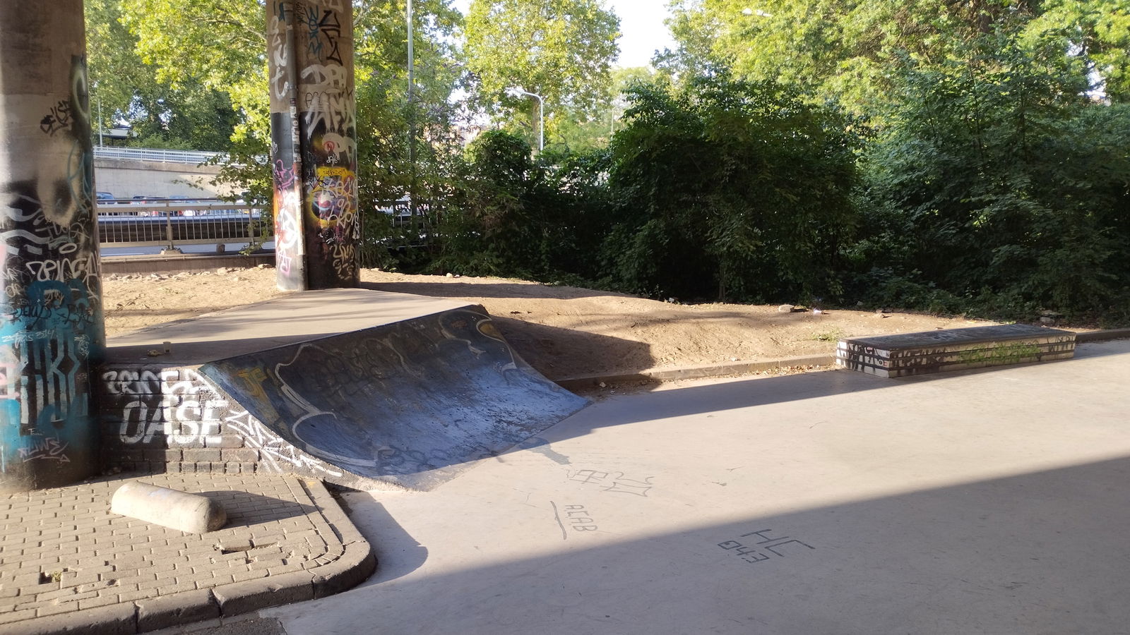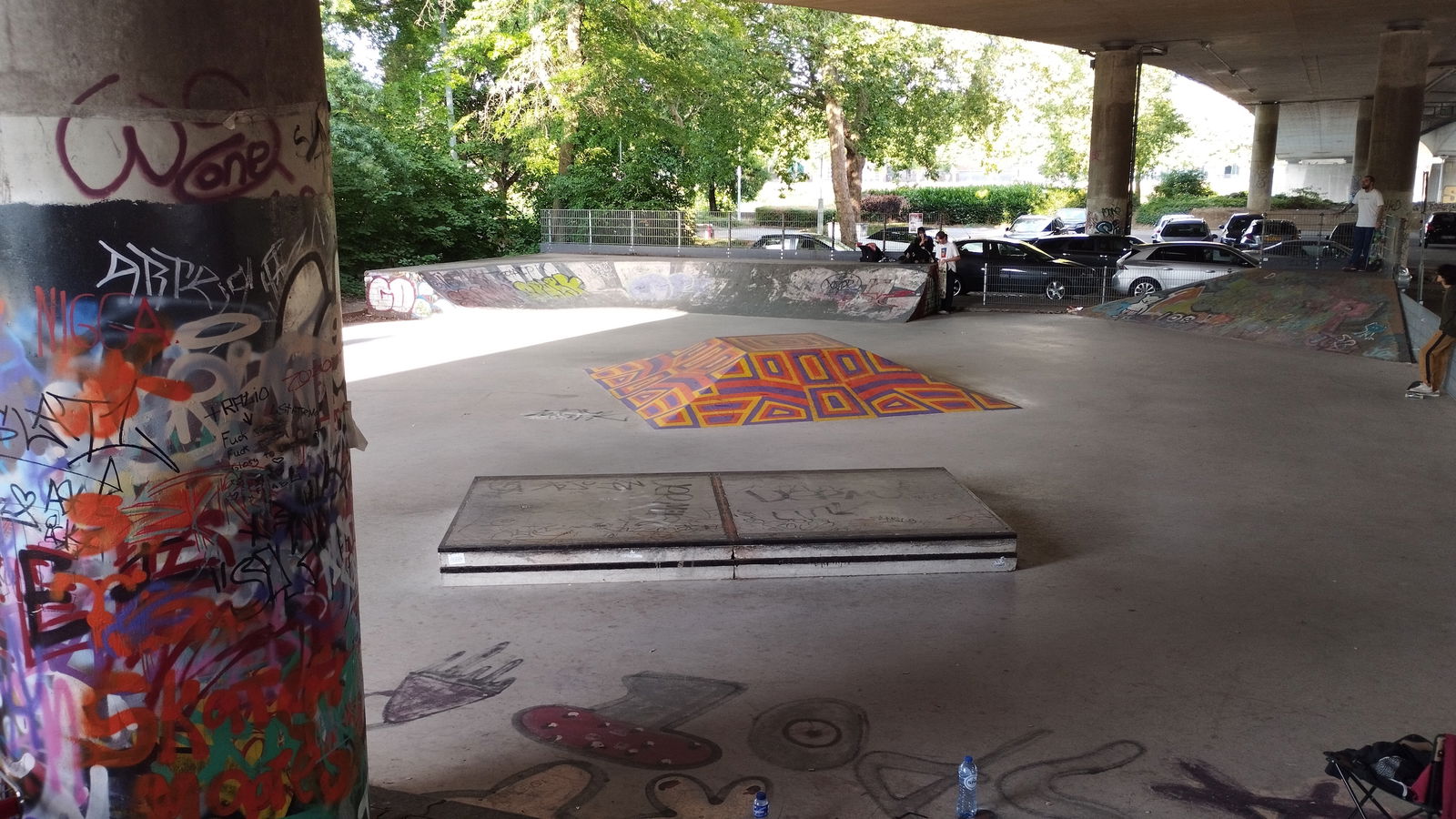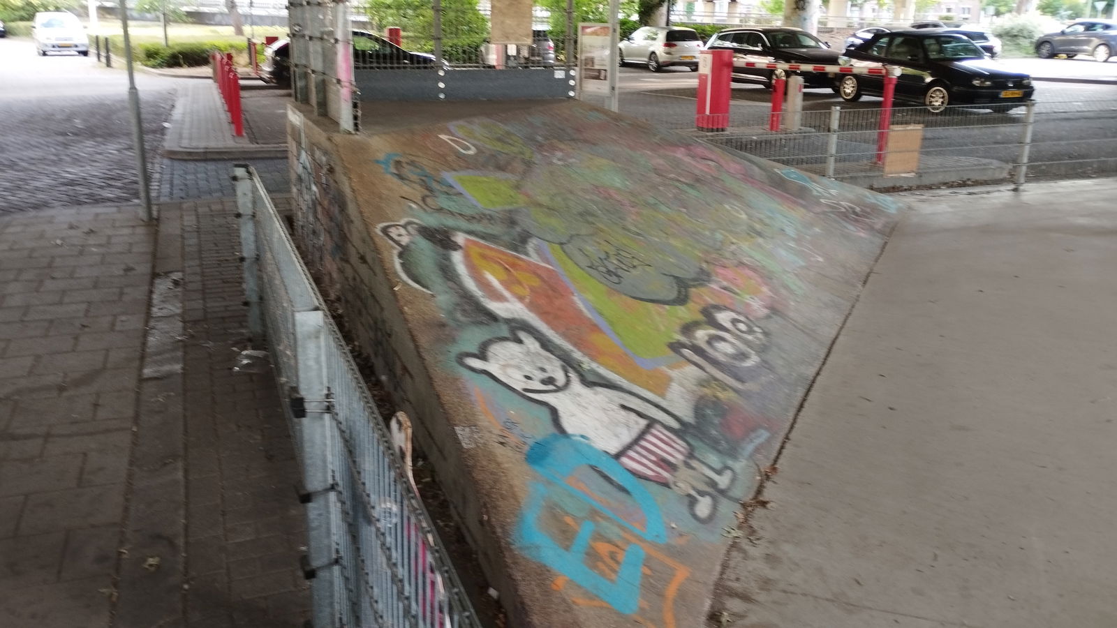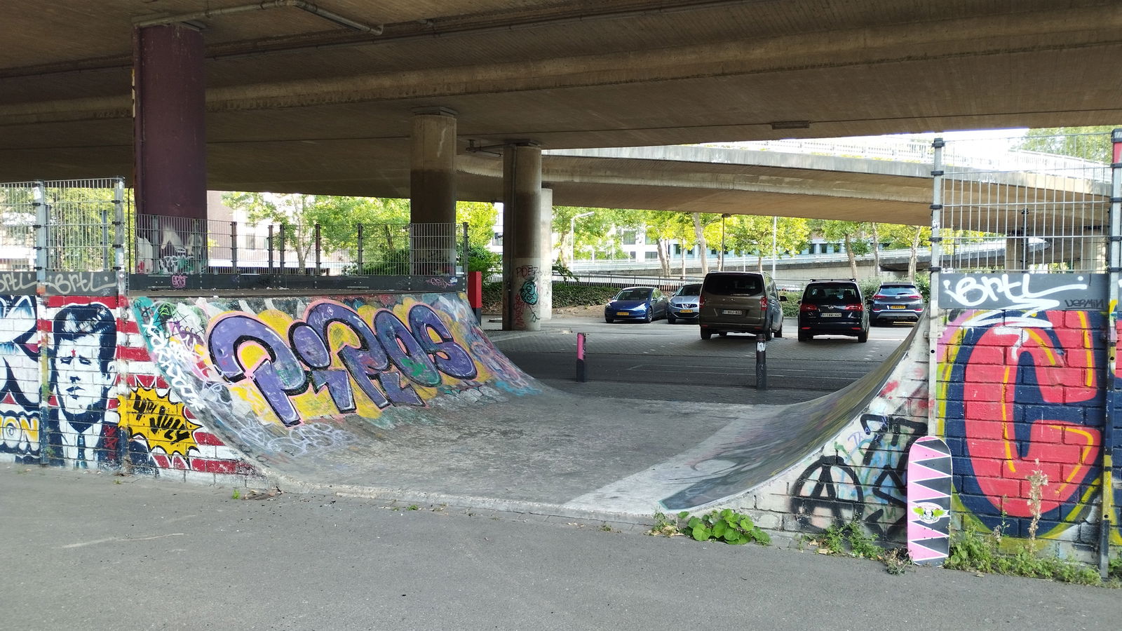 Maastricht City Park Skatepark is located beneath a freeway overpass. The skatepark features a miniramp and several basic obstacles.
