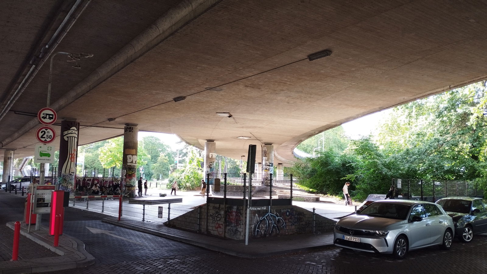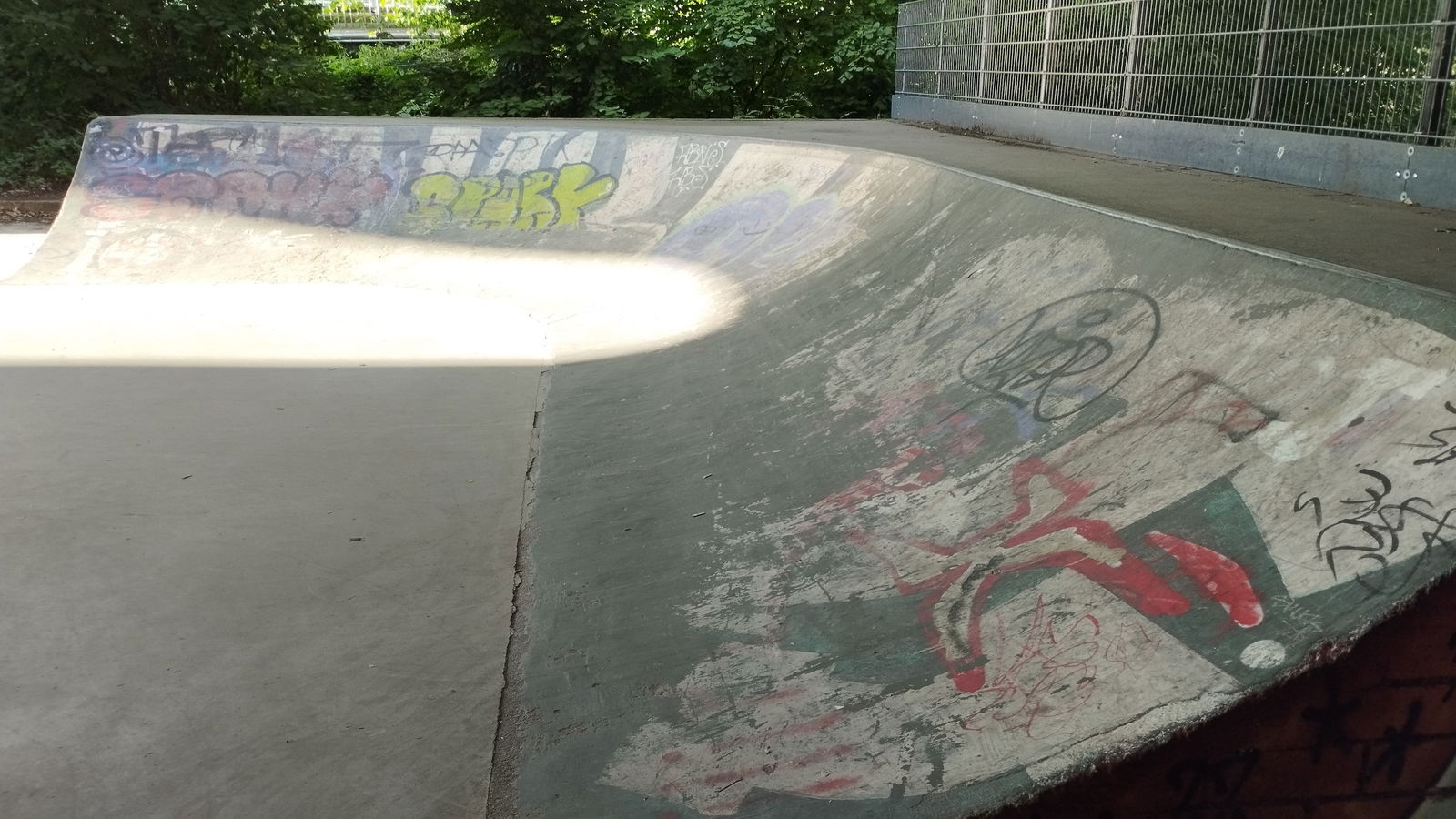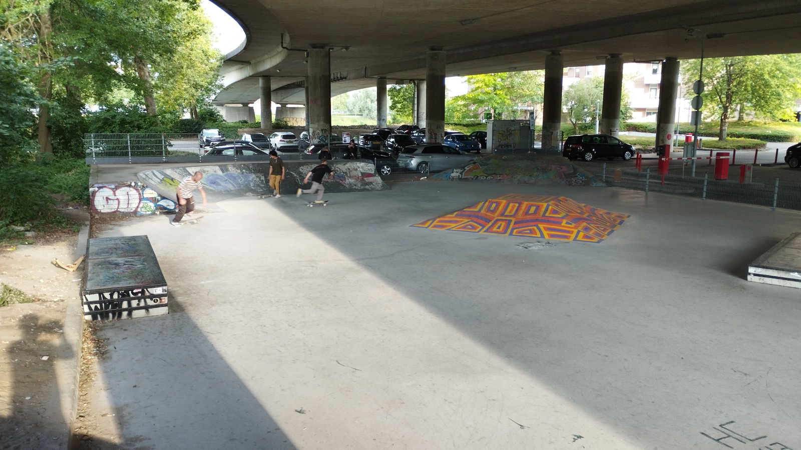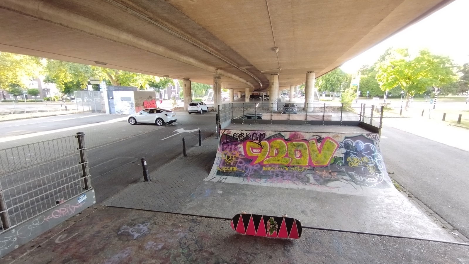 Maastricht City Park Skatepark is located beneath a freeway overpass. The skatepark features a miniramp and several basic obstacles.