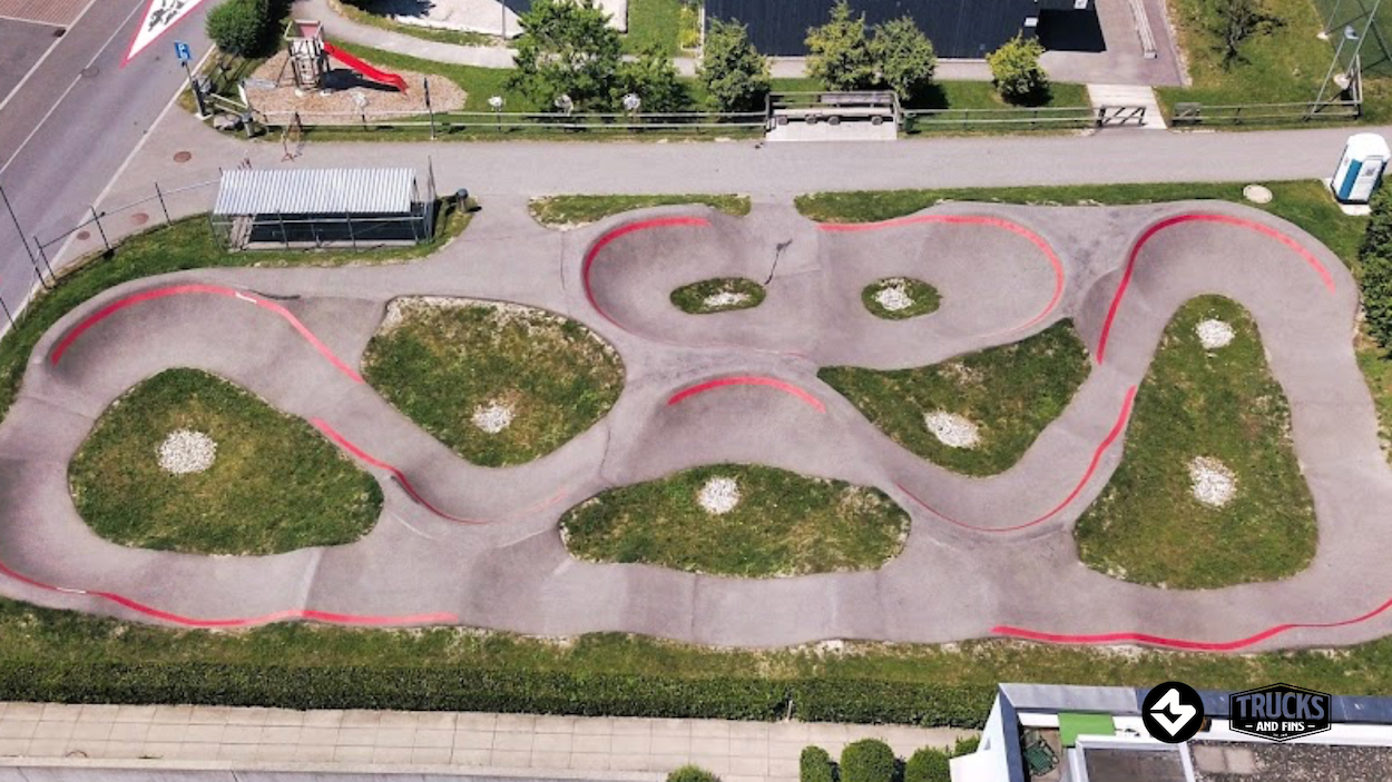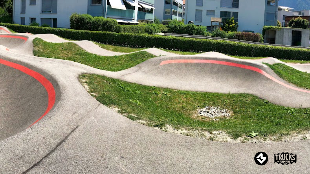The around 800m² Malans pumptrack is right next to a kindergarten. The Malans pump track is also known as the Eschergut pump track and was built by Velosolutions.