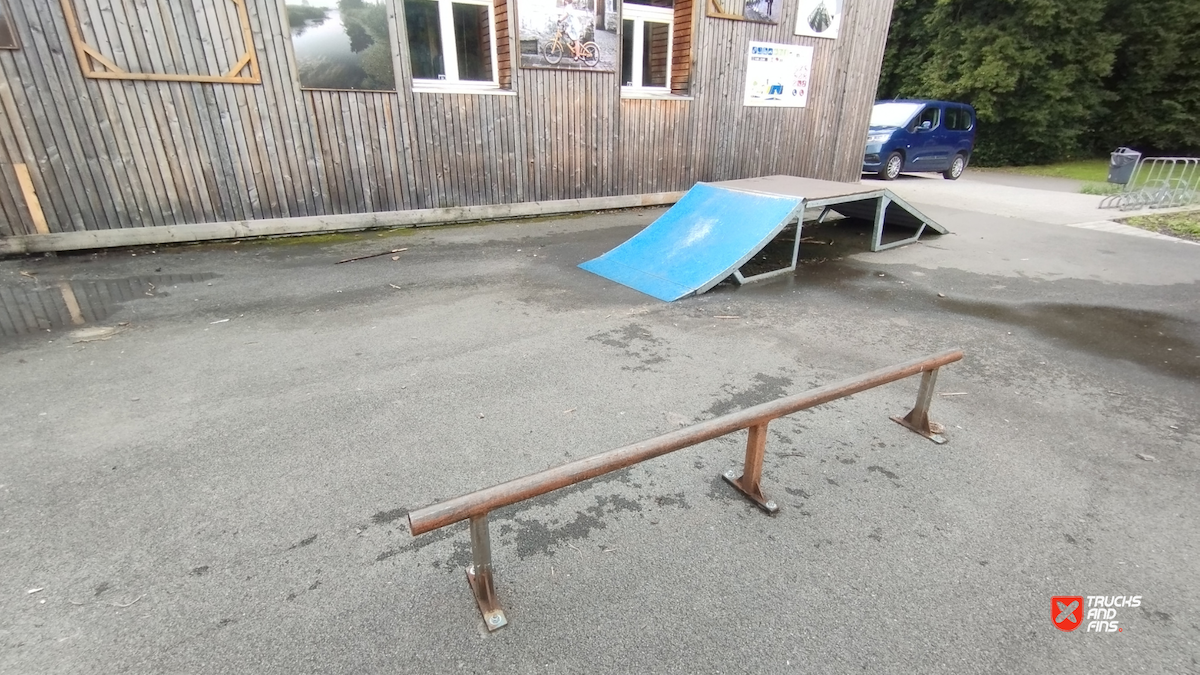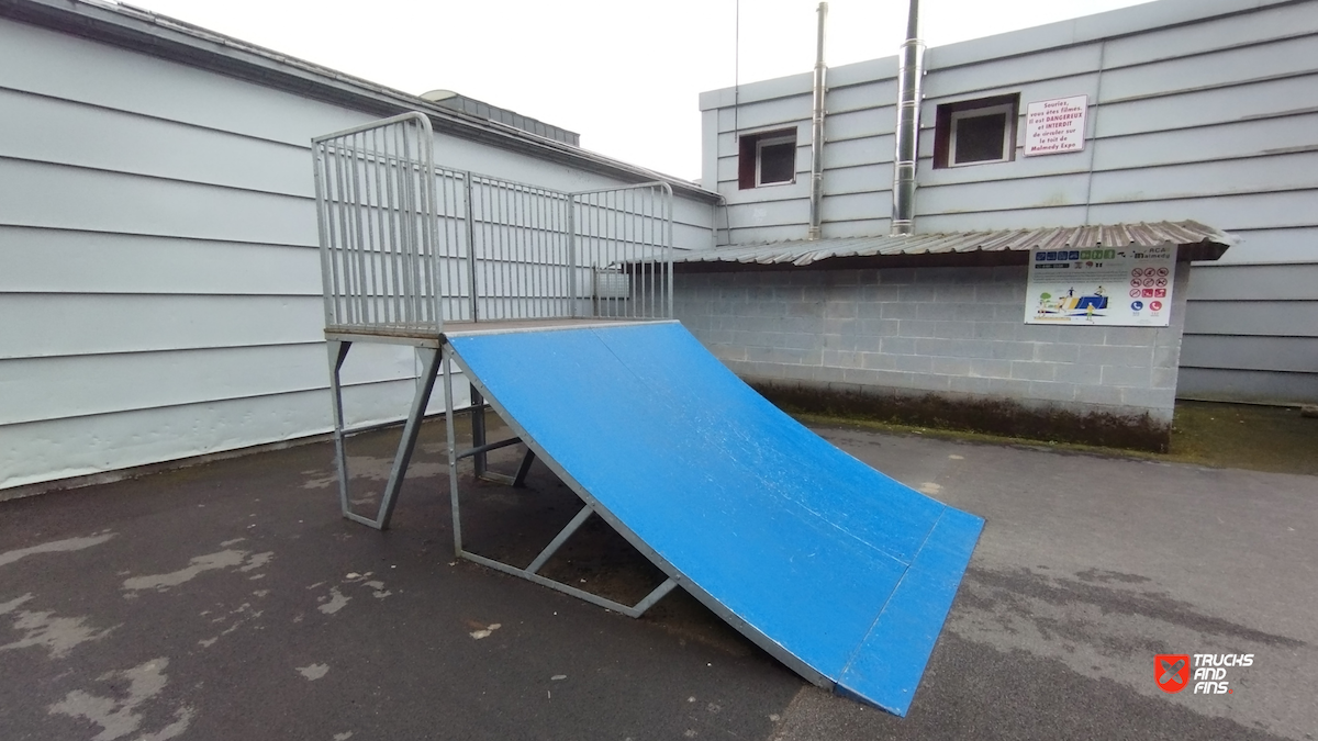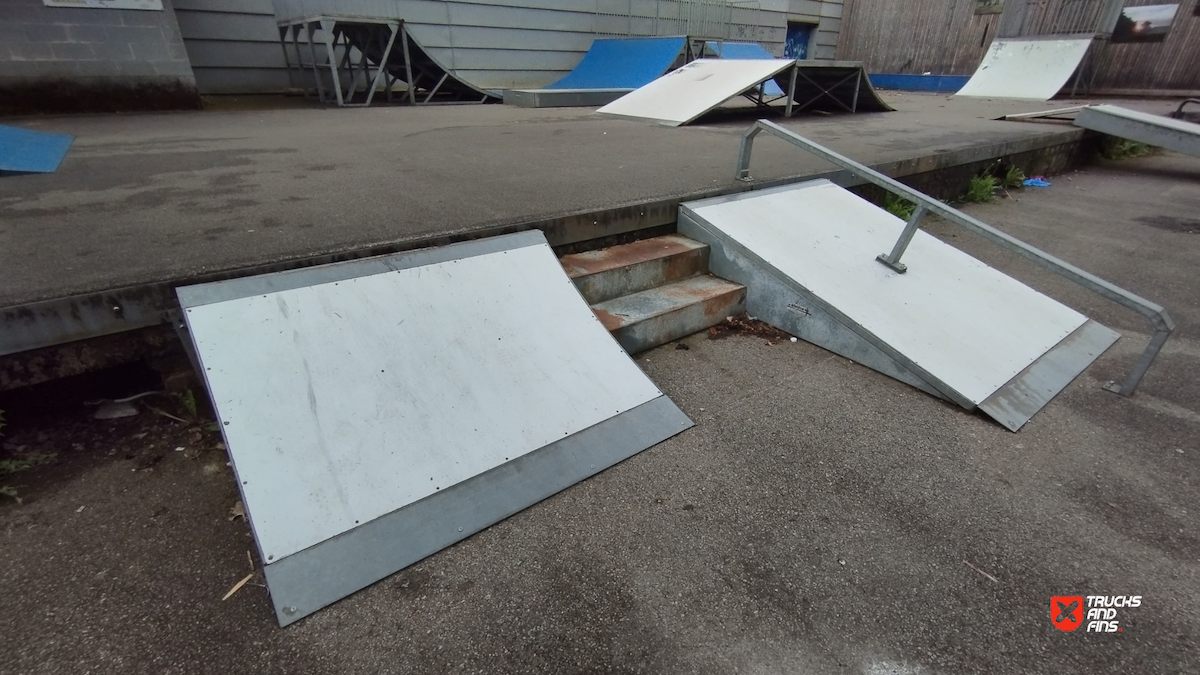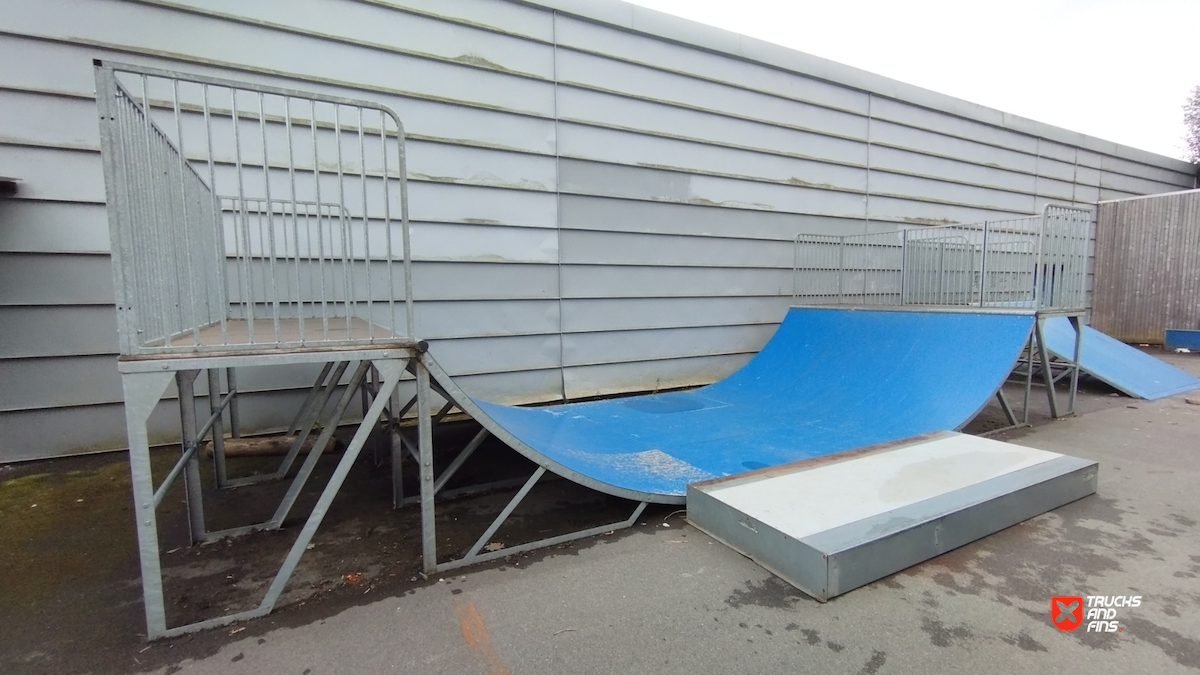Malmedy Skatepark consists of modular metal ramps on a tarmac base.