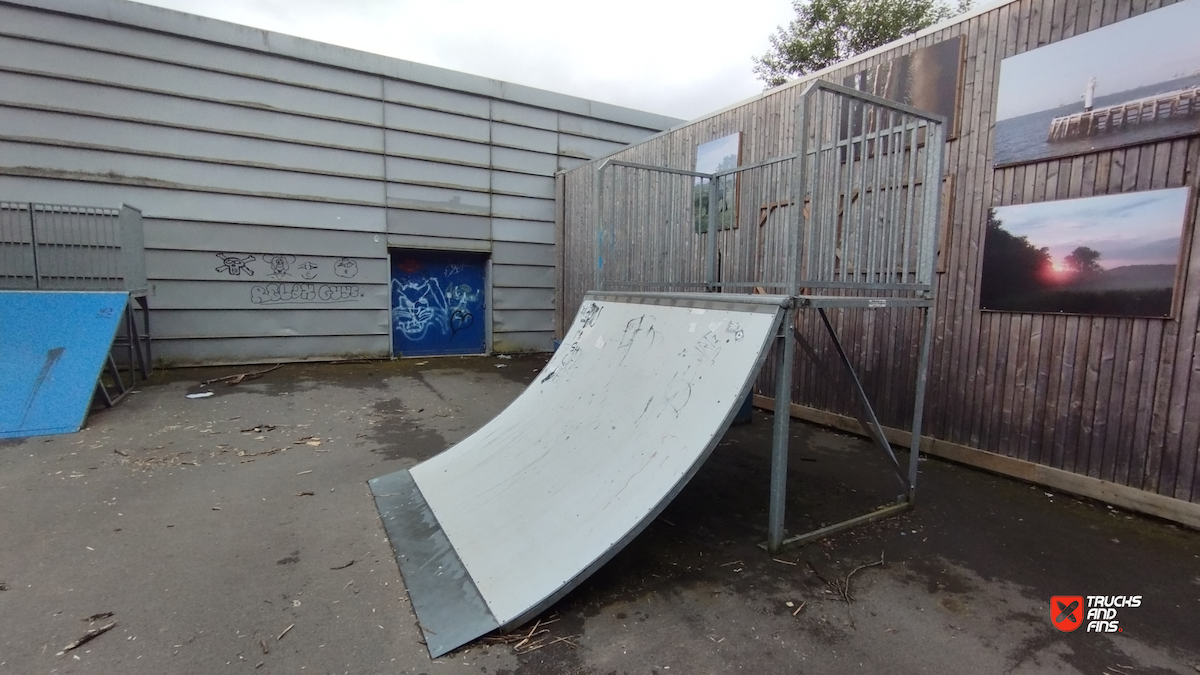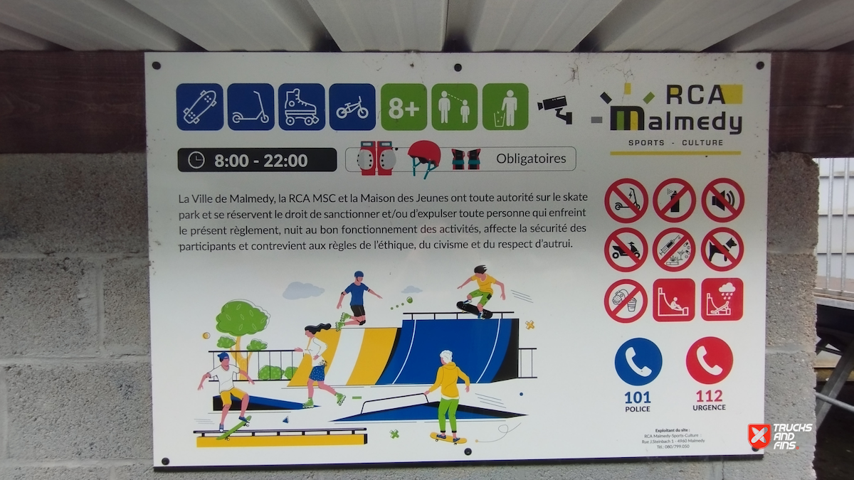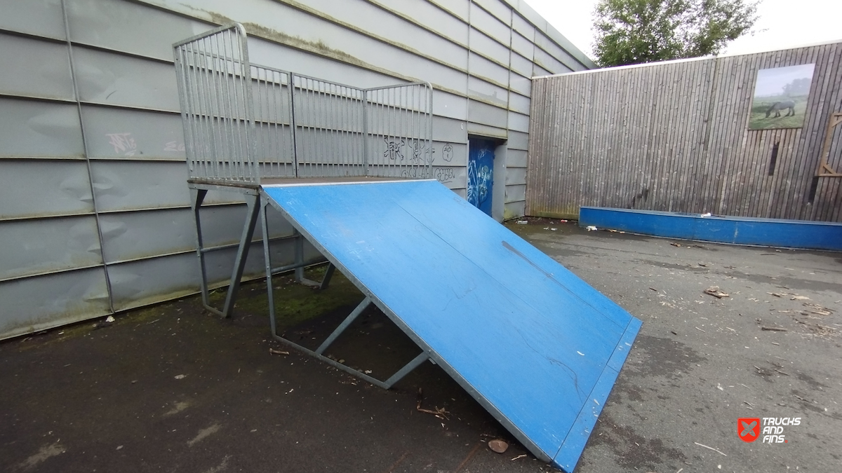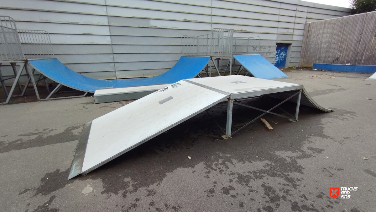Malmedy Skatepark consists of modular metal ramps on a tarmac base.