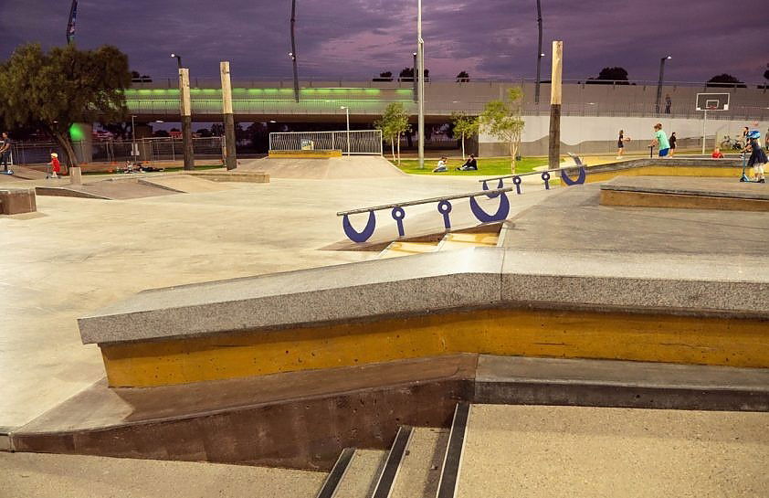 The $22 million Mandurah Waterfront Project was funded by contributions from the State Government ($10 million), the Federal Government ($7 million), and the City of Mandurah ($5 million). The skatepark itself features three distinct skate zones catering to various skill levels, including a competition-grade bowl for skaters, BMX, and scooter riders. In addition to skating areas, the park includes recreational spaces such as grassed areas, elevated spectator seating with shelters, a basketball half-court, and facilities like drinking fountains and lighting for evening use.