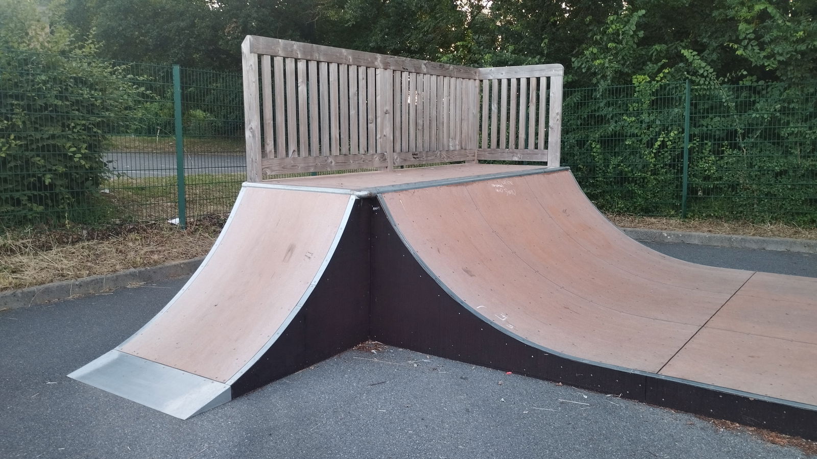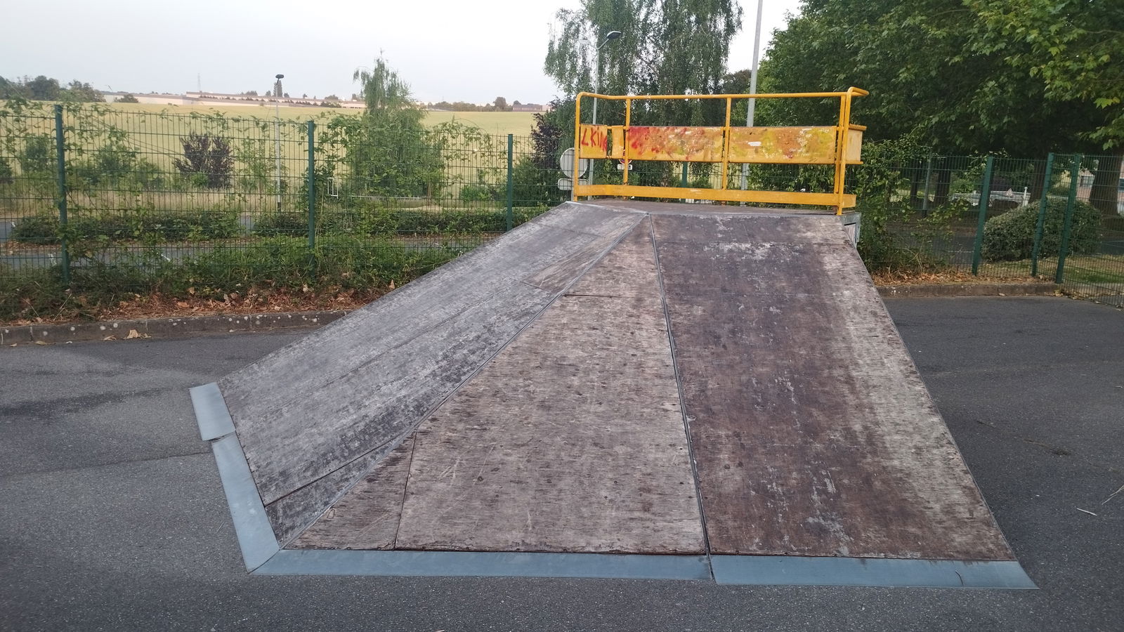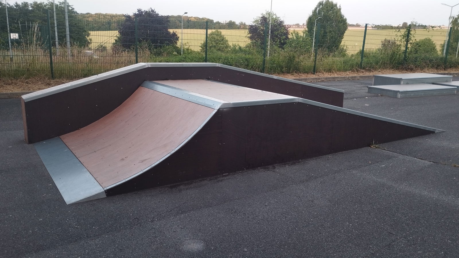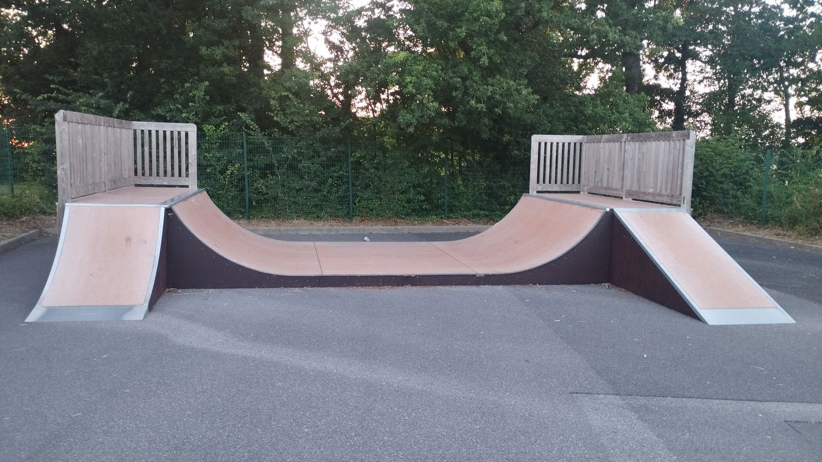 Marly-la-Ville skatepark is made up of a back and forth run with a quarter pipe and flat bank on either side of a funbox.