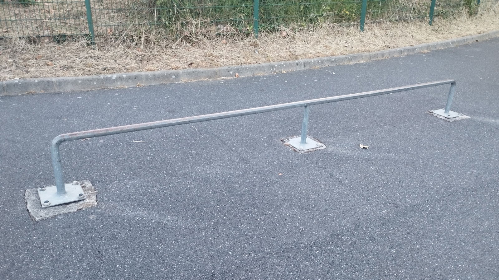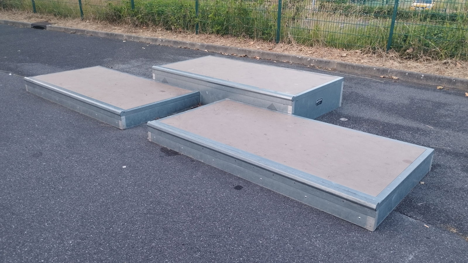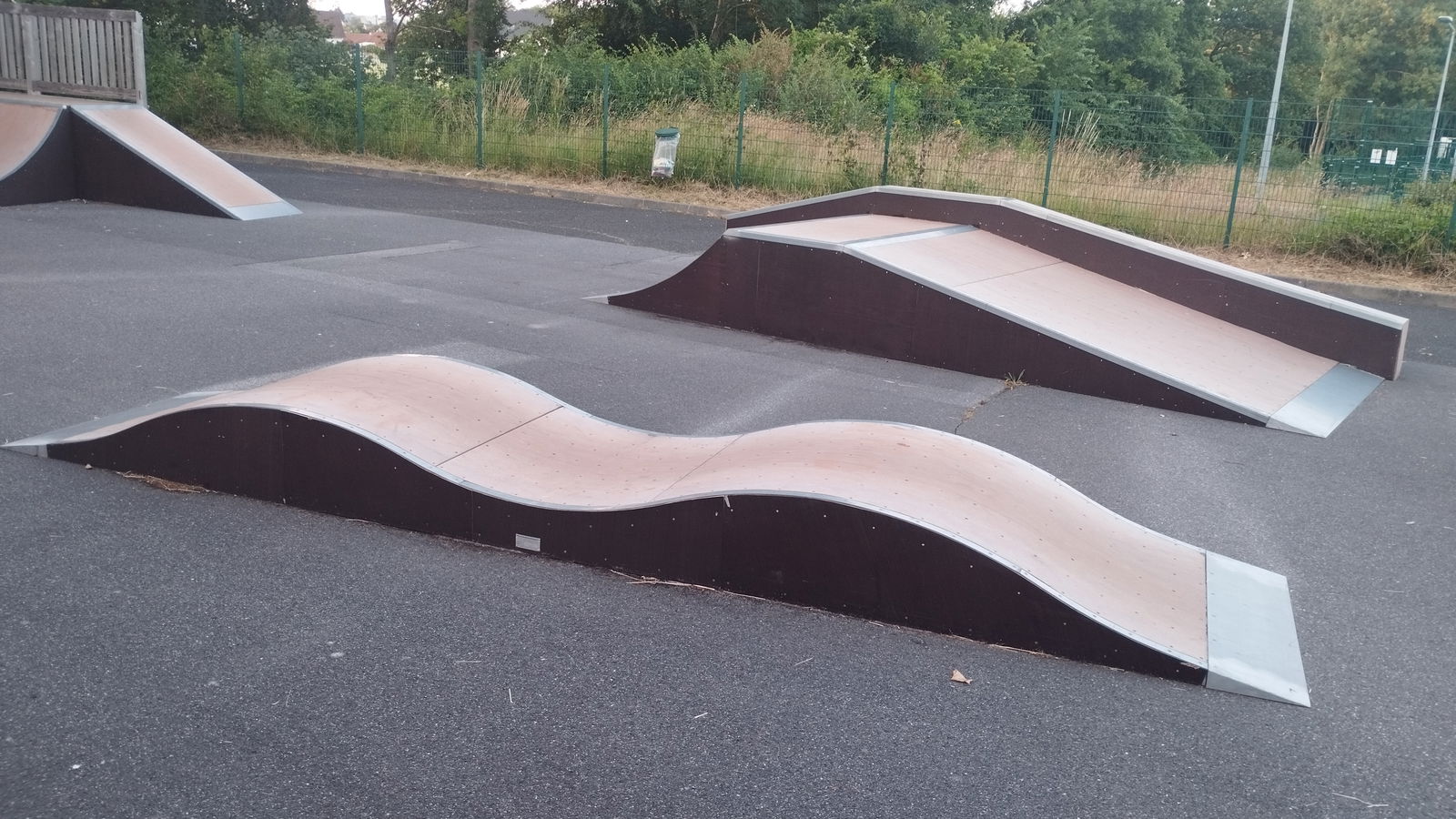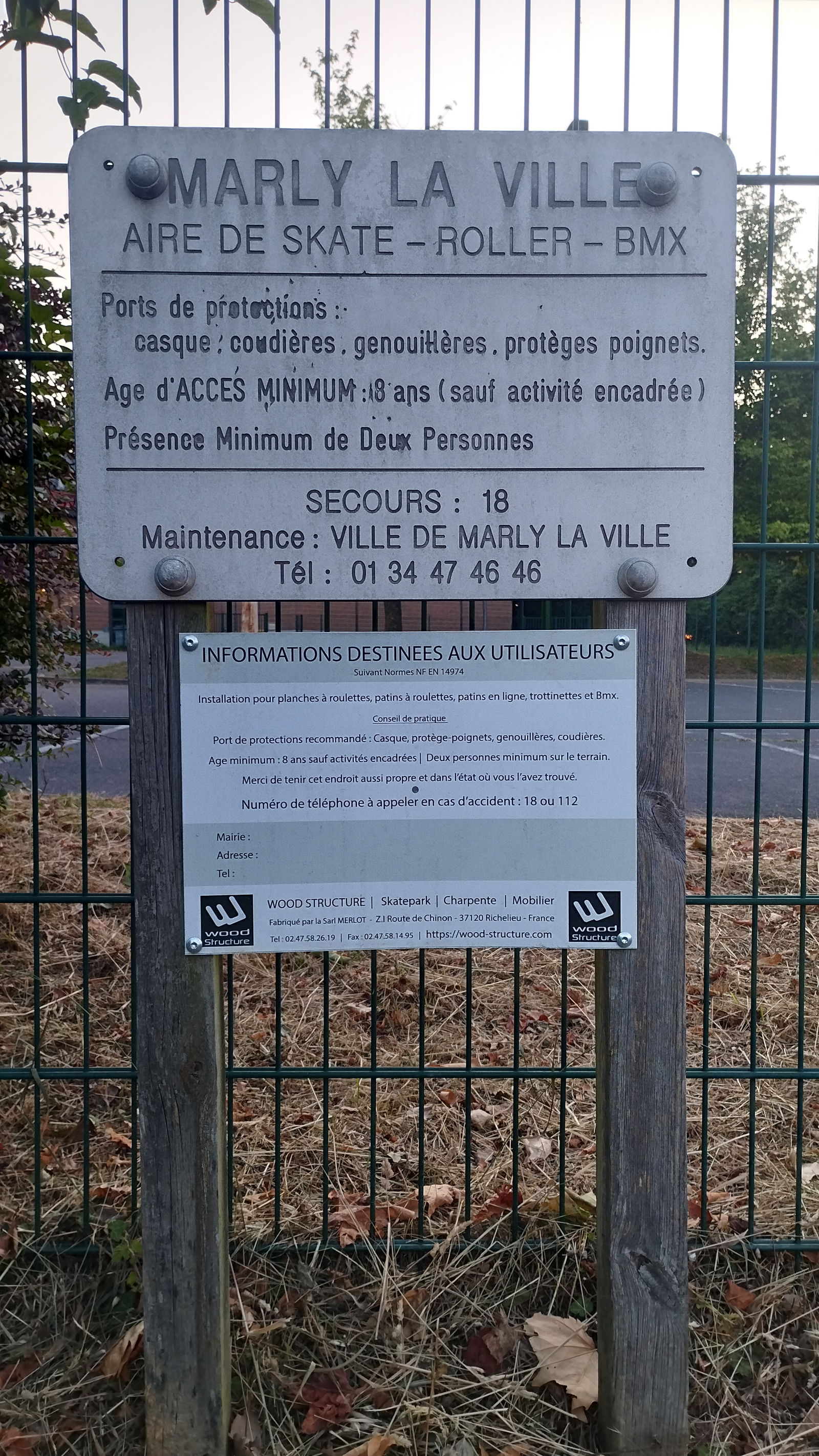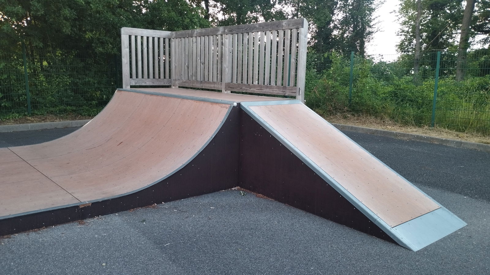 Marly-la-Ville skatepark is made up of a back and forth run with a quarter pipe and flat bank on either side of a funbox.