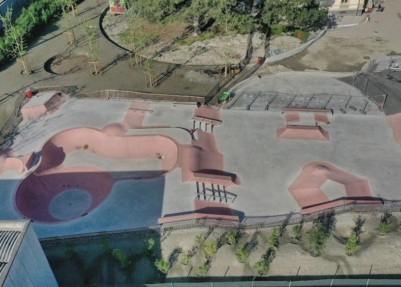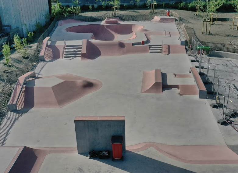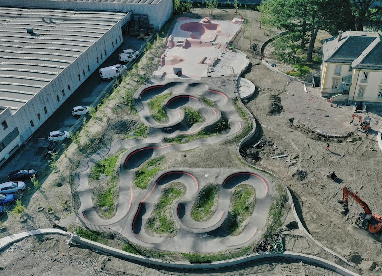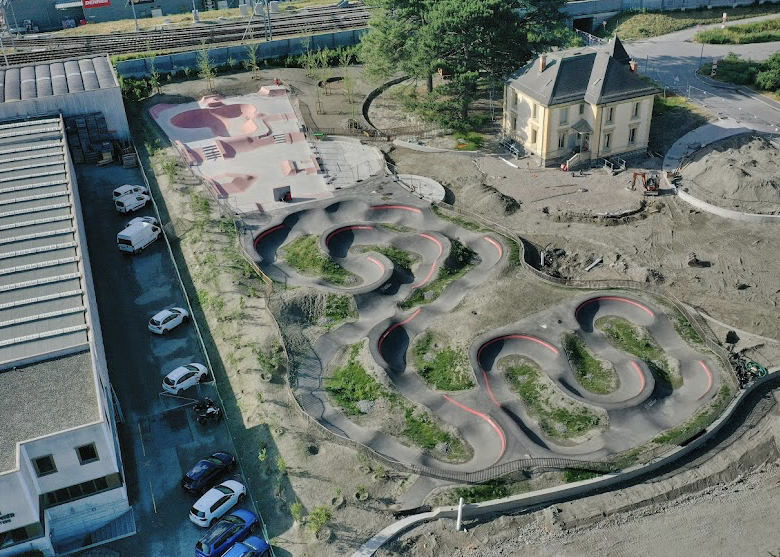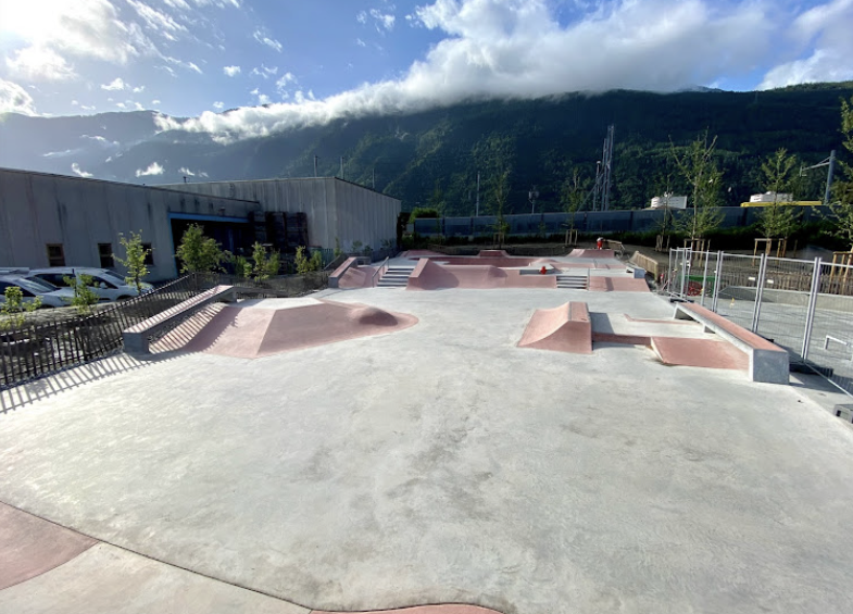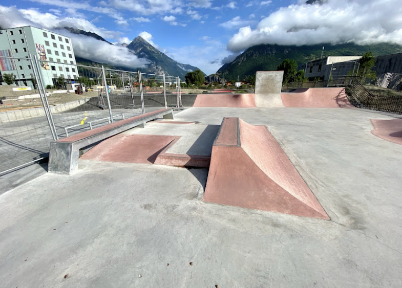 Martigny skatepark features a concrete bowl and a street section. The skatepark is located next to Martigny pumptrack.