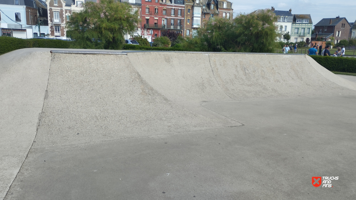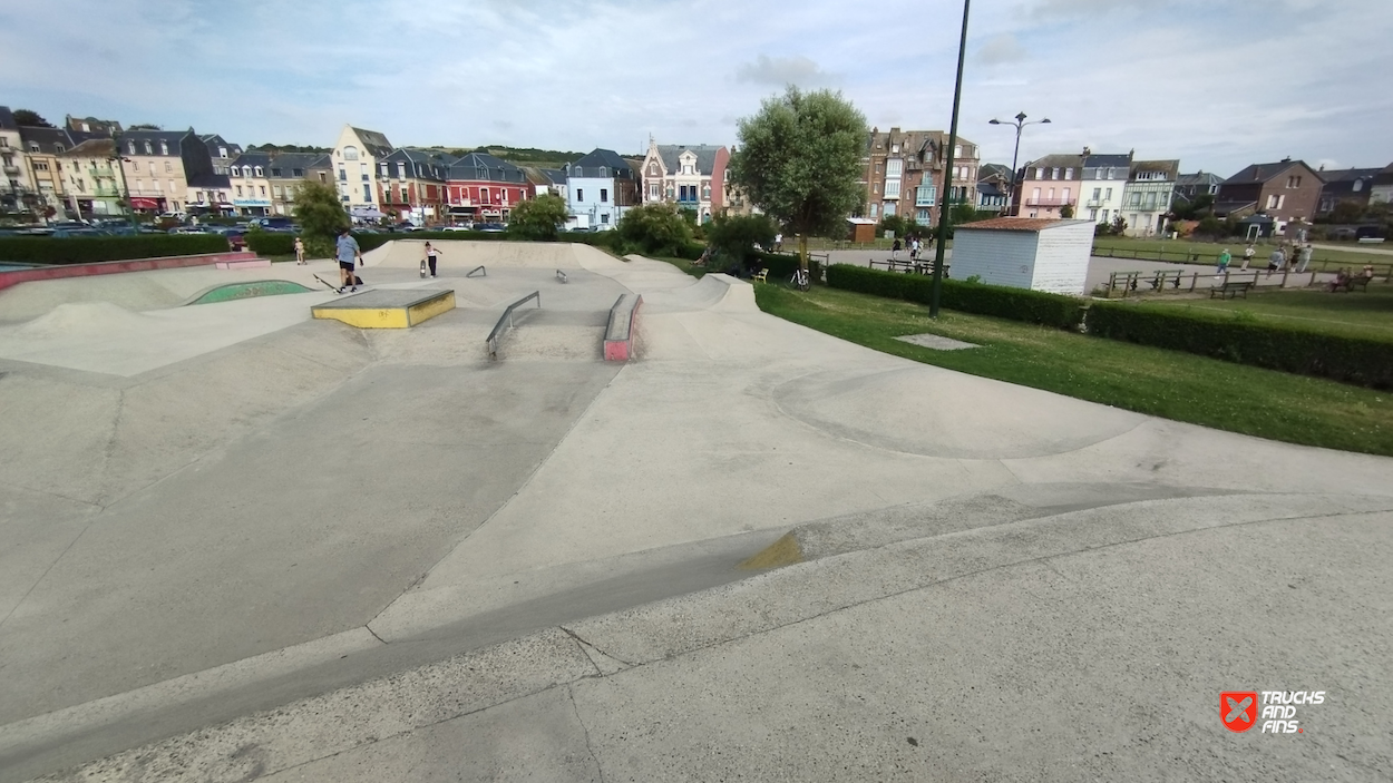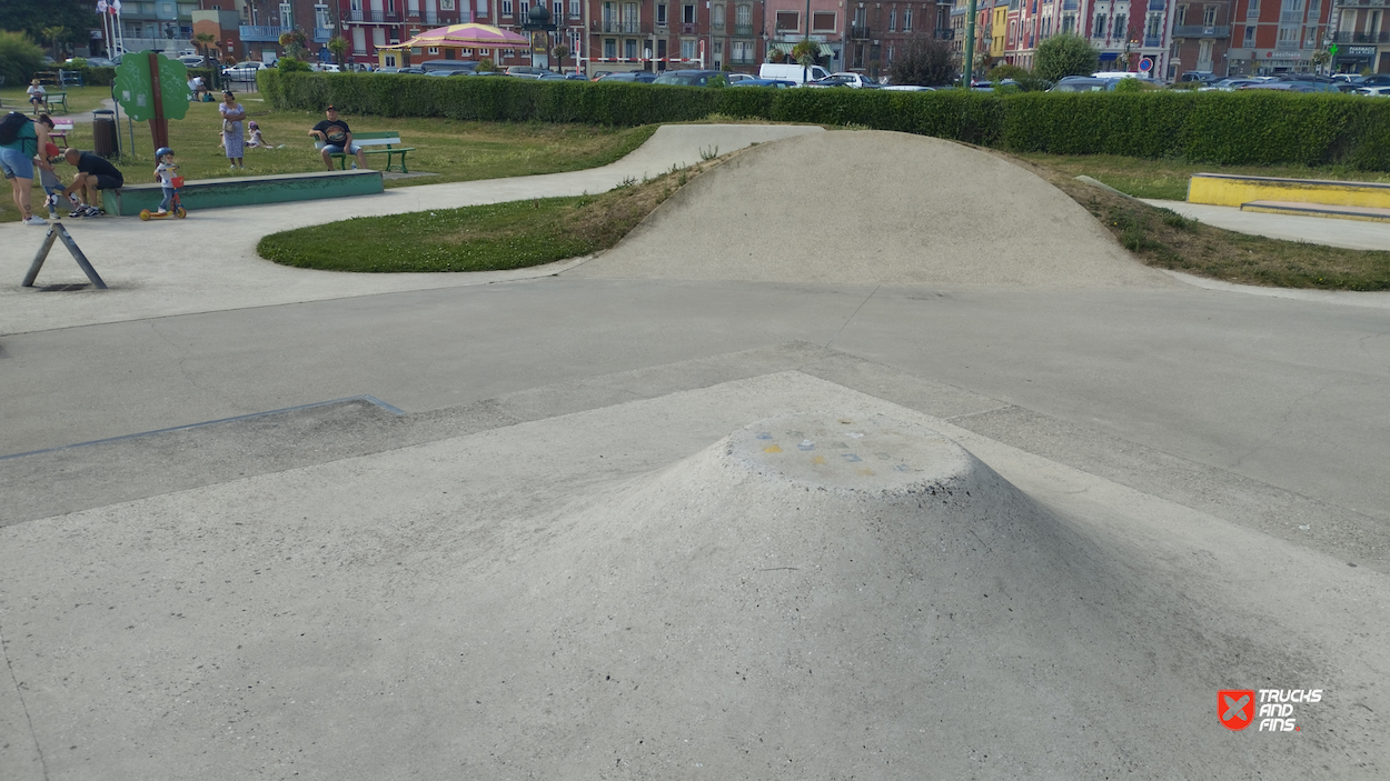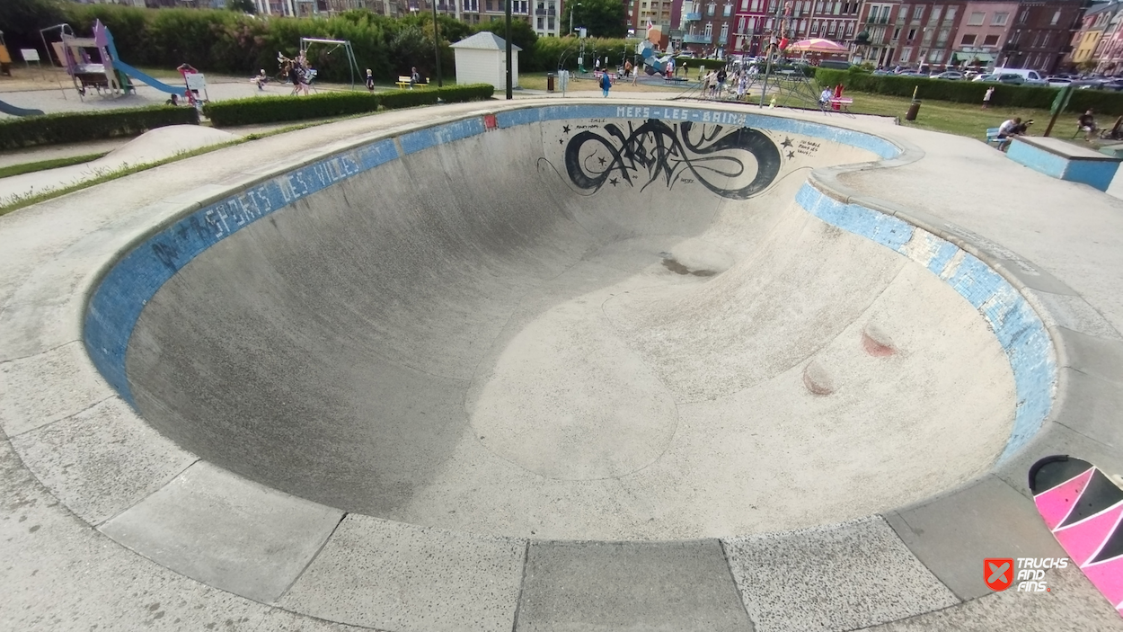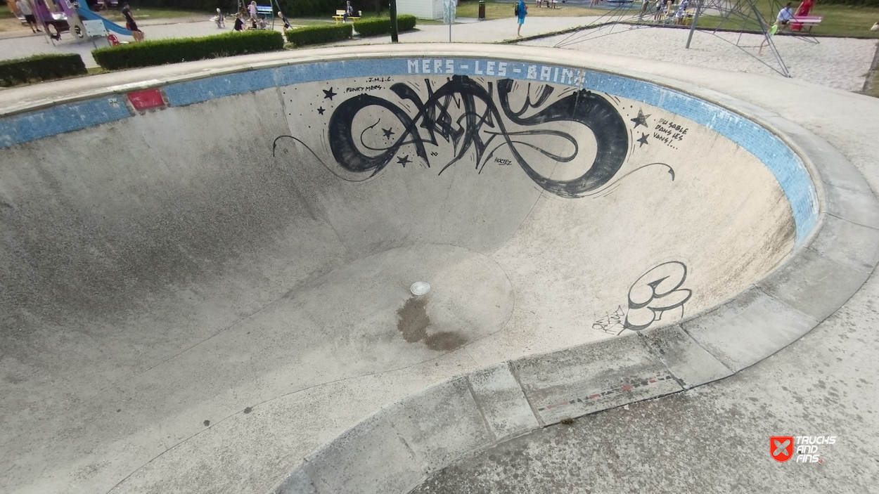 Mers-les-Bains skatepark is a concrete park featuring a bowl and transtion area with street elements.