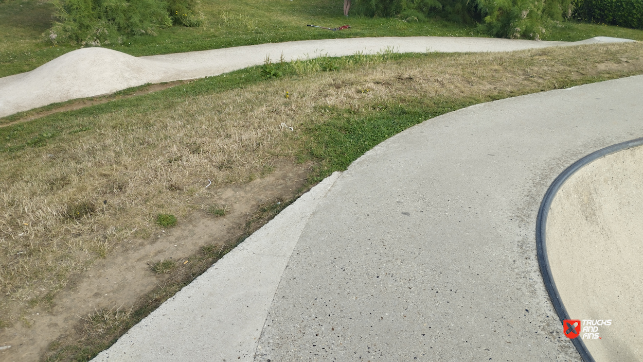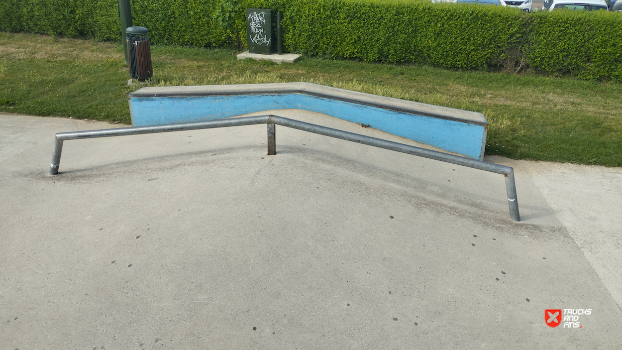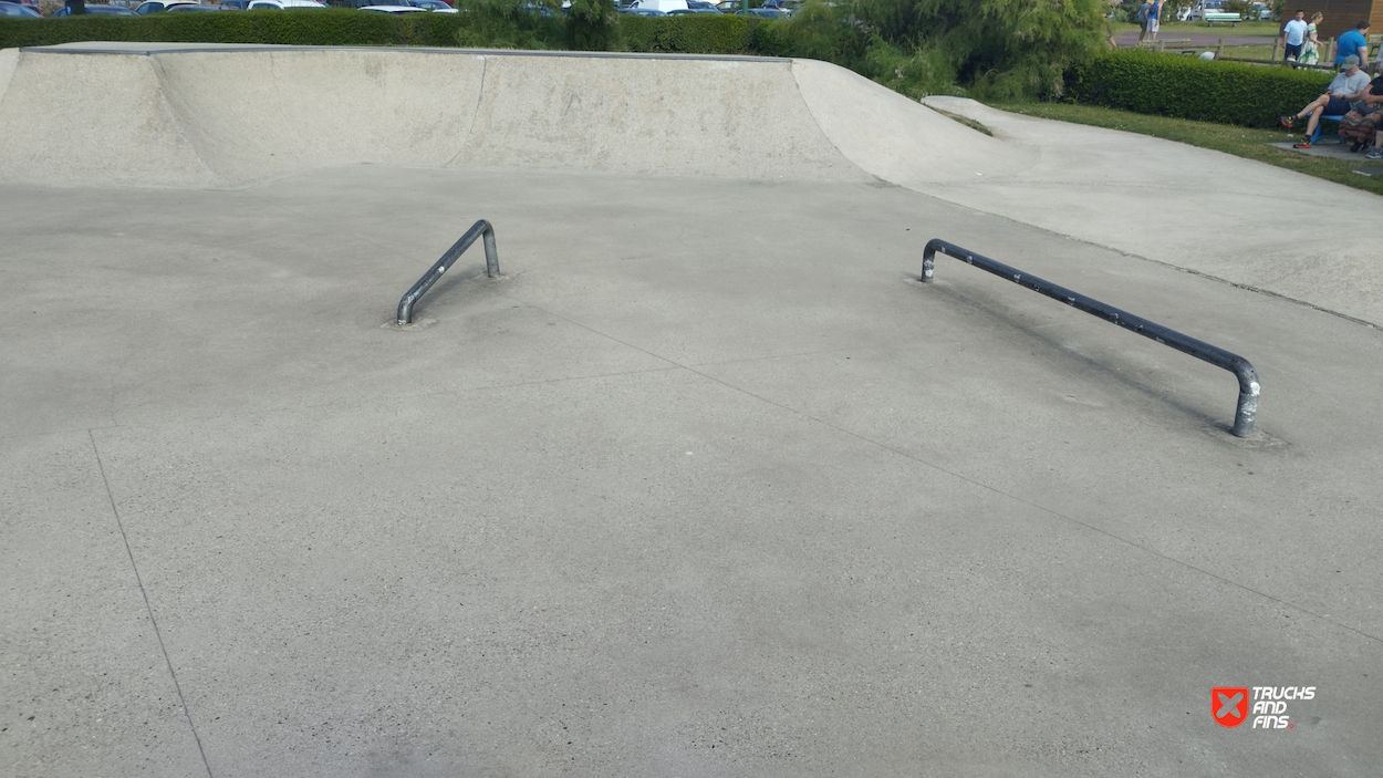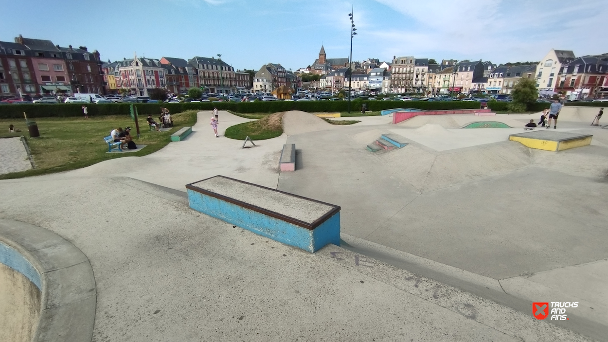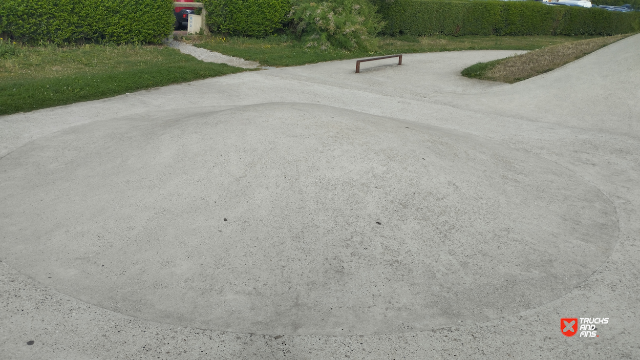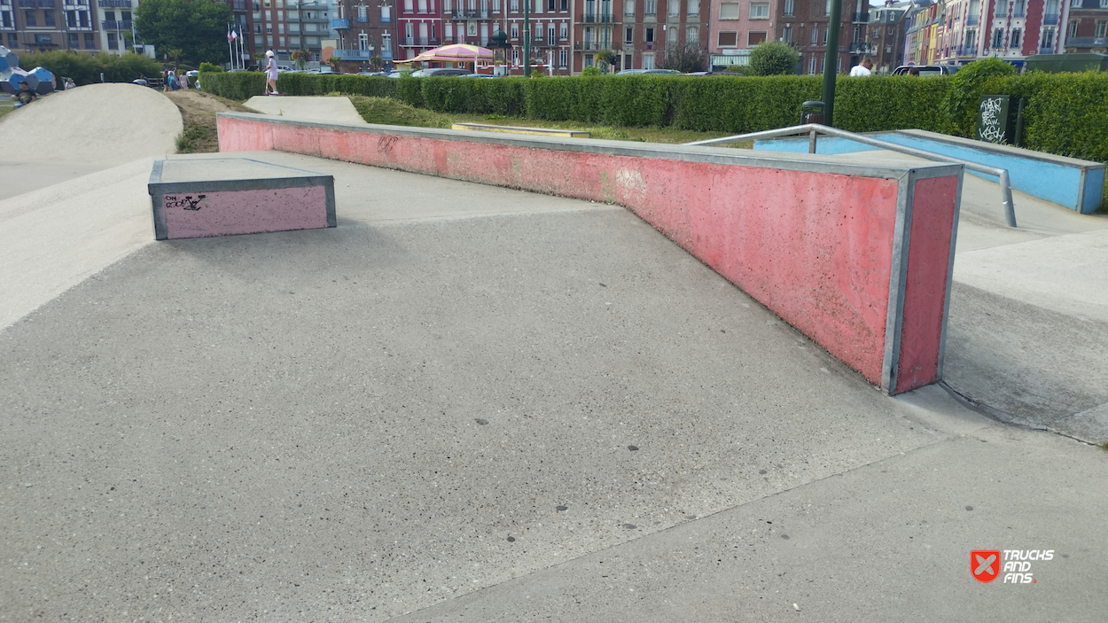 Mers-les-Bains skatepark is a concrete park featuring a bowl and transtion area with street elements.