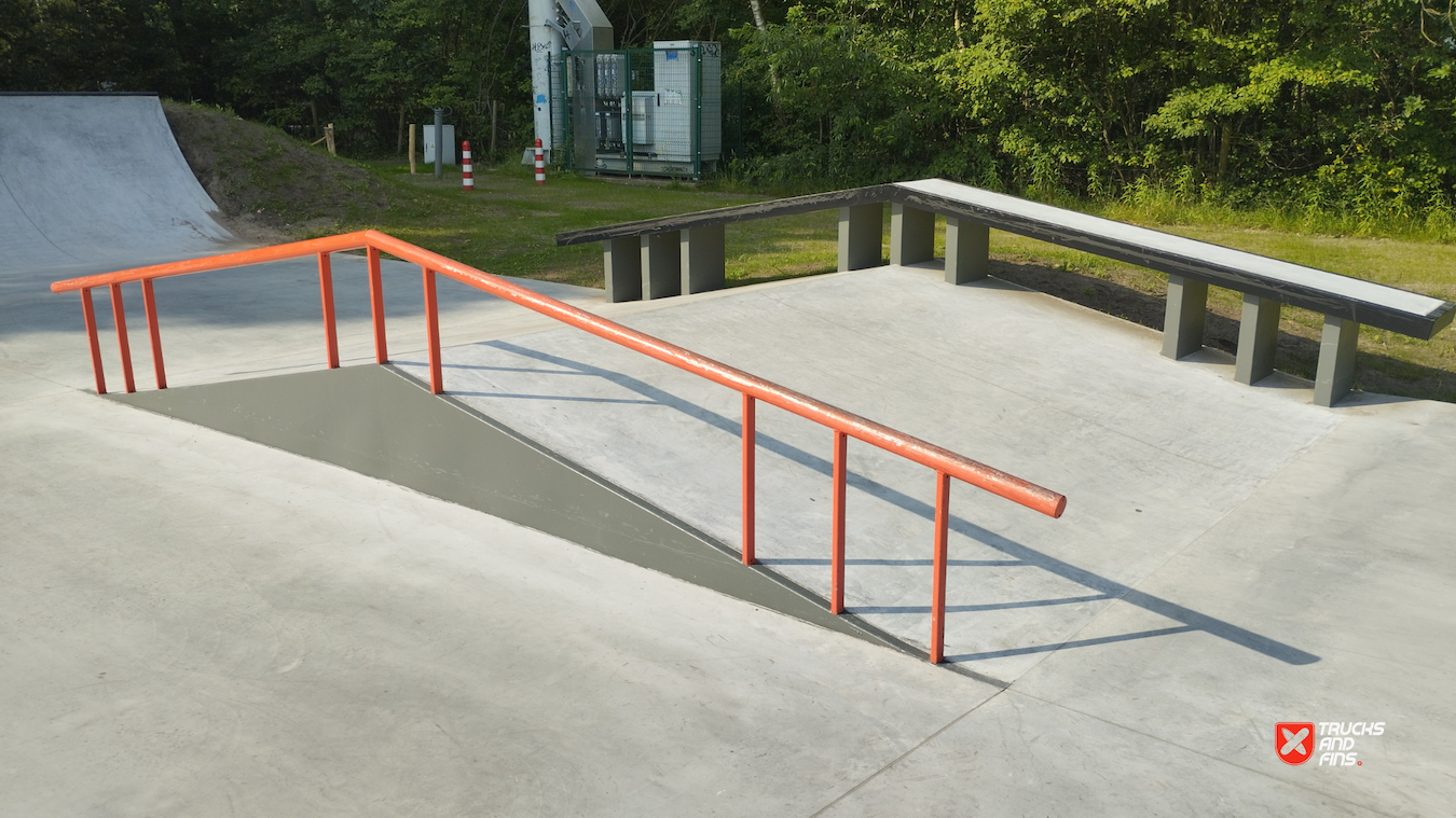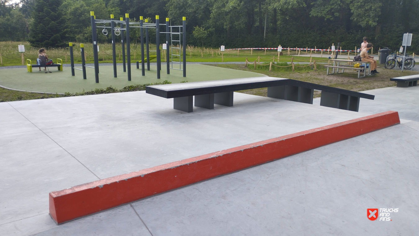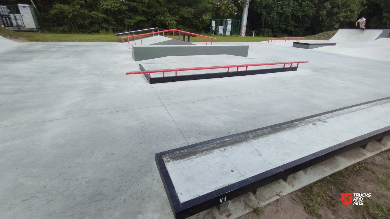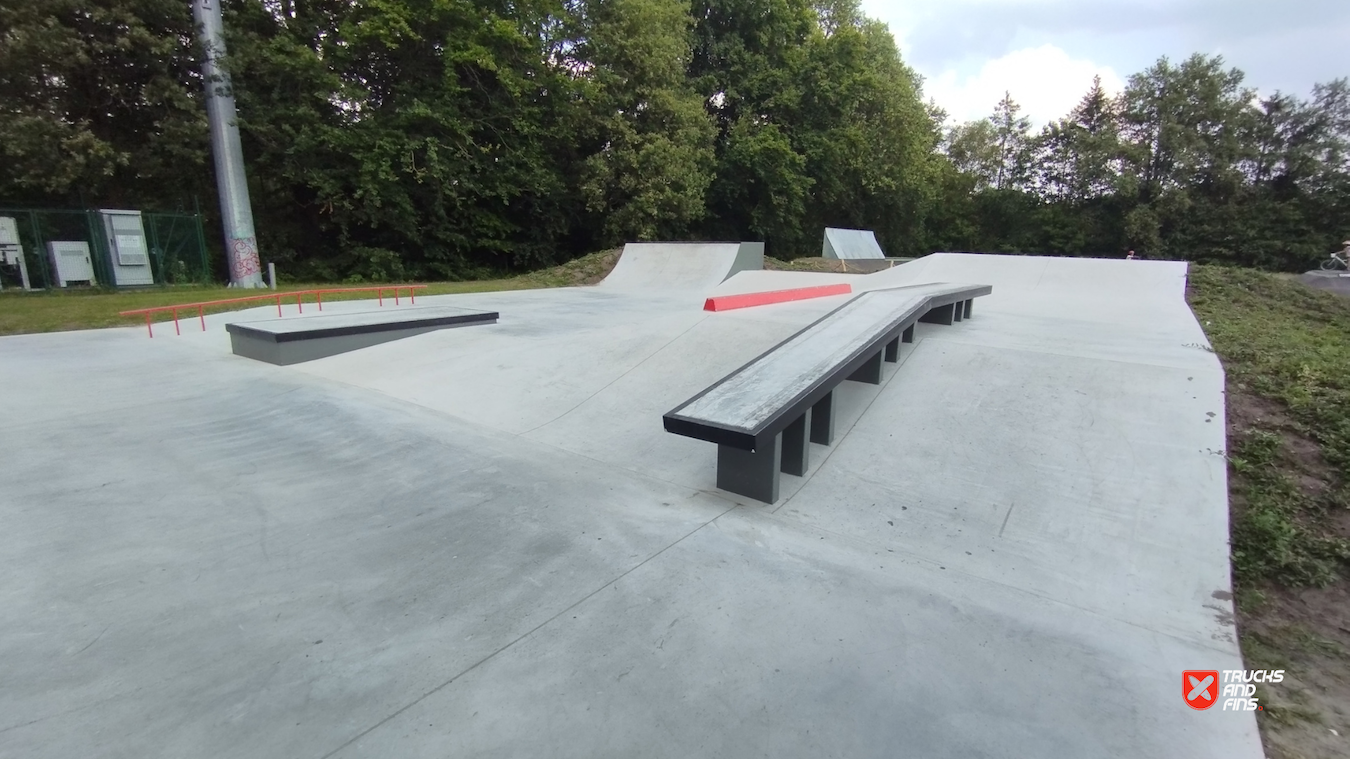Mishagen Brasschaat skatepark is a concrete skatepark packed with ledges, manual pads and street obstacles. Before there was a wooden park on spot.