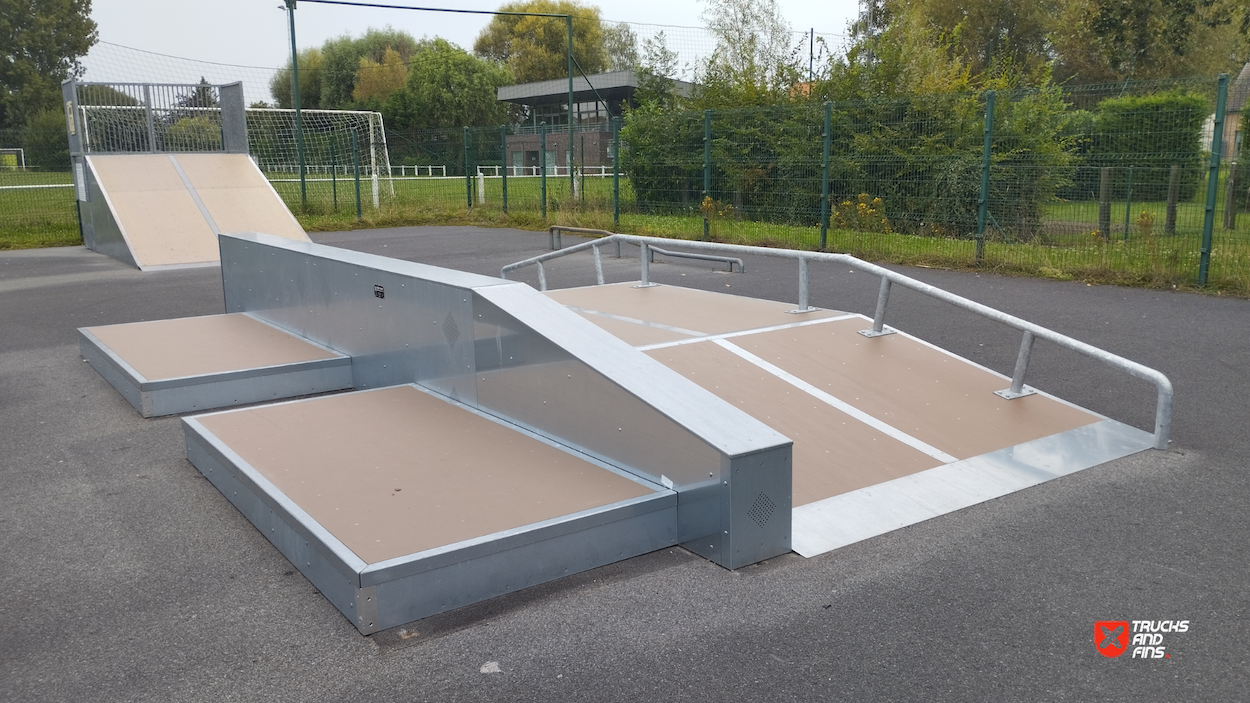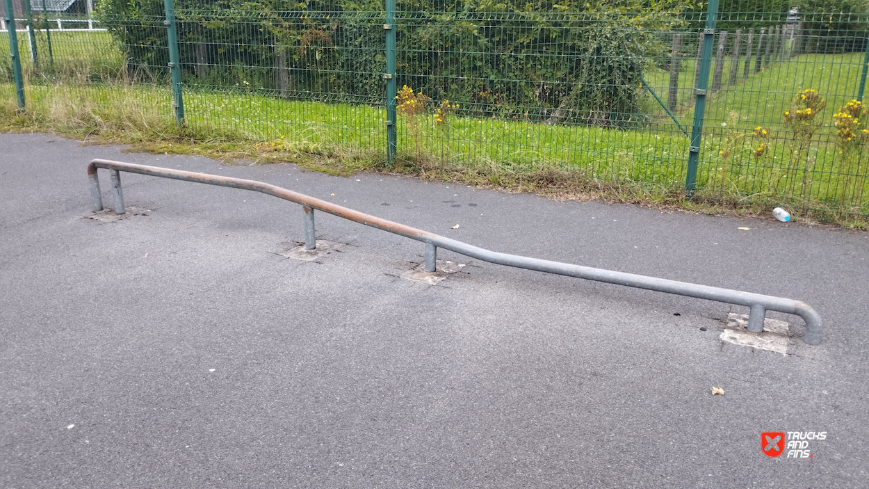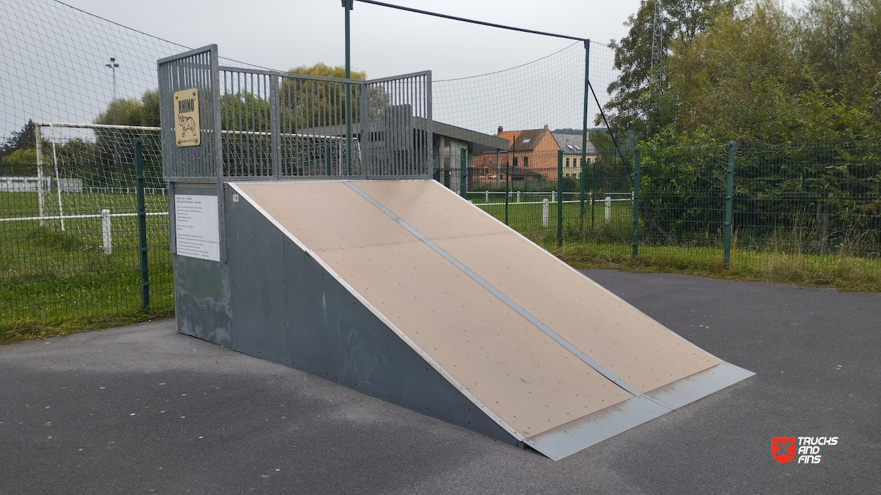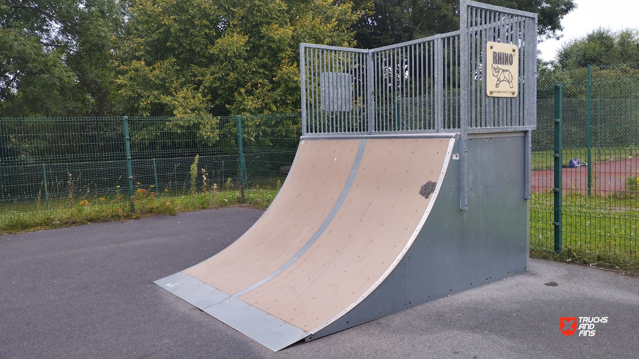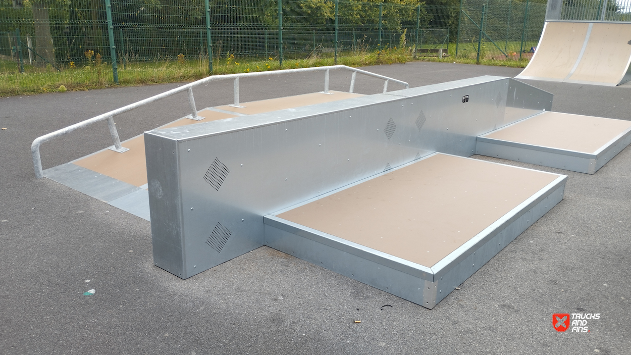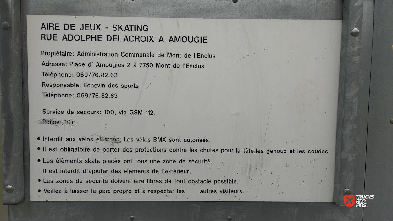 Mont-de-l‘Enclus skatepark is made up of a back and forth run with a quarter pipe and flat bank on either side of a funbox. The skatepark was built by Rhino Ramps.