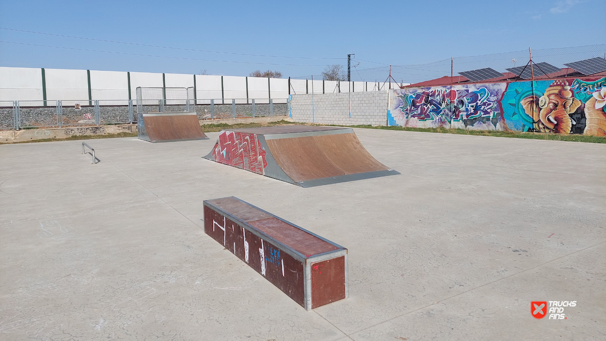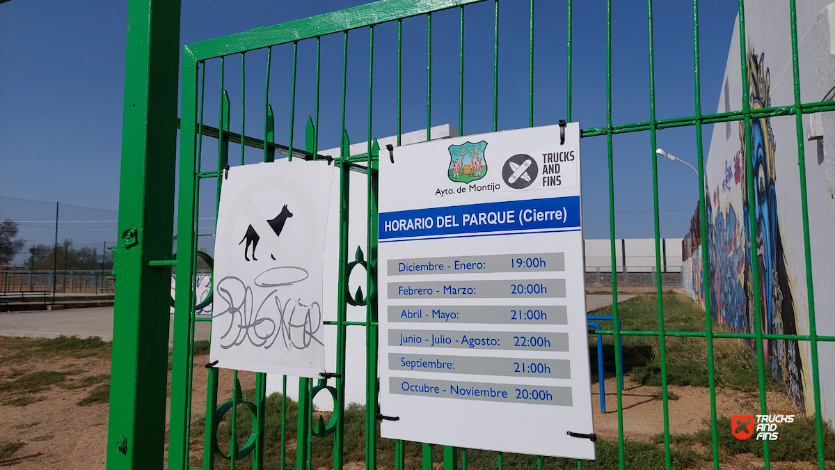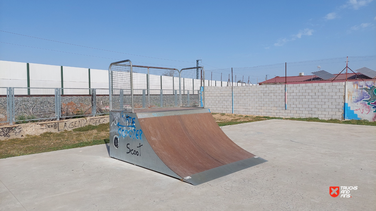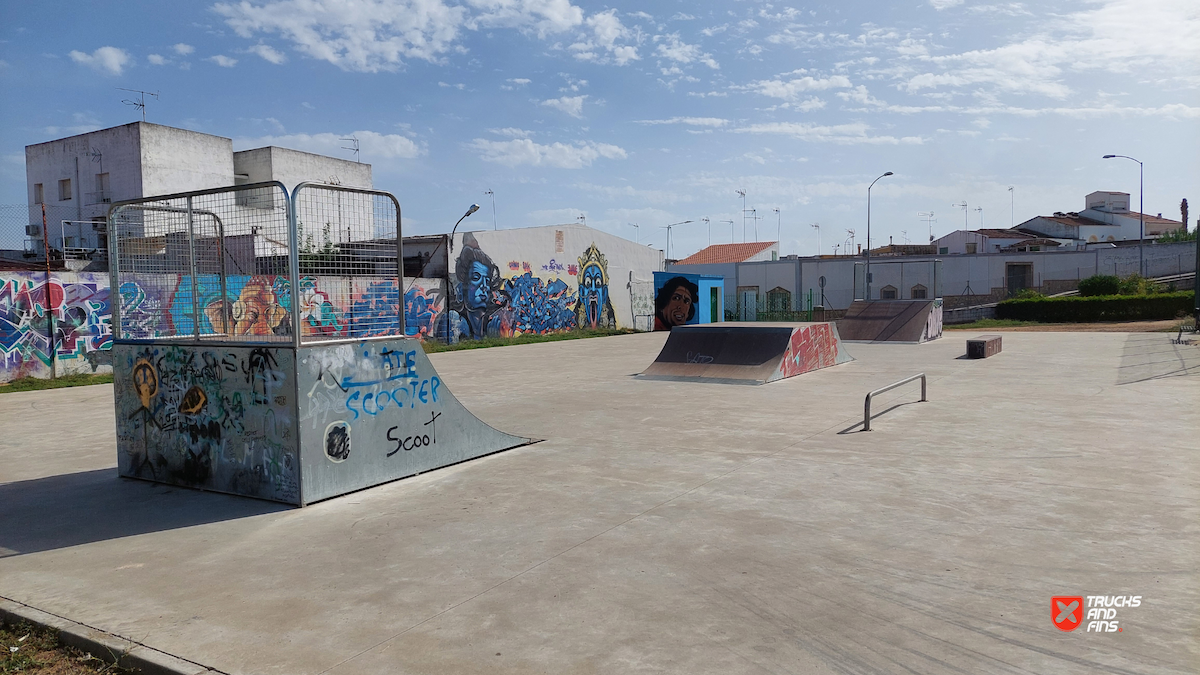 Montijo skatepark is made up of a back and forth run with a quarter pipe and bank on the sides of a funbox.