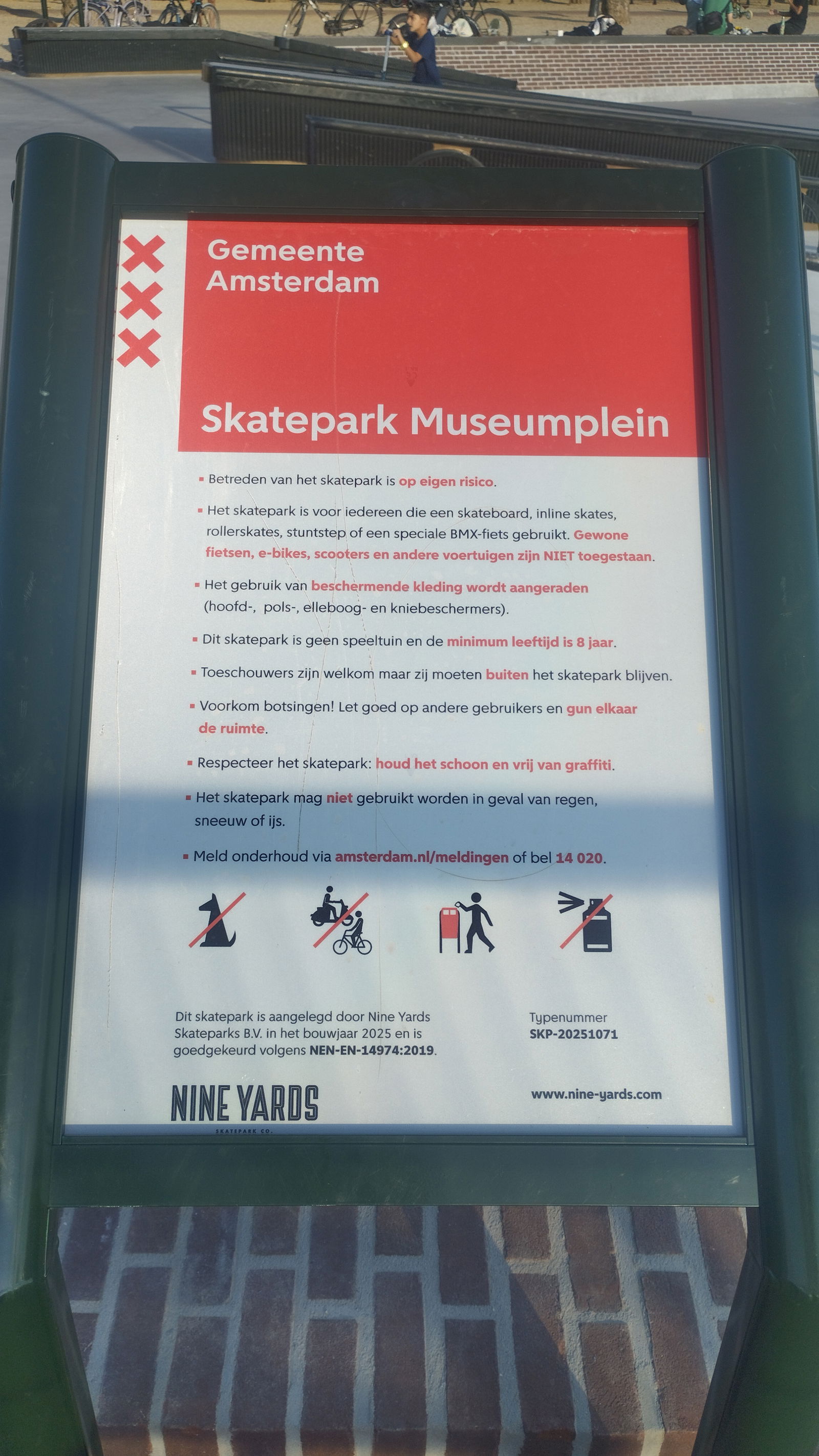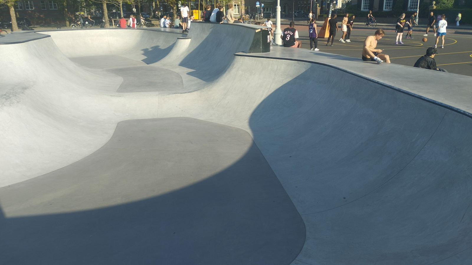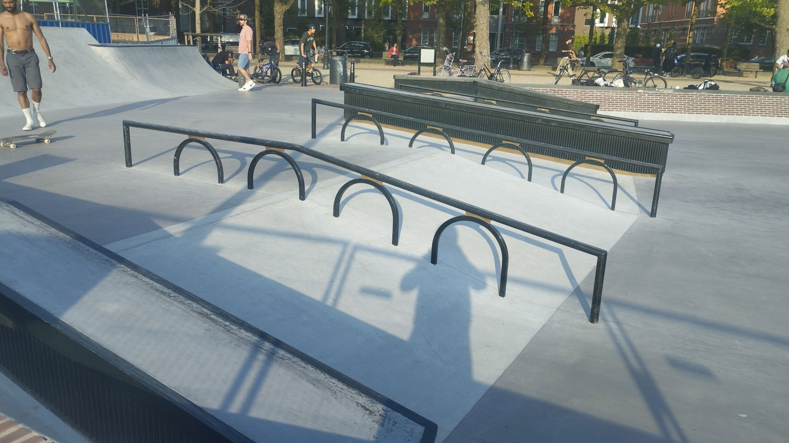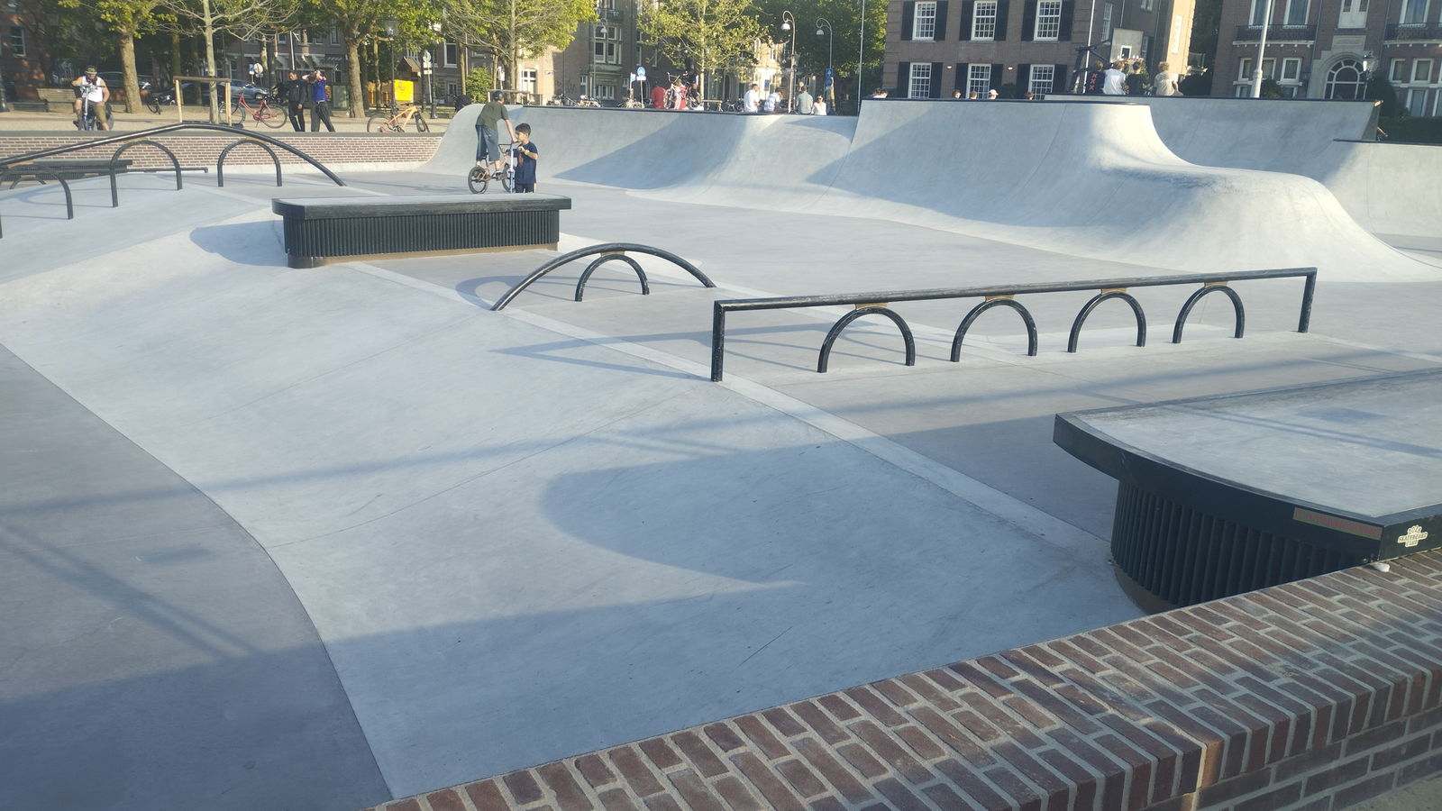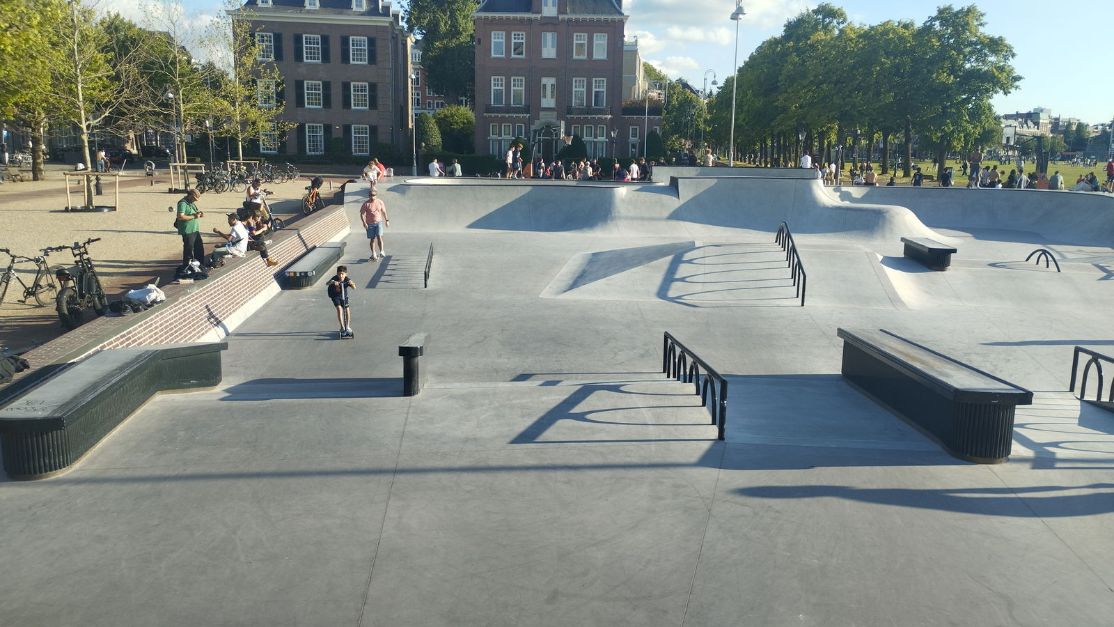Museumplein skatepark features a large concrete park made up of a bowl and street section with a nice variety of obstacles. The skatepark is located near the Van Gogh museum.