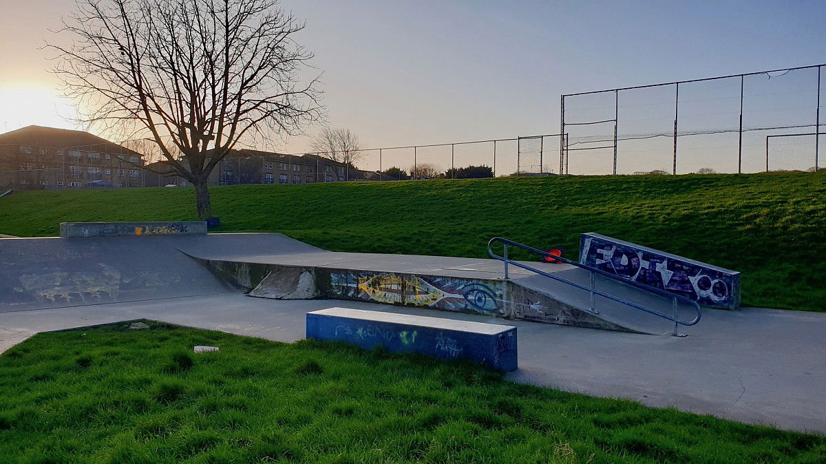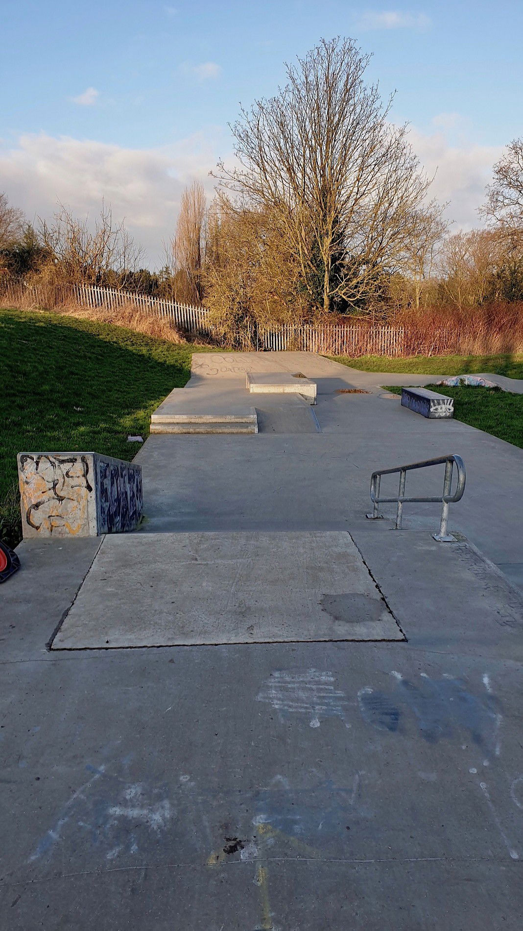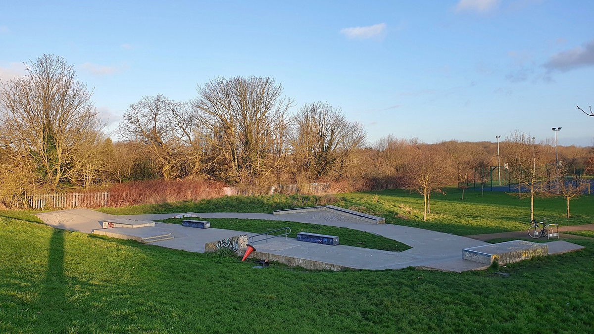 Coldfall wood skatepark is a plaza style park. Two smooth flowing lines around a grass centre meeting at either side with a flat bank and a split level bank. On one side it features two marble blocks along side a slope lined with a hubba and a rail leading into a long funbox with a slope, 2 stair set and a manny pad. The other features a roll over for pumping and a hip lined with an up and down hubba.