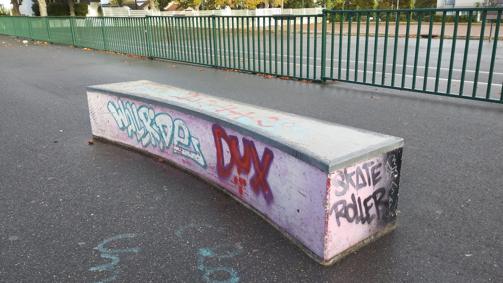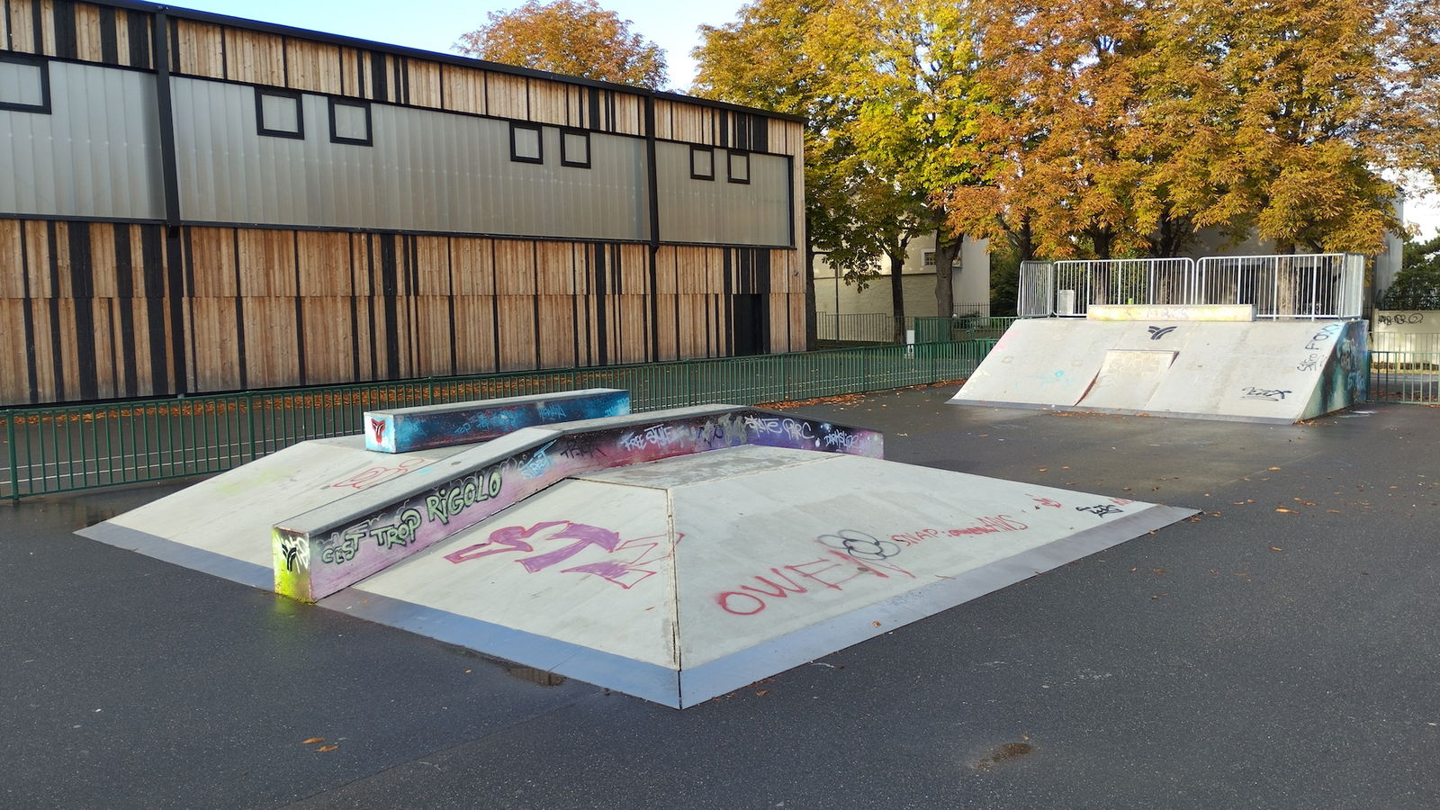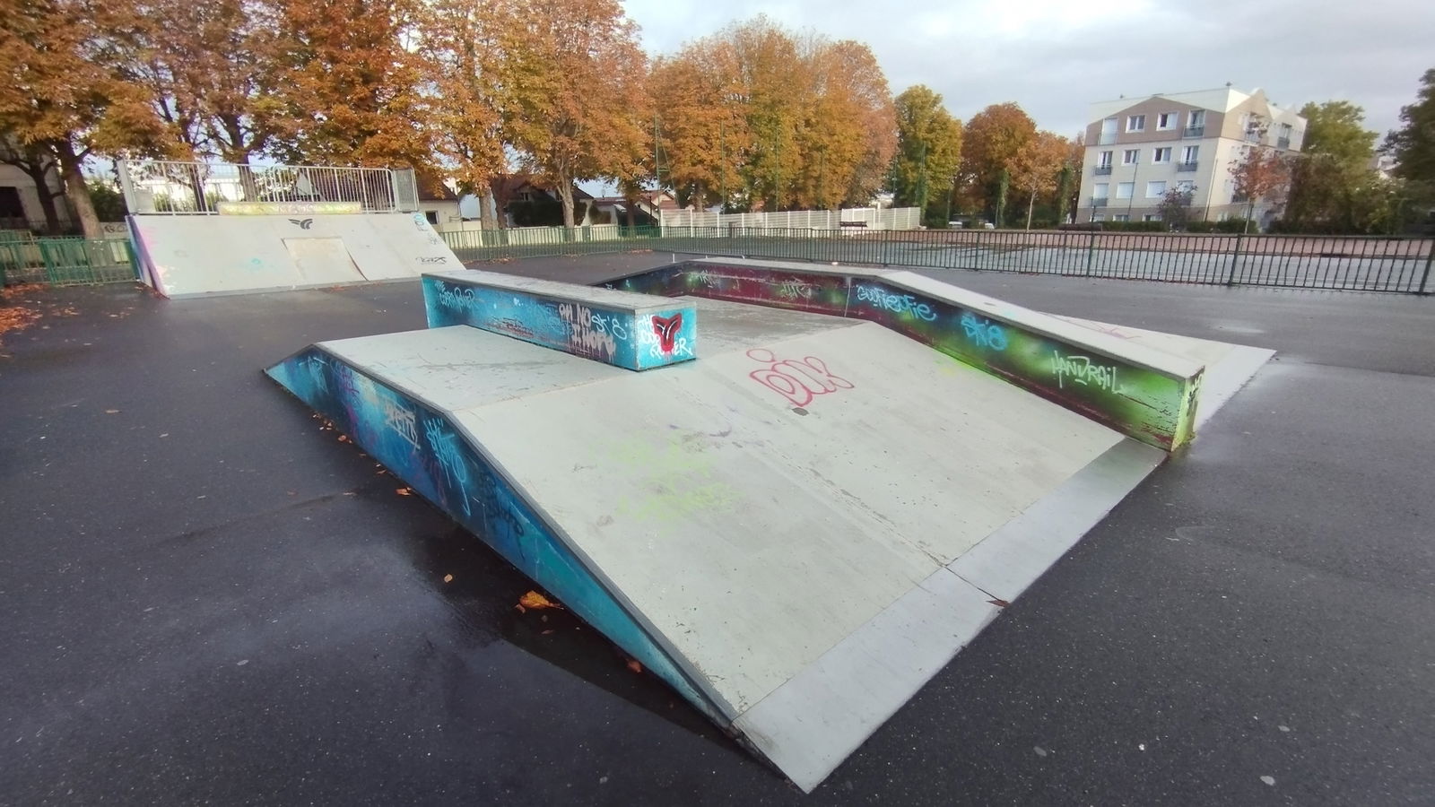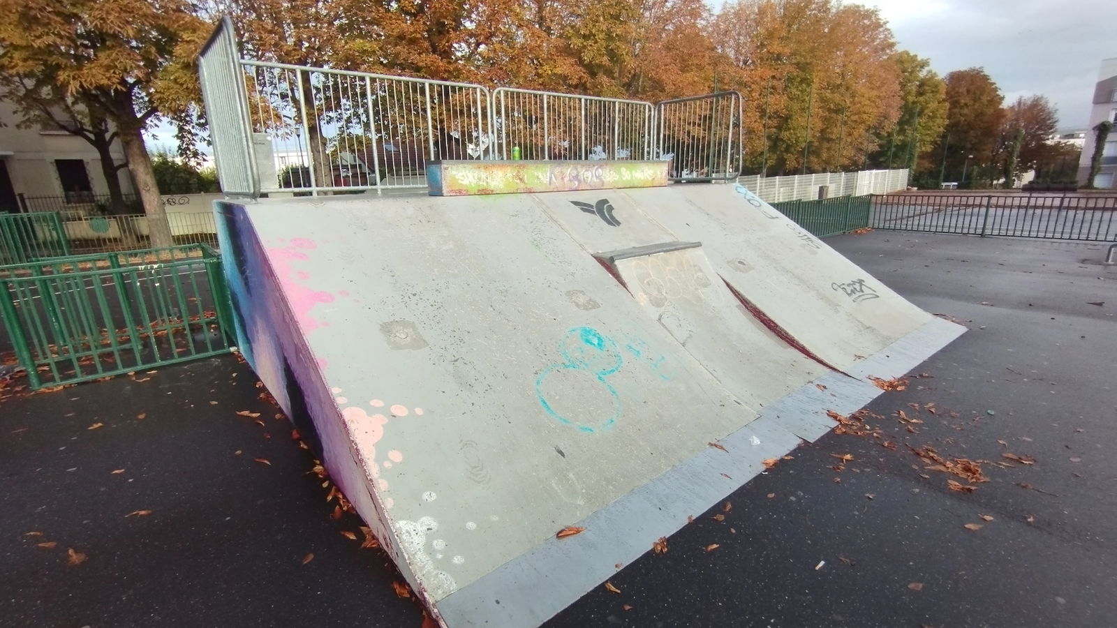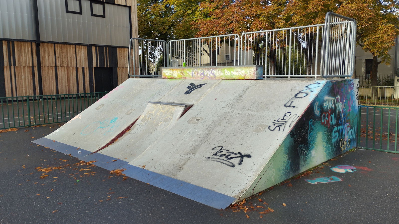 Nanterre PVC skatepark is made up of a back and forth run with a quarter pipe and flat bank on either side of a funbox.