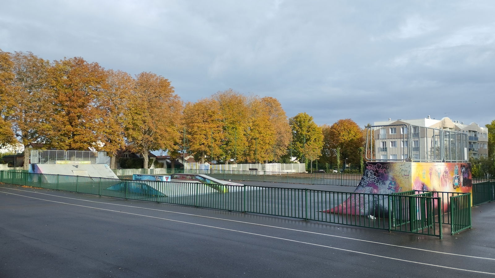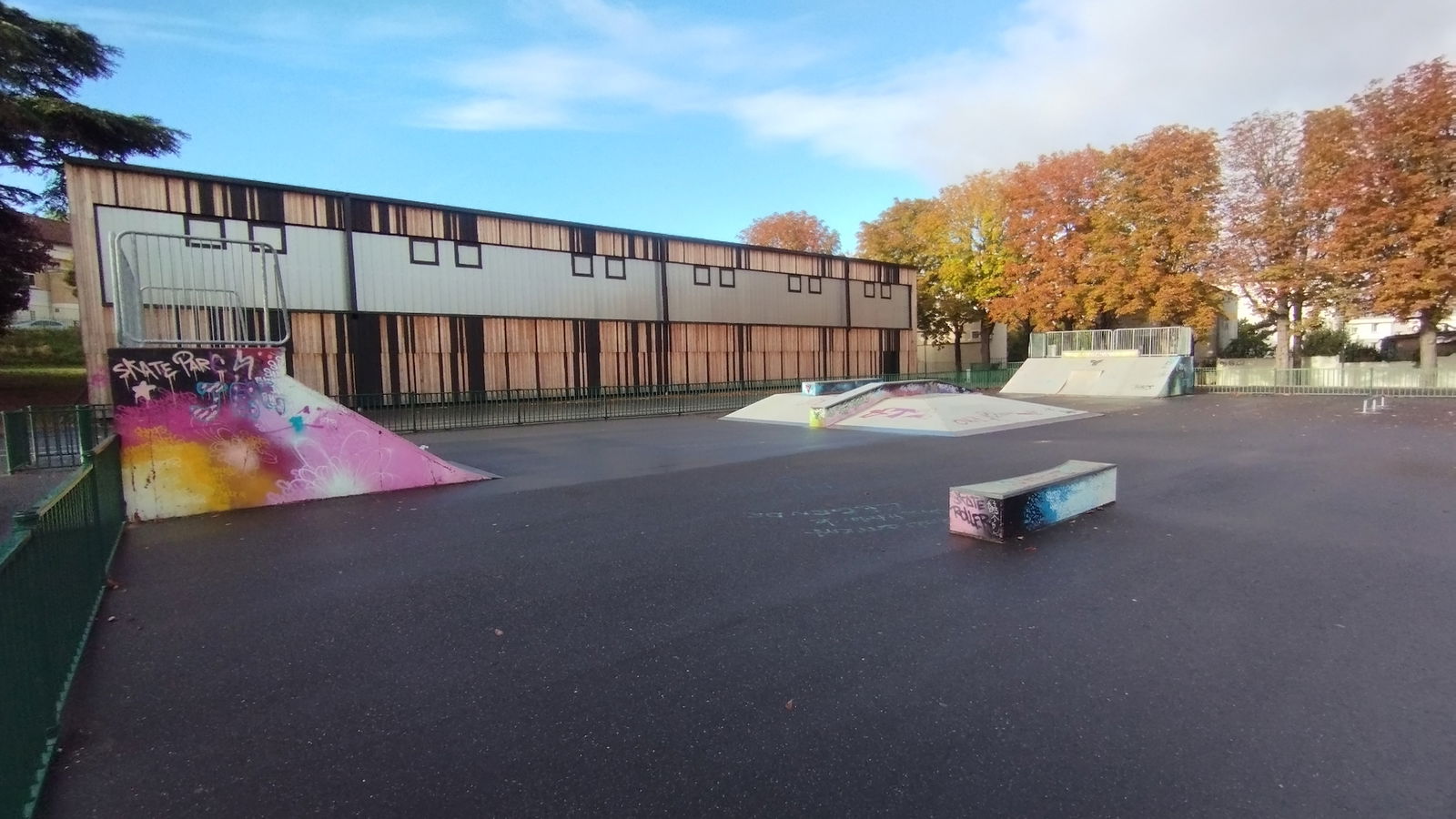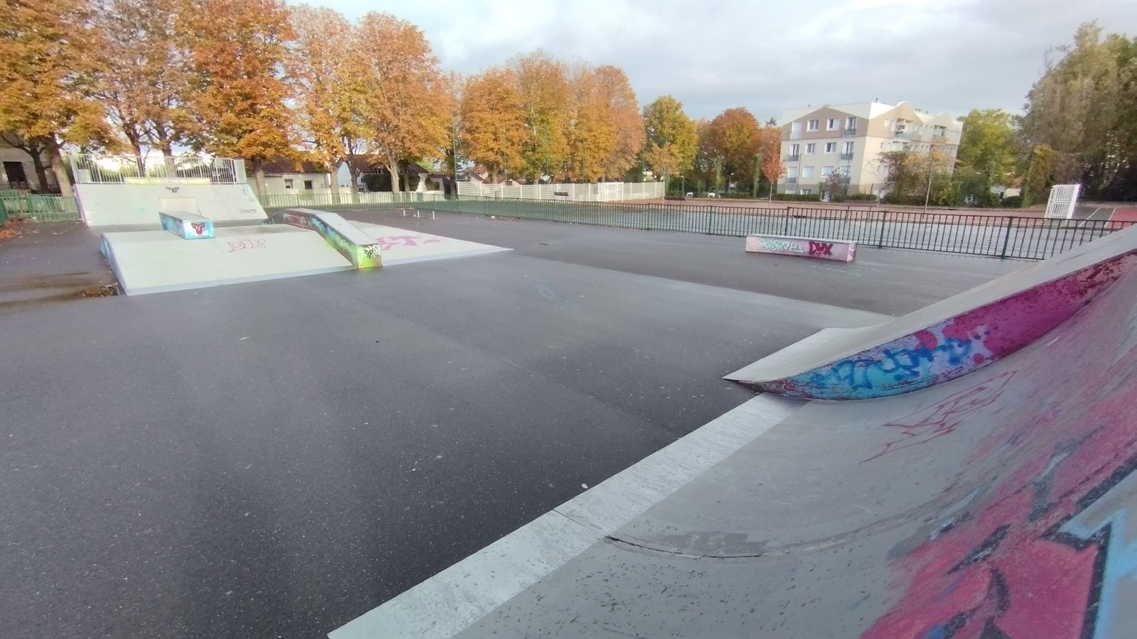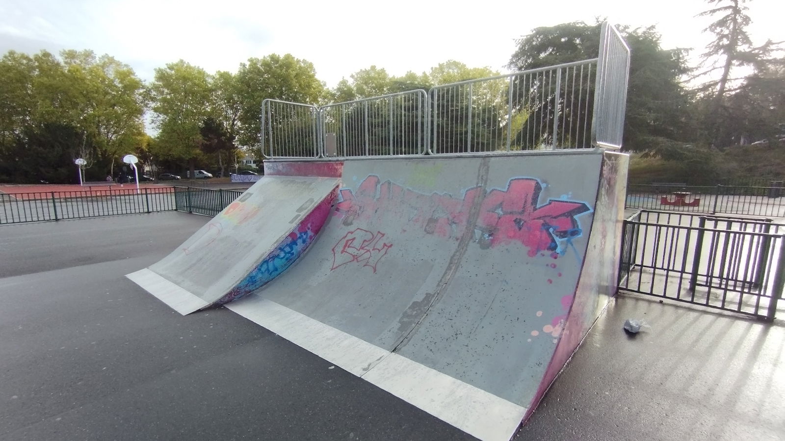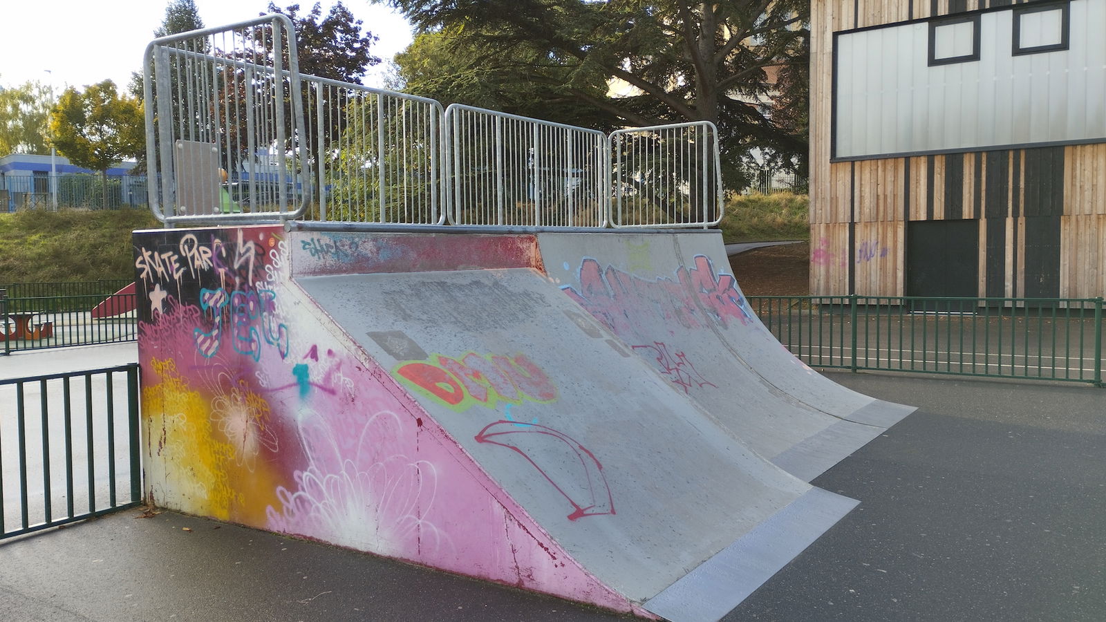 Nanterre PVC skatepark is made up of a back and forth run with a quarter pipe and flat bank on either side of a funbox.