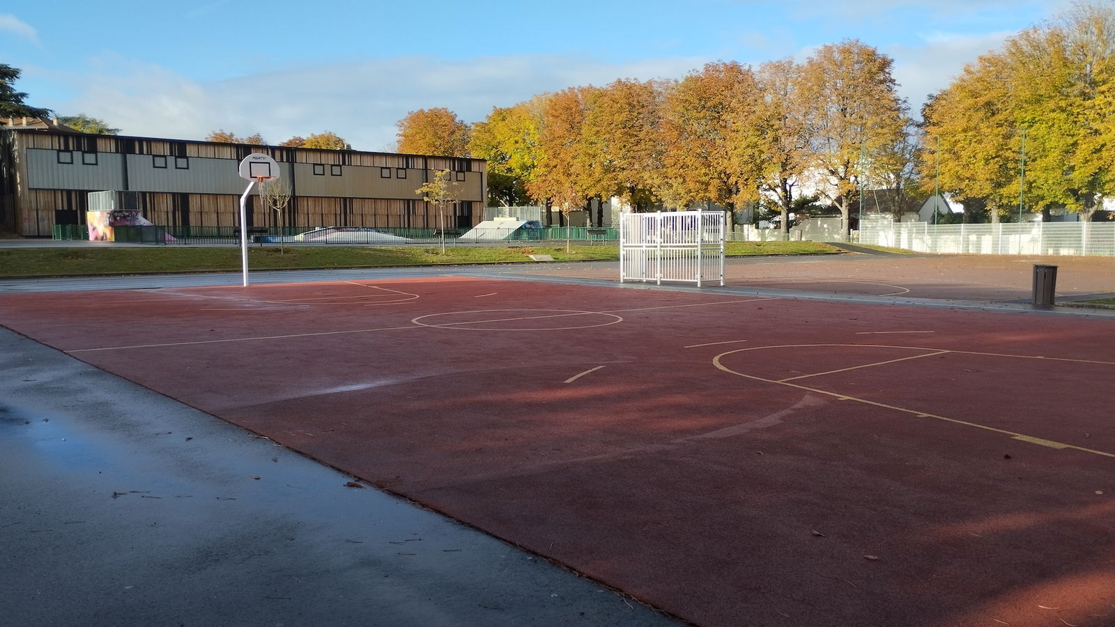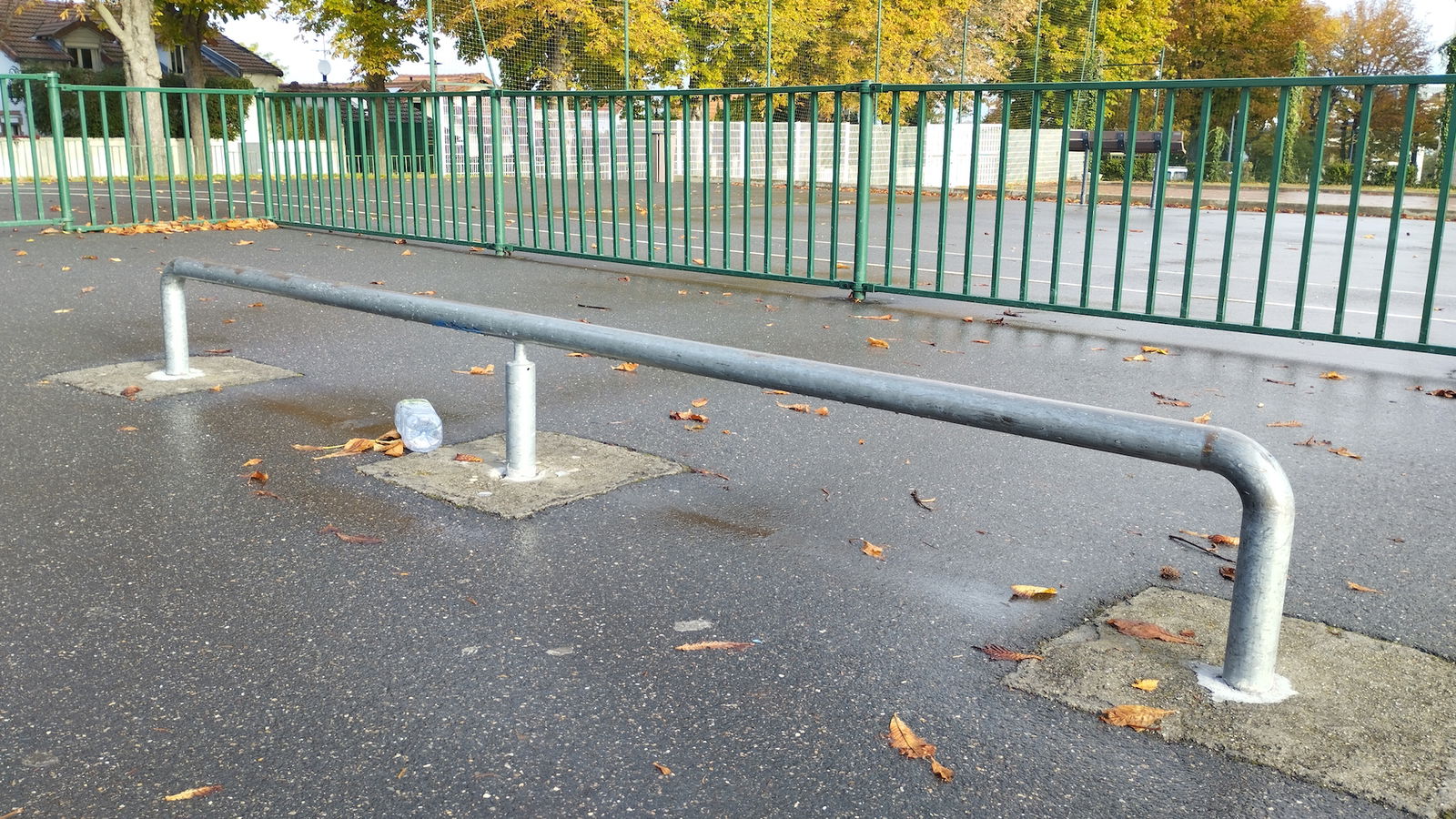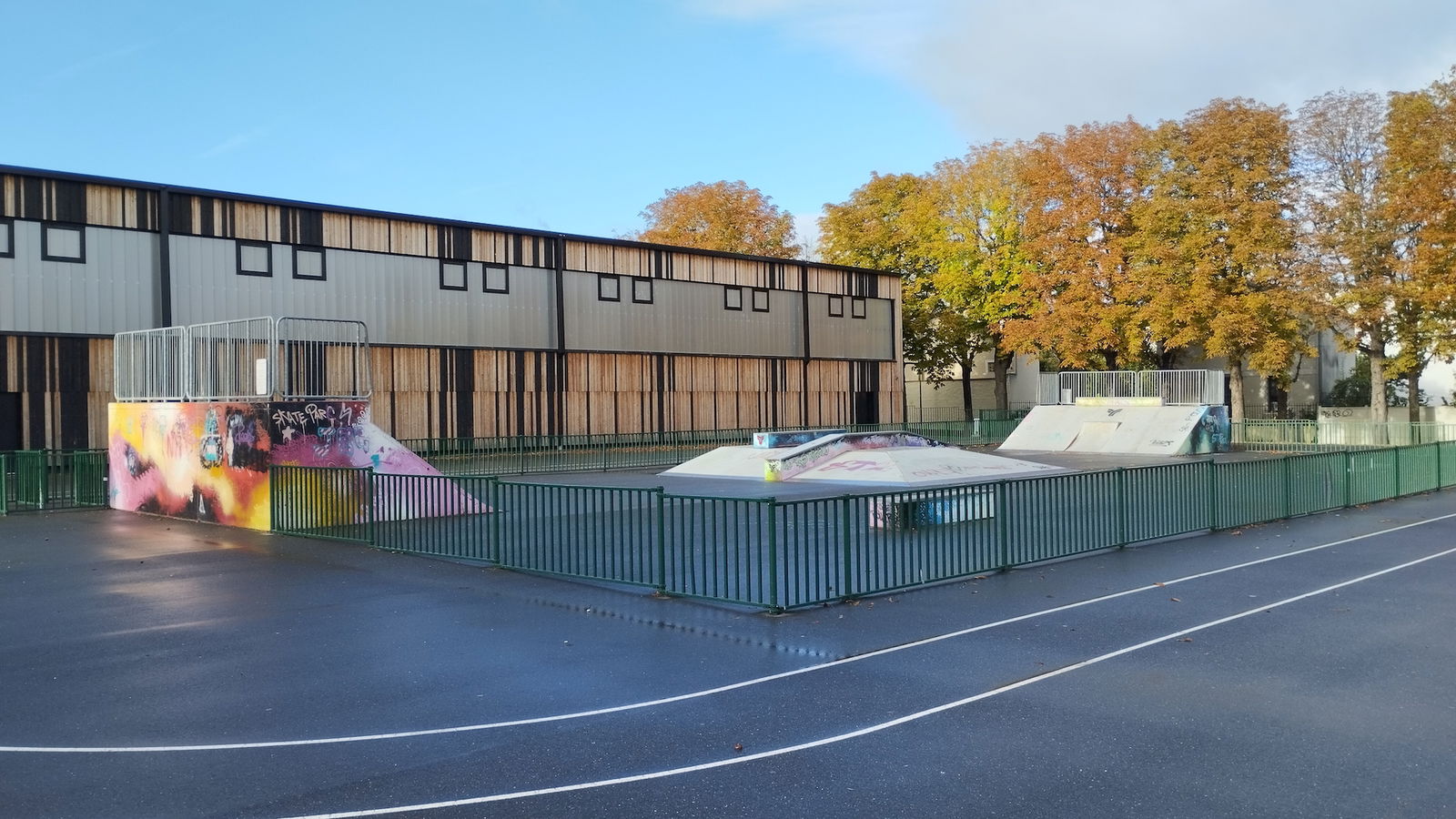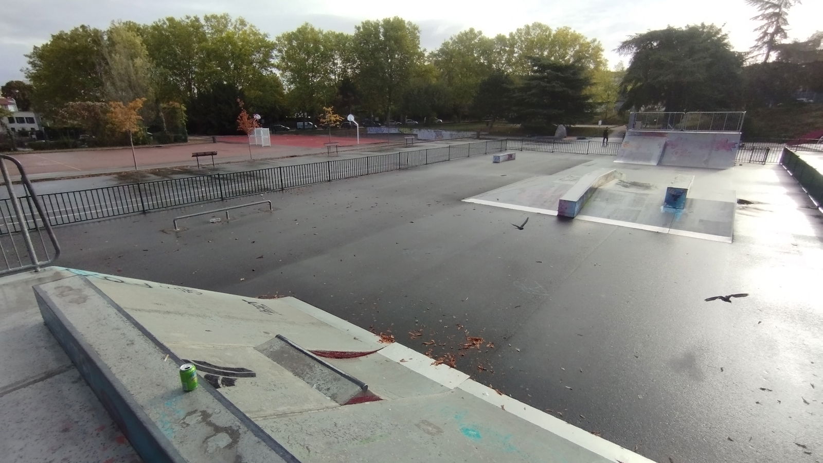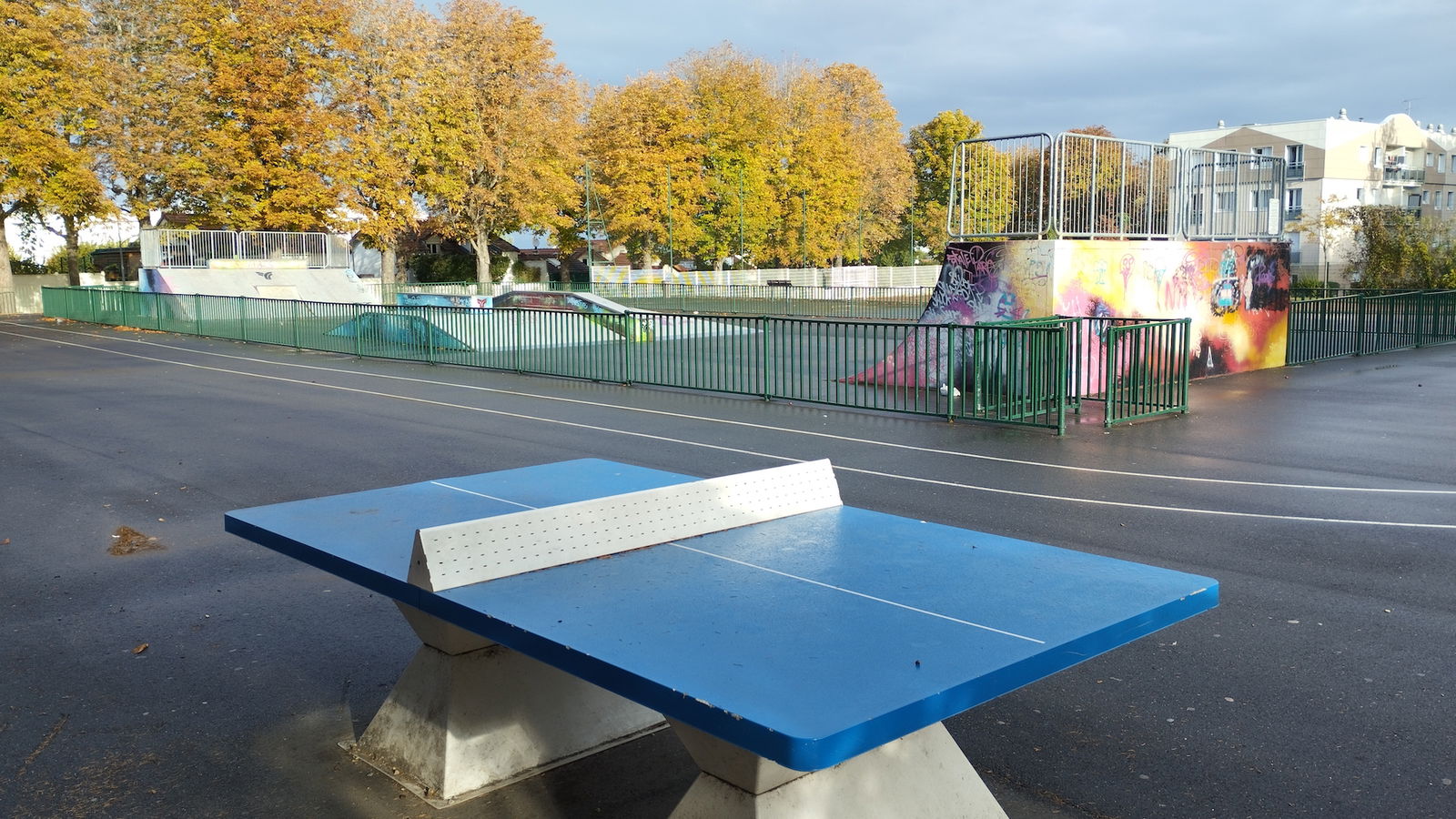 Nanterre PVC skatepark is made up of a back and forth run with a quarter pipe and flat bank on either side of a funbox.