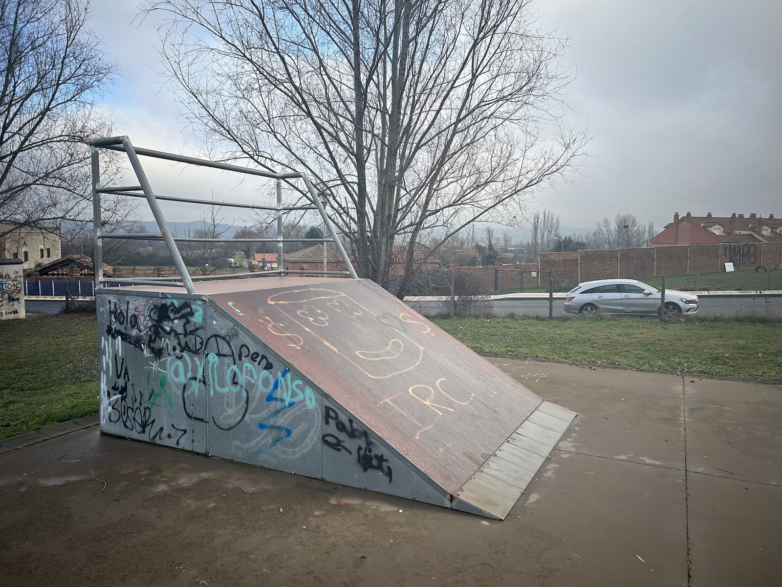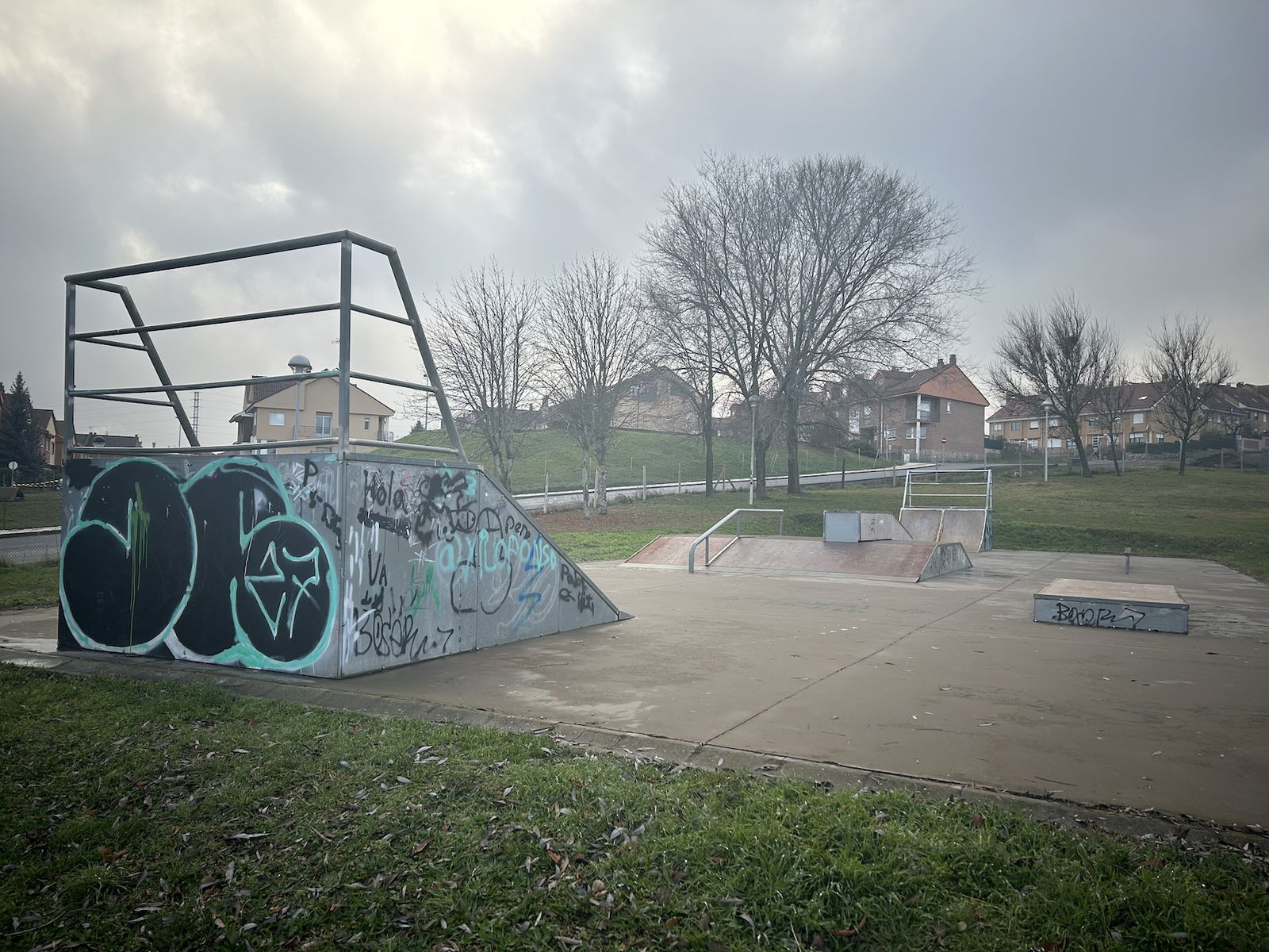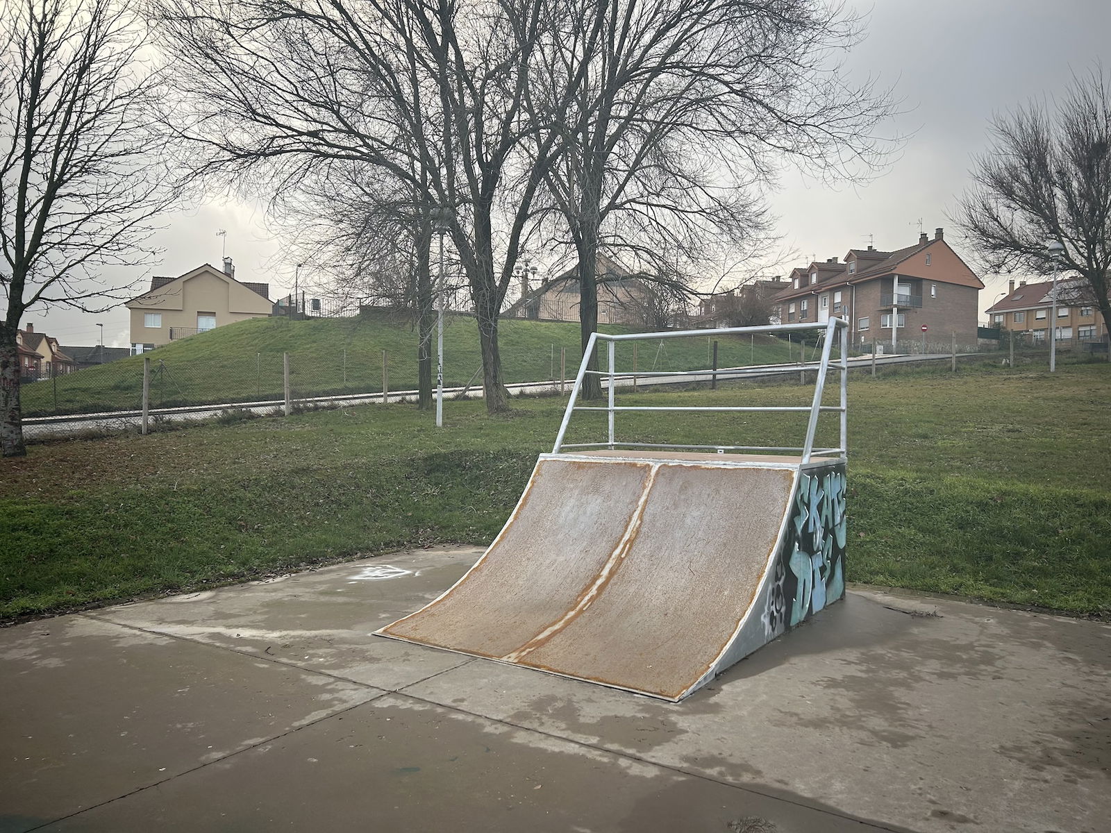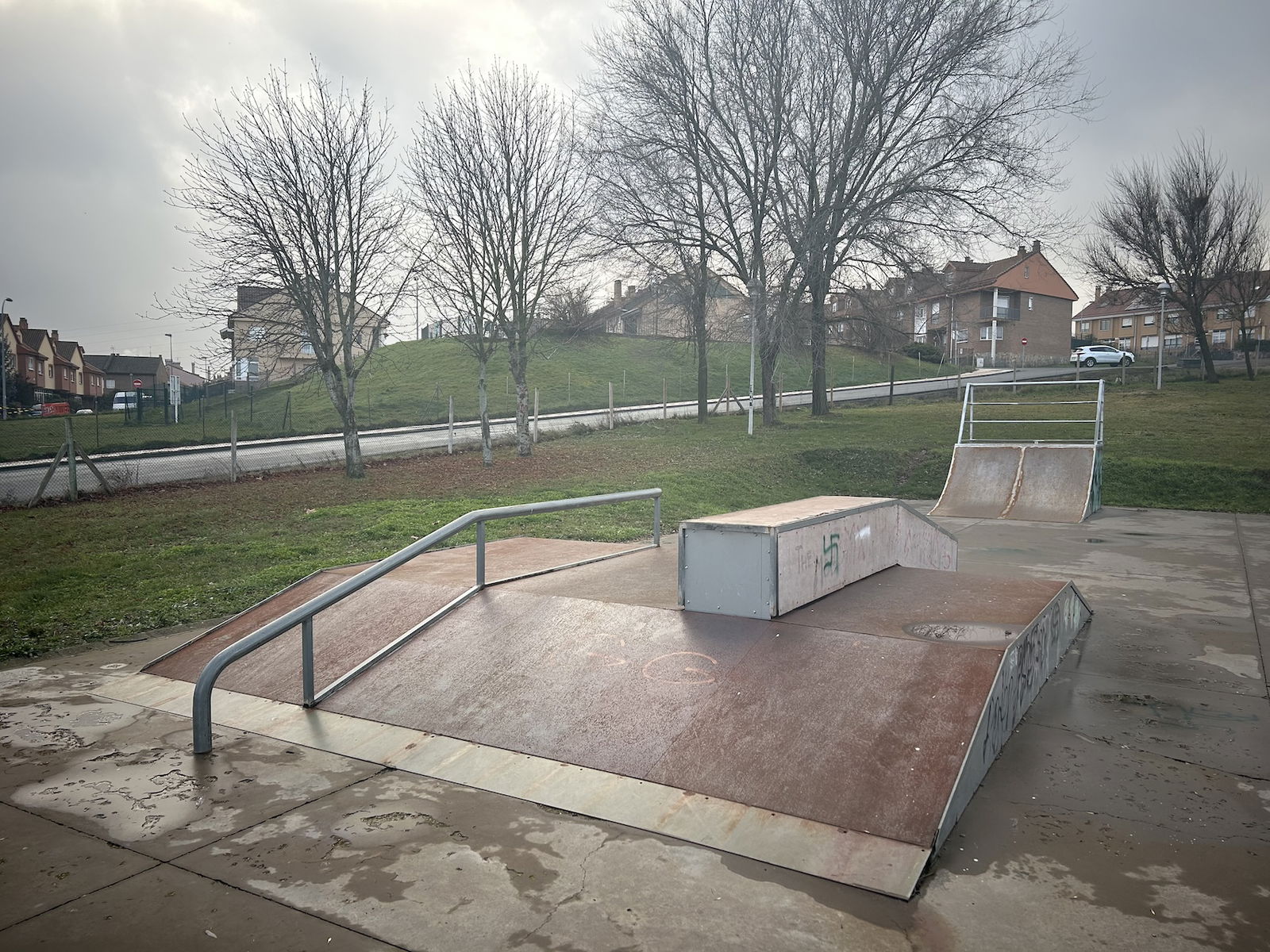 Navatejera skatepark is made up of a back and forth run with a quarter pipe and bank on the sides of a funbox.