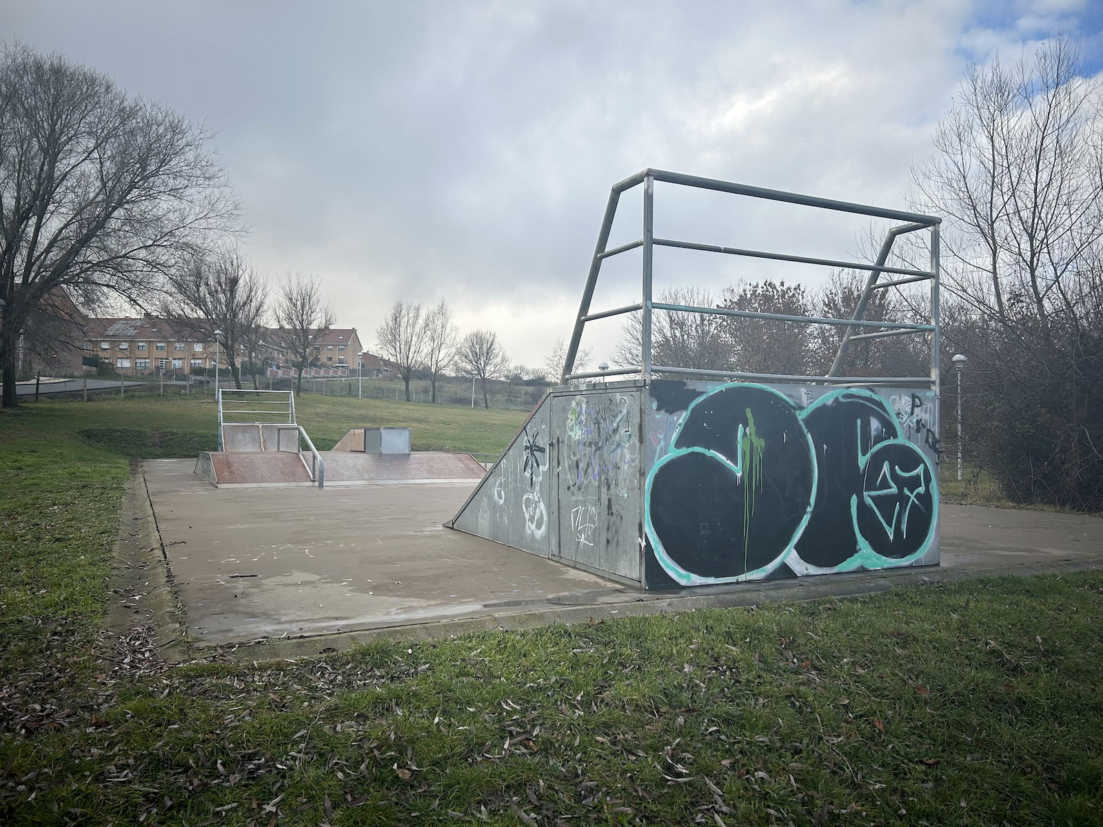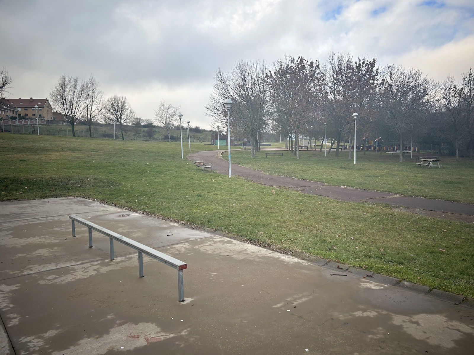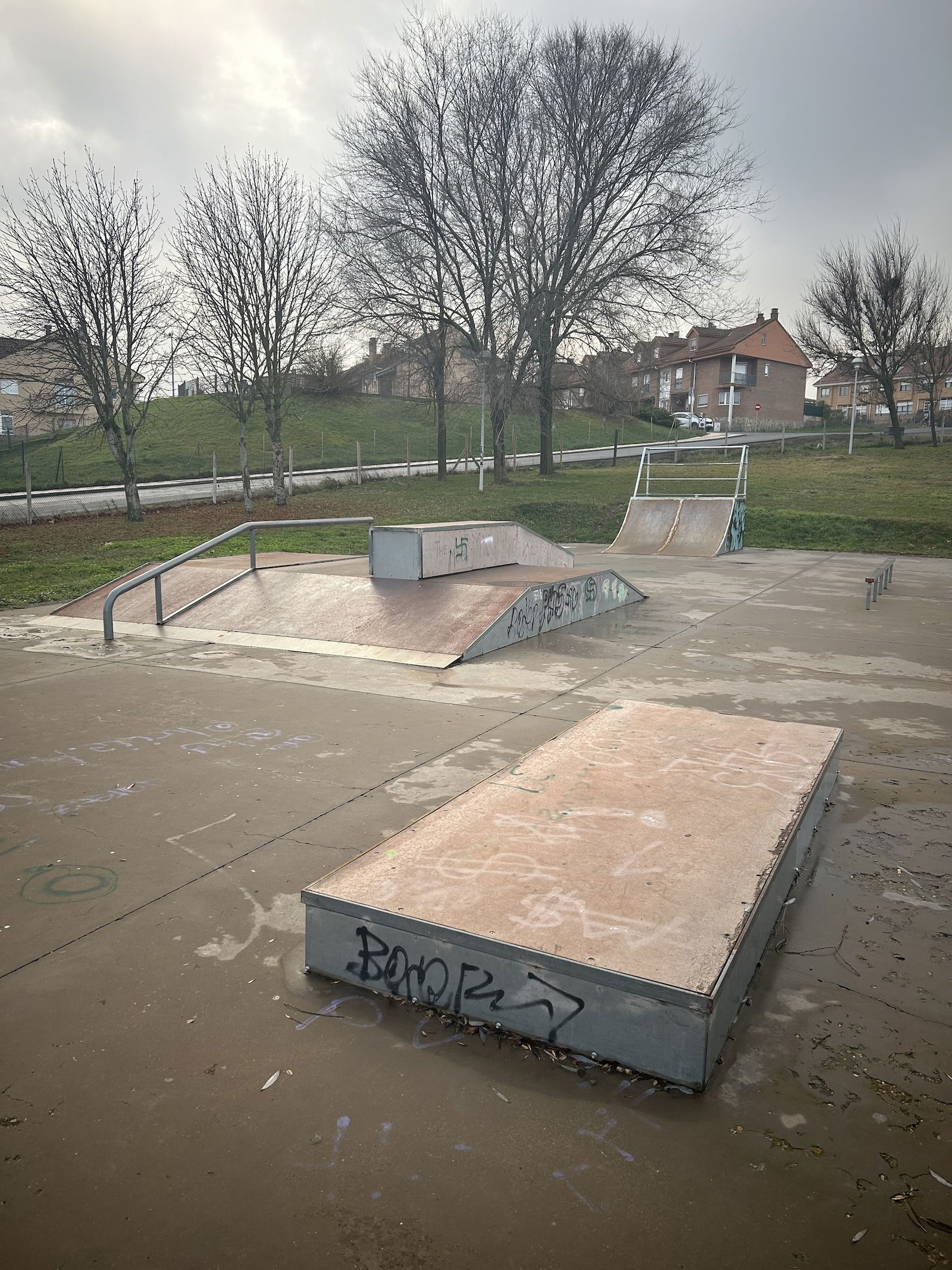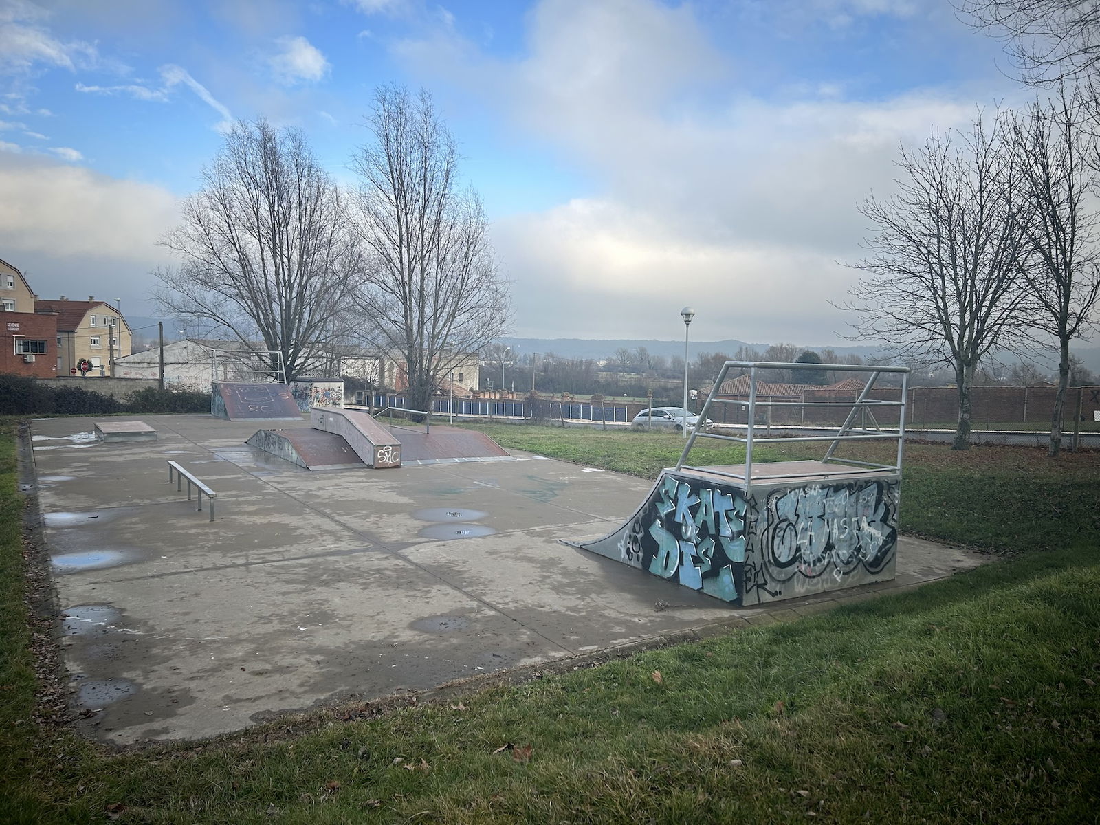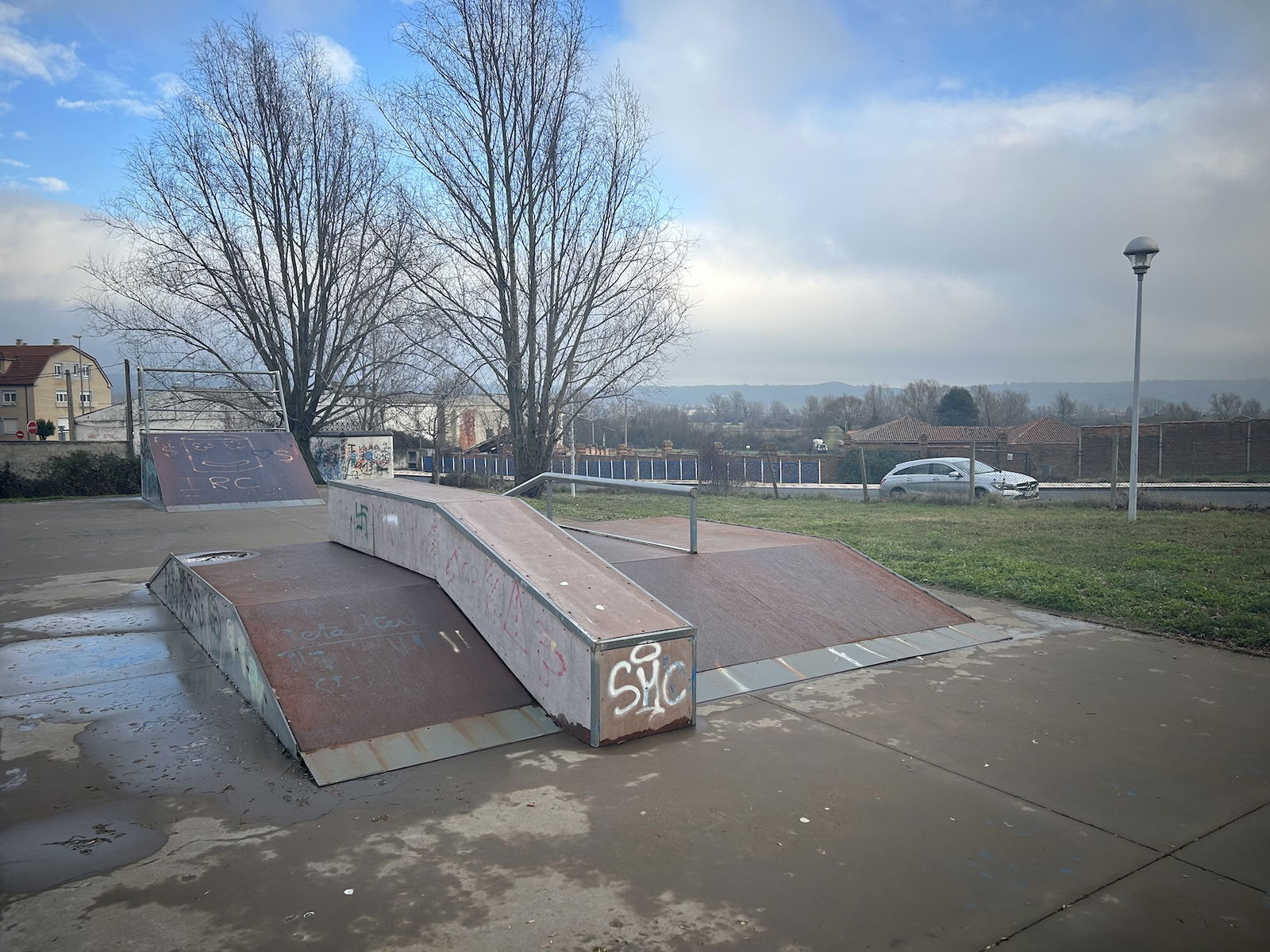 Navatejera skatepark is made up of a back and forth run with a quarter pipe and bank on the sides of a funbox.