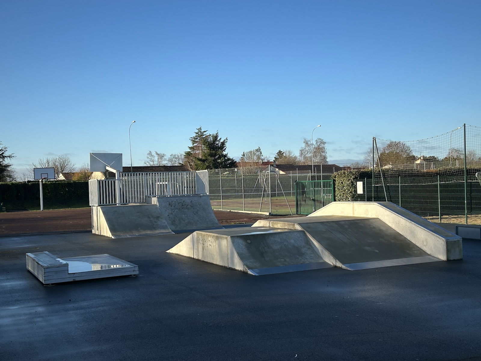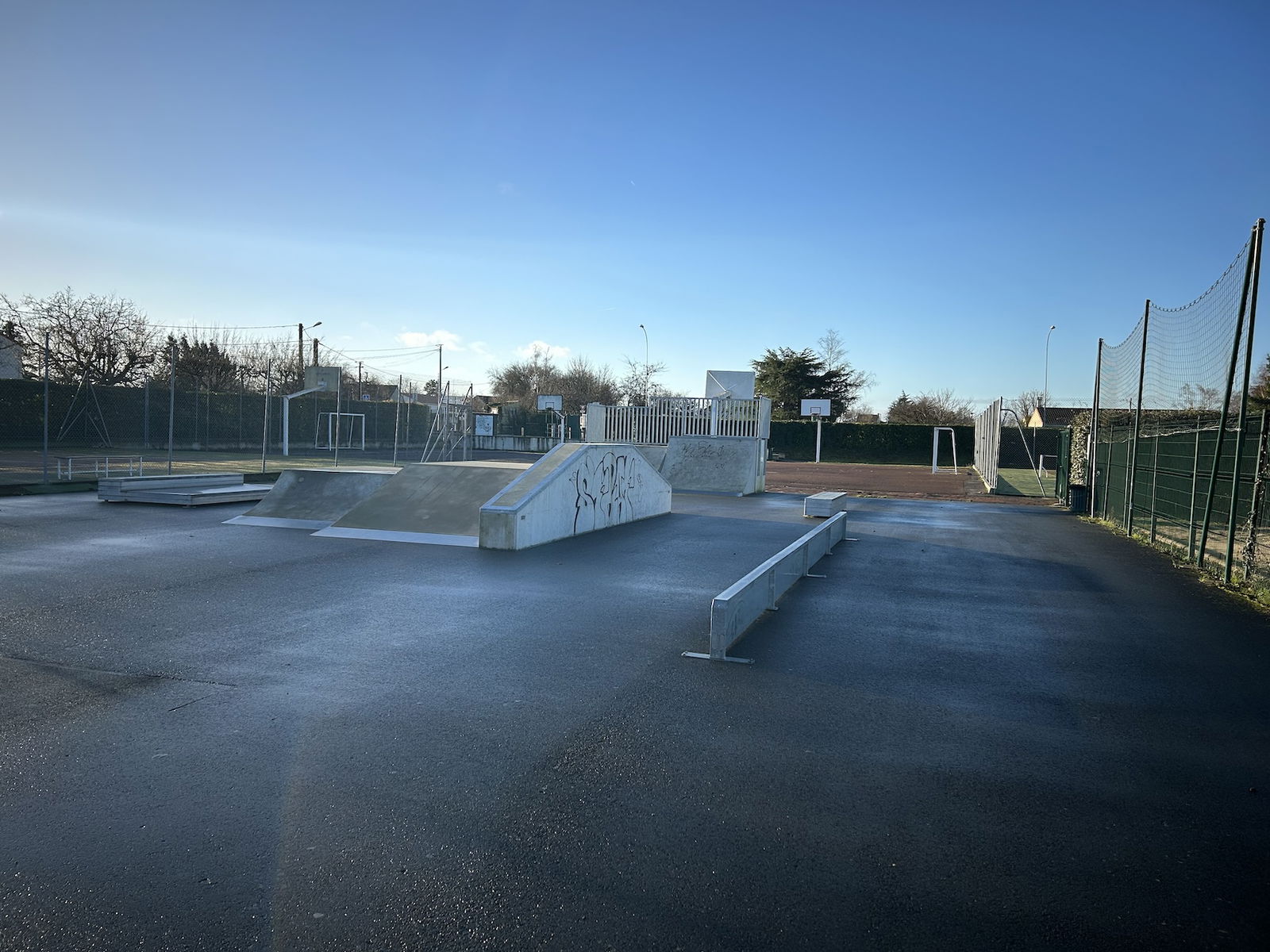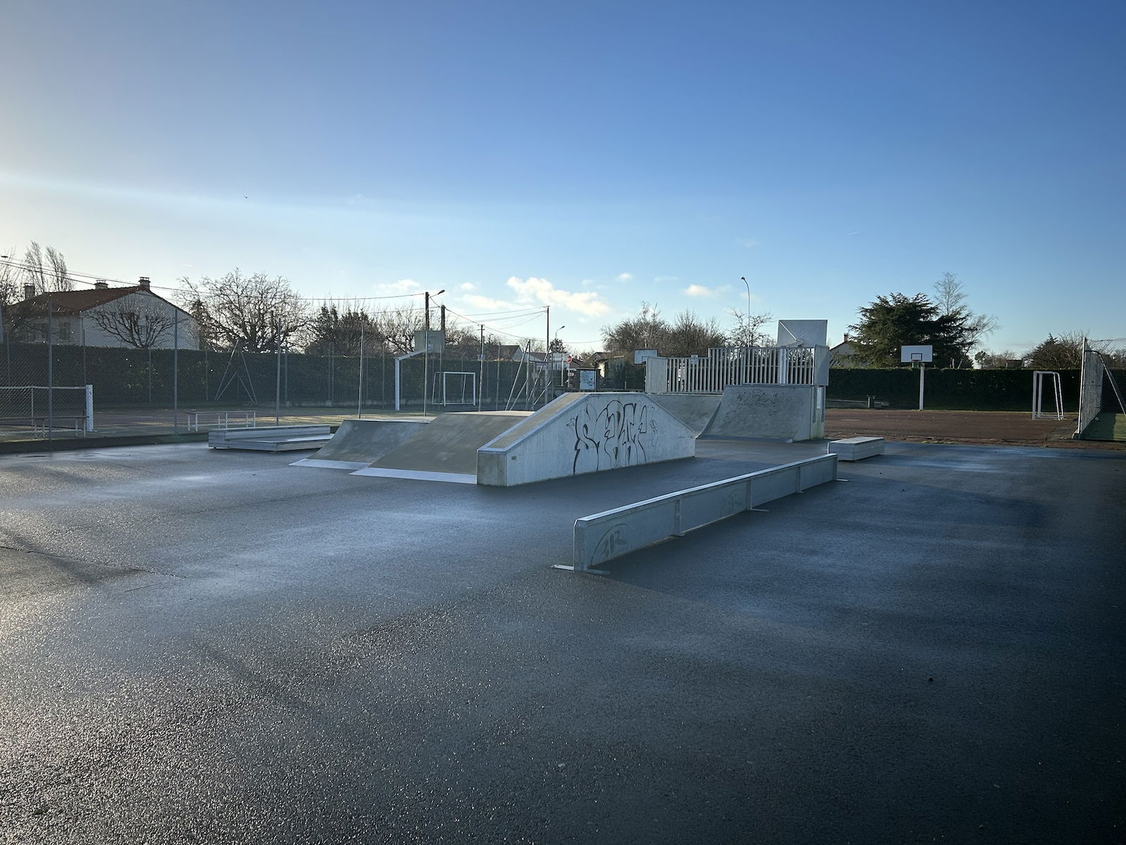 Neuville de Poitou skatepark is made up of a back and forth run with a quarter pipe and bank on the sides of a funbox.