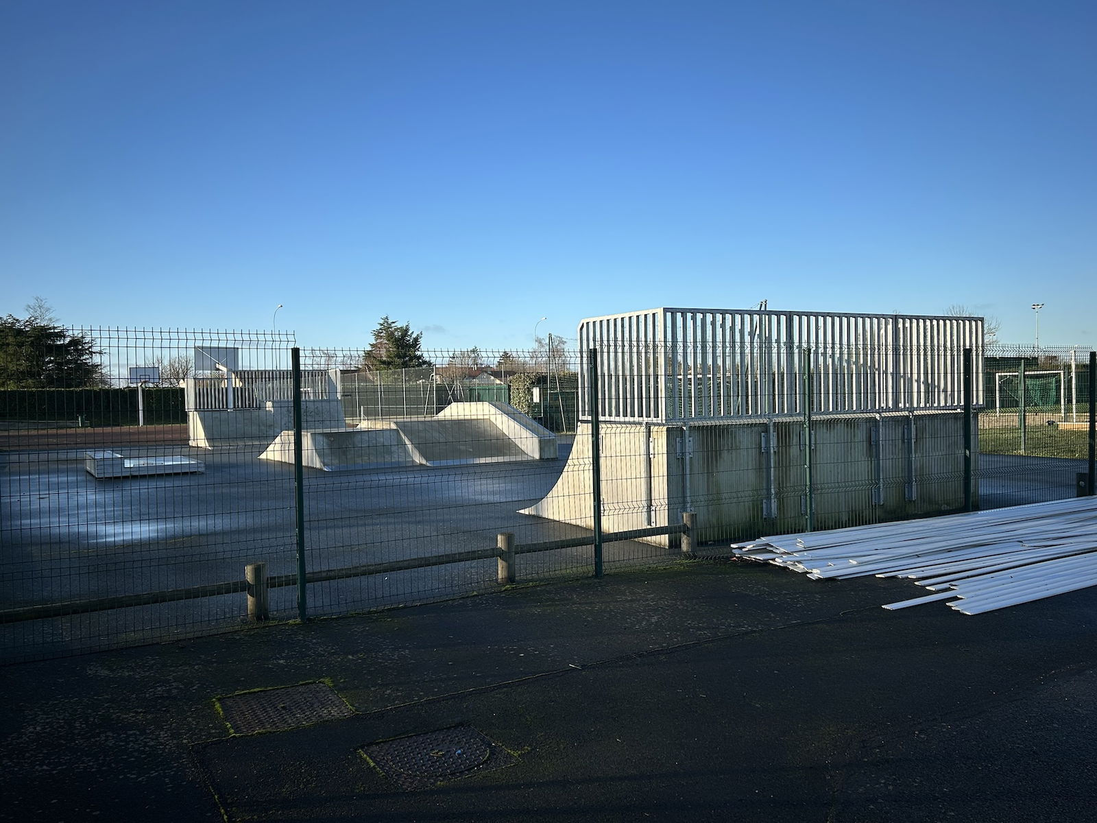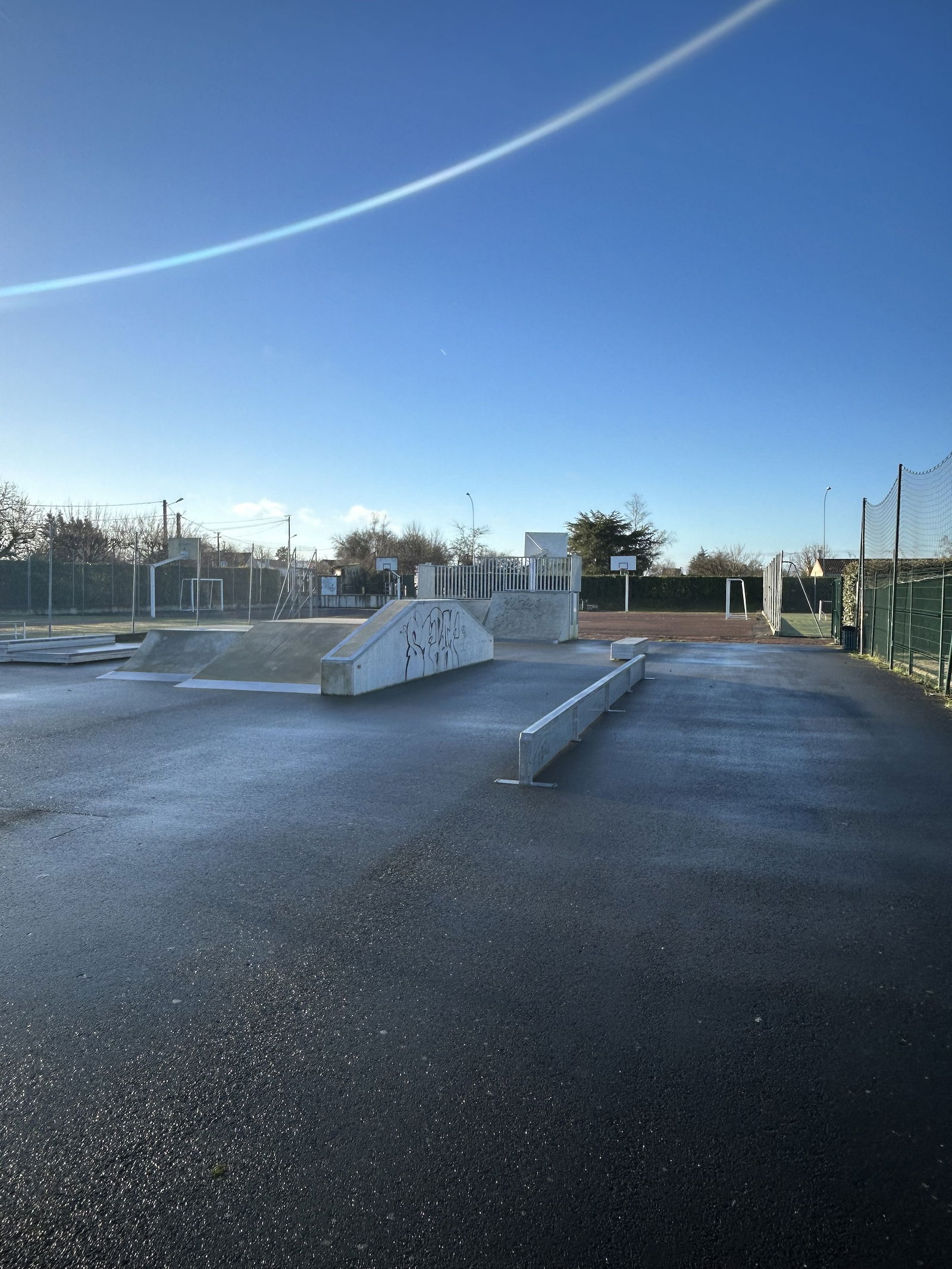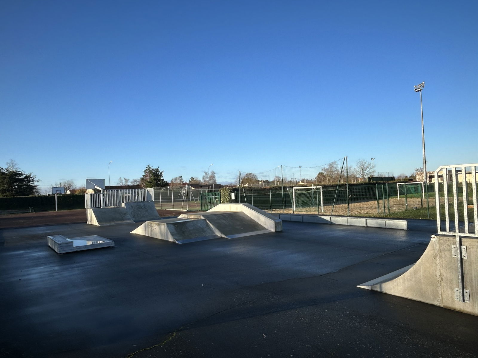 Neuville de Poitou skatepark is made up of a back and forth run with a quarter pipe and bank on the sides of a funbox.