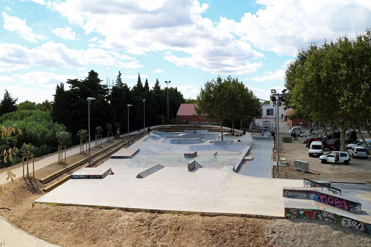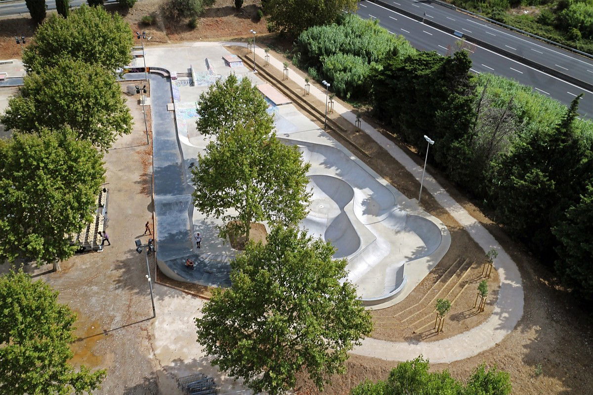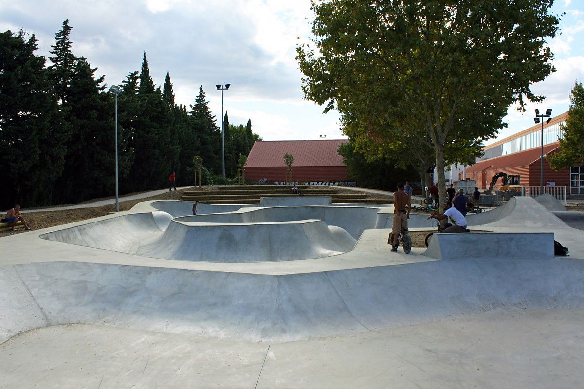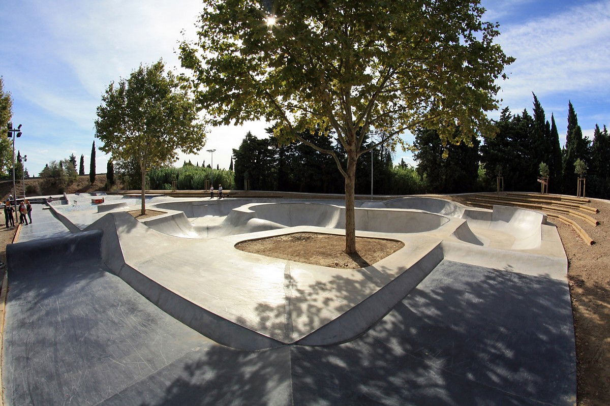 The 2150 m² Nimes skatepark was designed and built by Constructo Skateparks in 2013 who teamed up with Site et Paysage for the mandatory landscaping. Total estimated cost: 495000€ (fase 1 and 2).