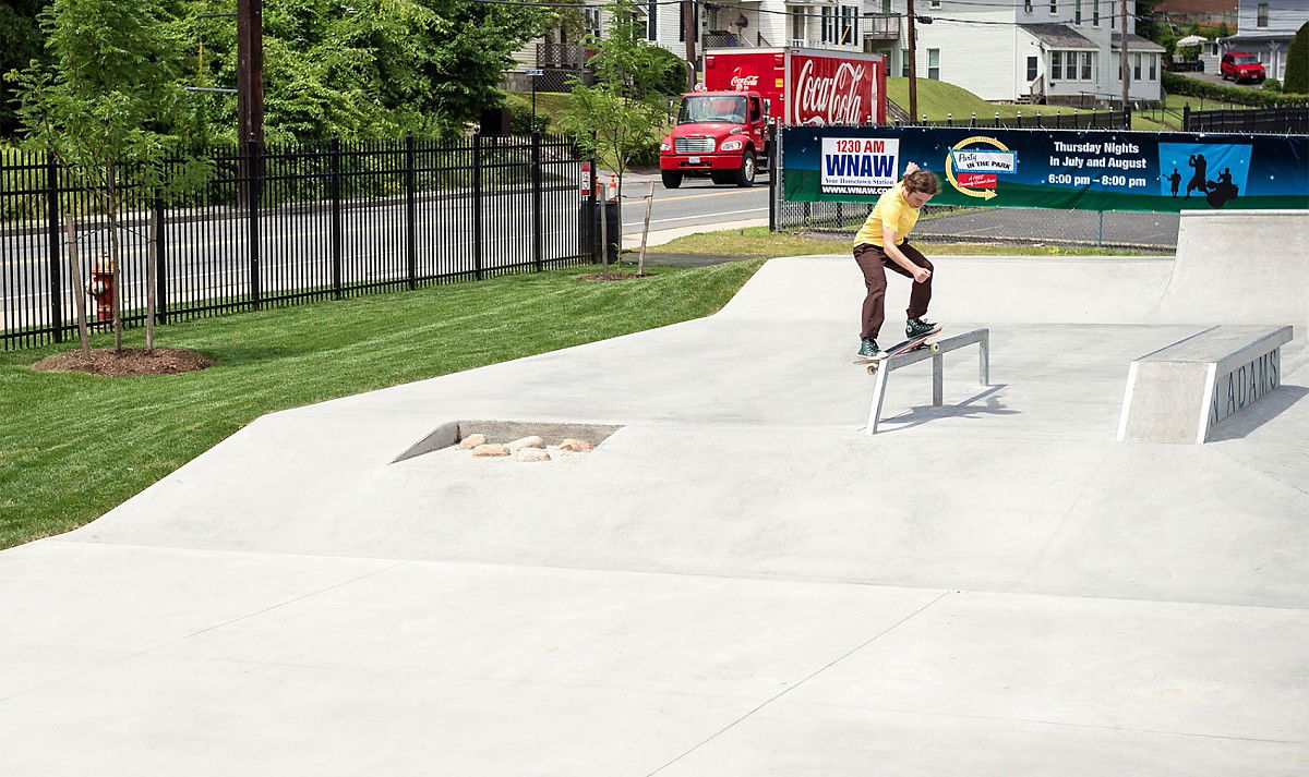 The North Adams Skatepark, also known as the UNITY Skatepark, is located at 310 State Street in North Adams, Massachusetts. Officially opened in 2017, the park spans 11,000 square feet and was designed and built by SpohnRanch, a renowned skatepark construction company. The park features a well-designed layout that accommodates a range of skating styles and skill levels. It offers a mix of street and transition elements, including quarter pipes, banks, stairs, ledges, and unique tributes to local landmarks, such as a skateable version of the Mount Greylock War Memorial and a replica of the Hoosac Tunnel.