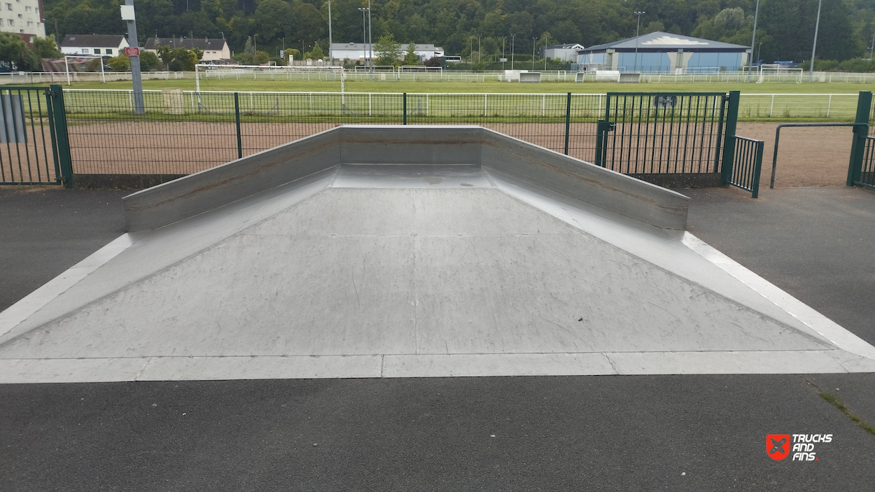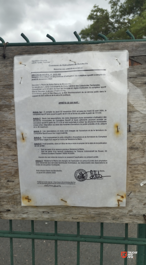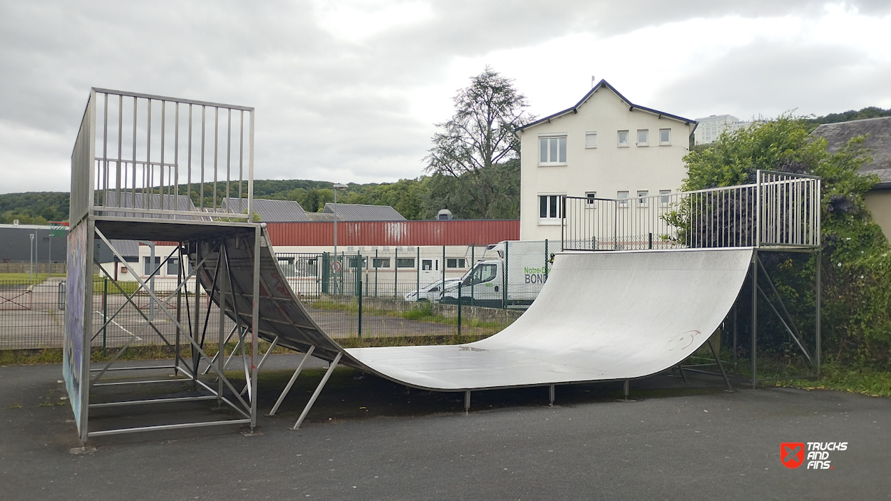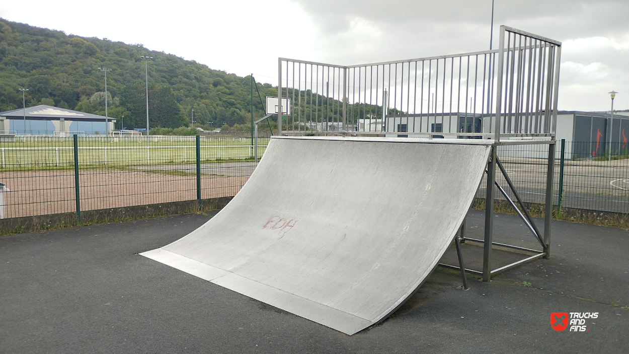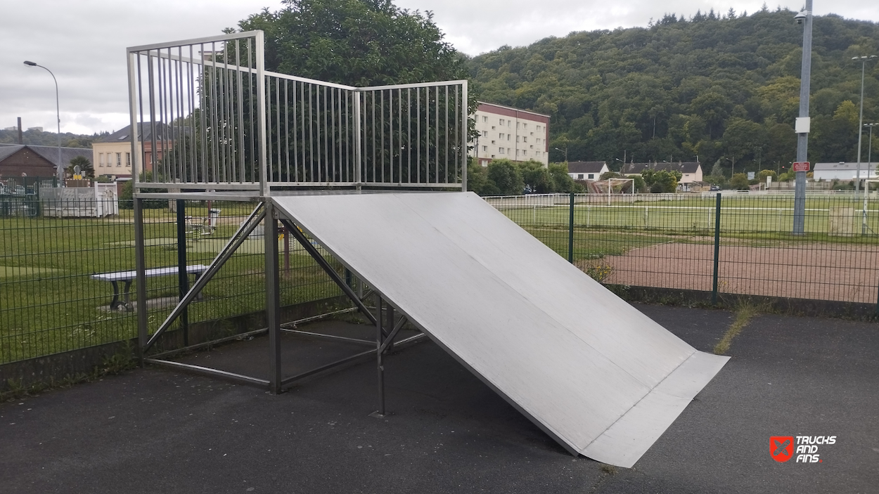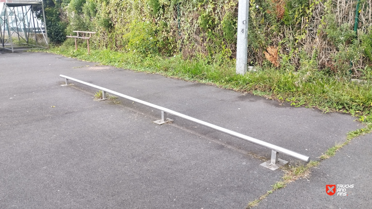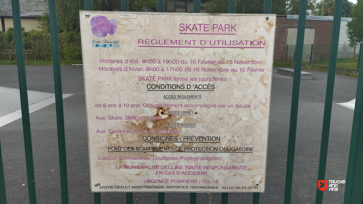 Notre-Dame-de-Bondeville skatepark is made up of a back and forth run with a quarter pipe and flat bank on either side of a funbox. The skatepark also features a miniramp.
