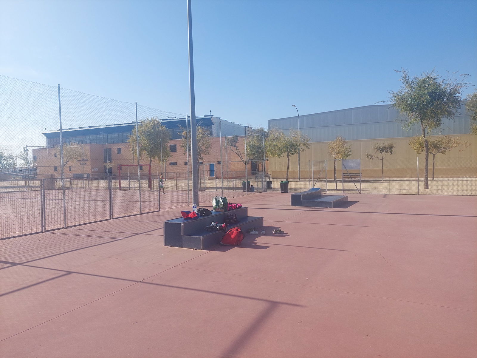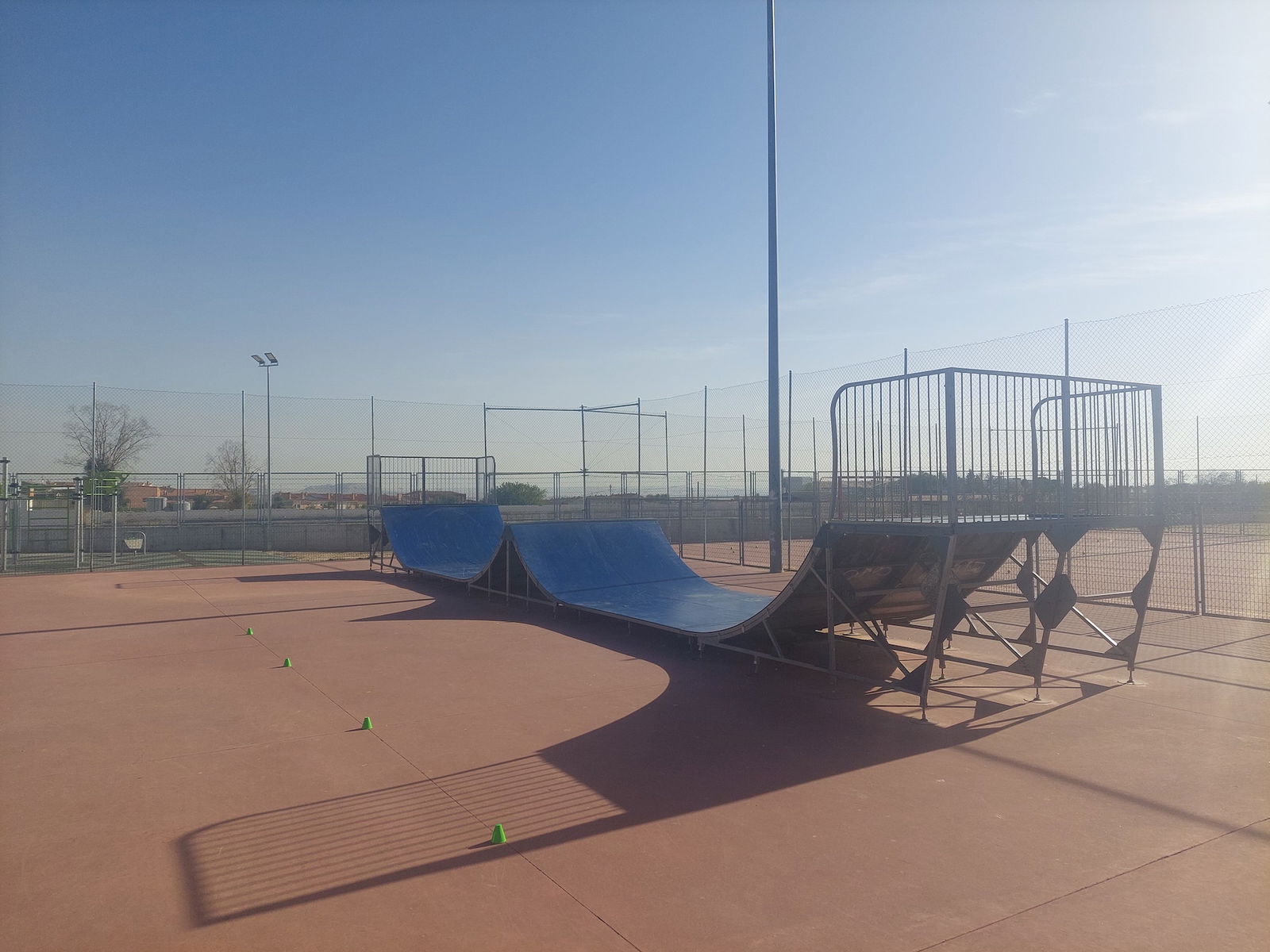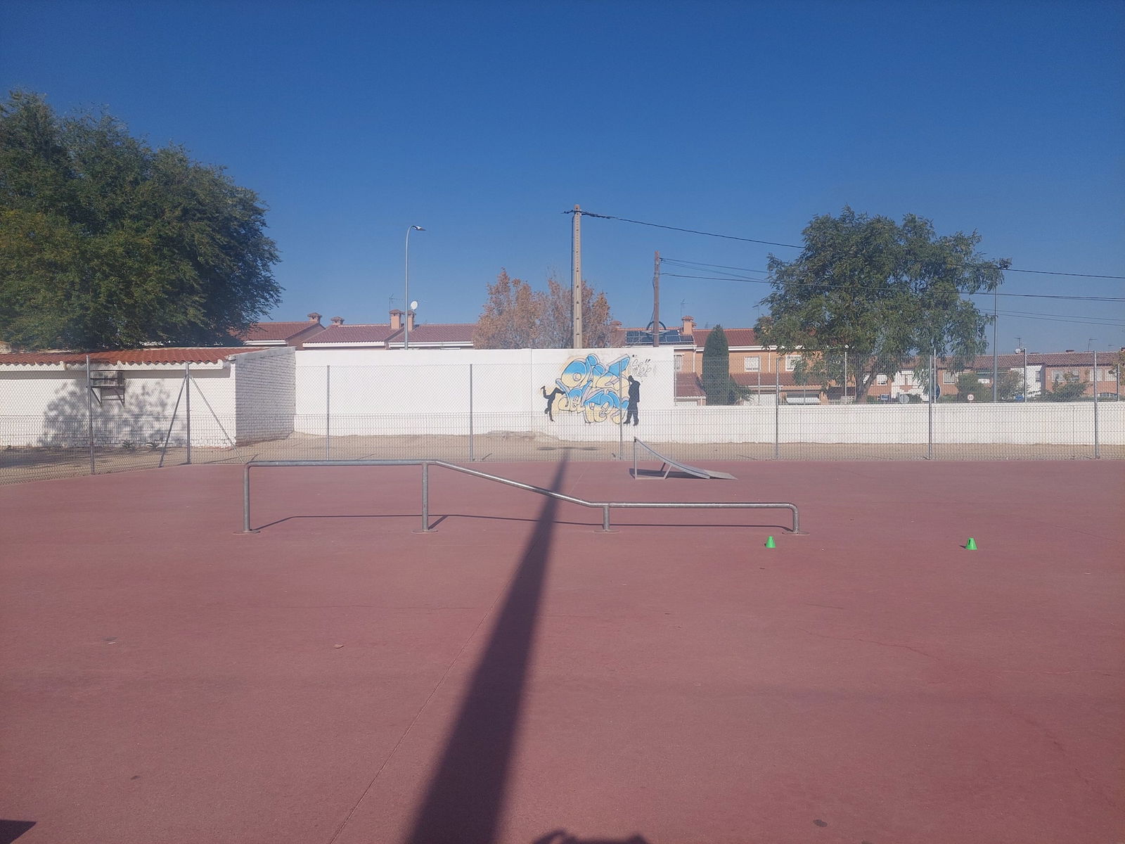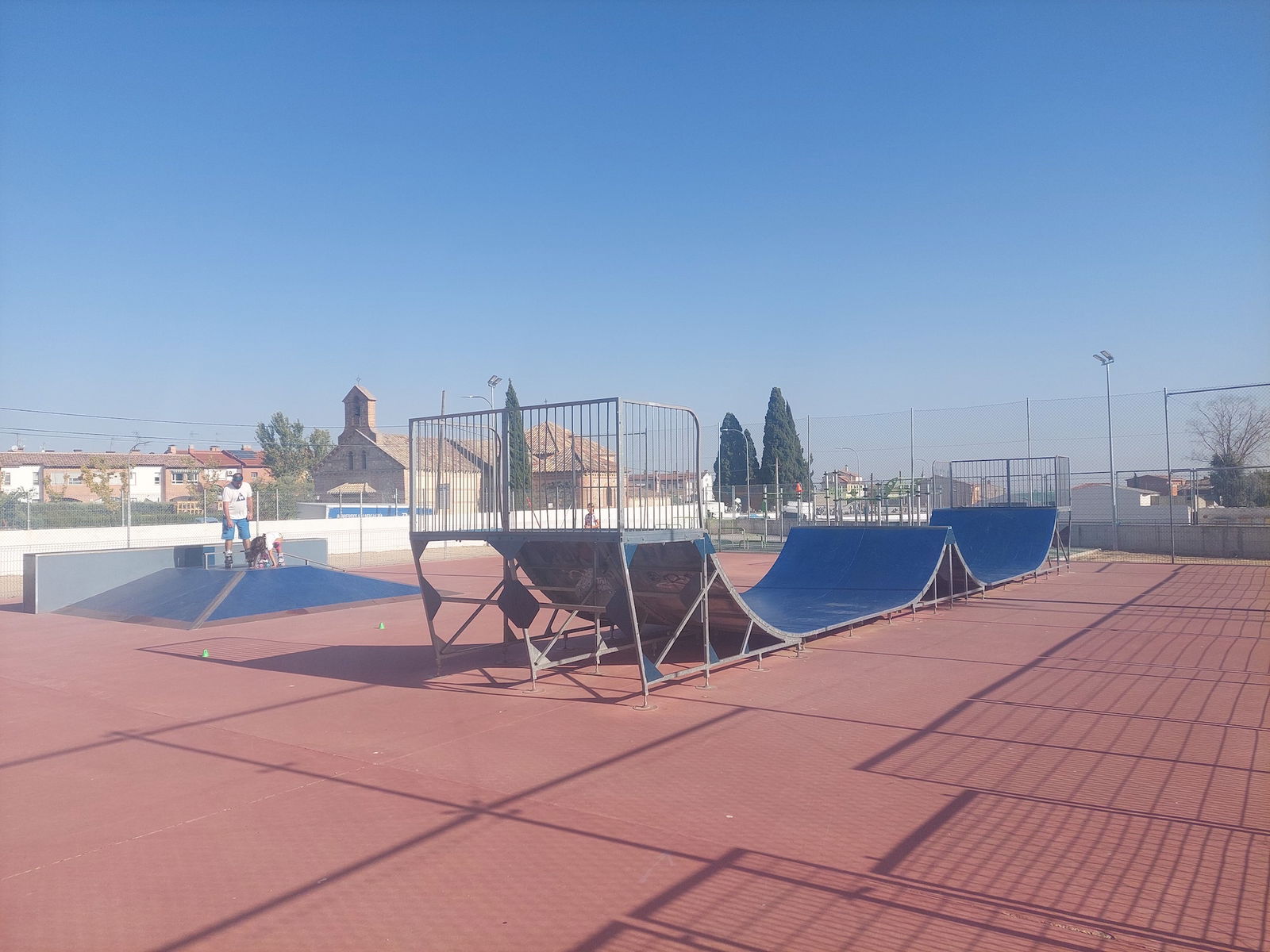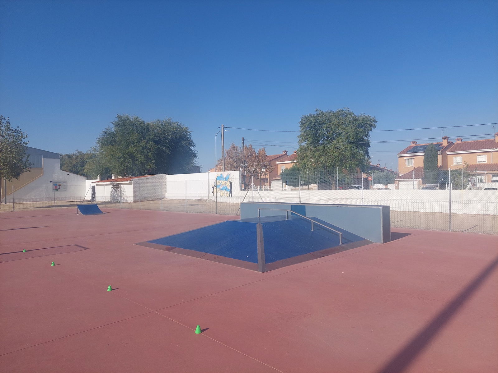 Olías del Rey Skatepark features a miniramp with spine and several basic skateboarding obstacles.
