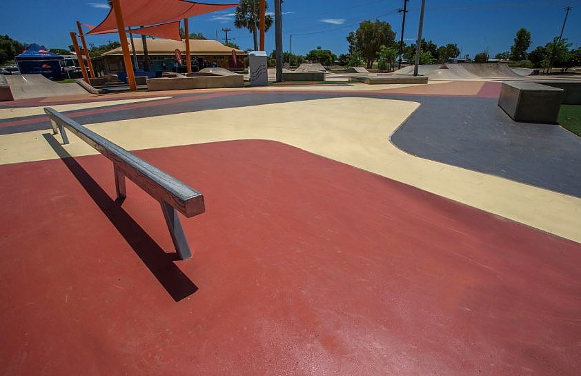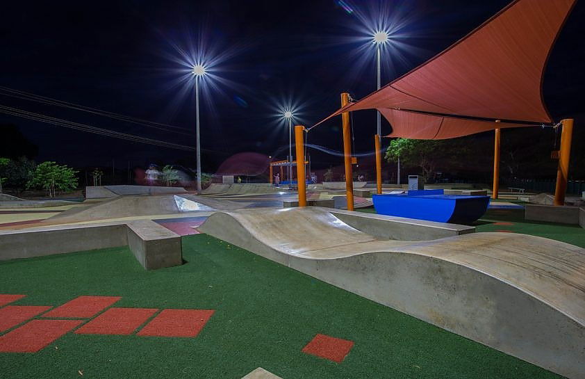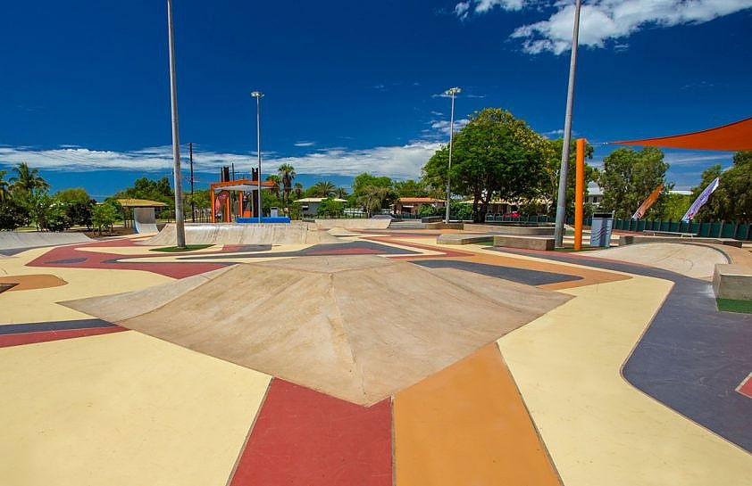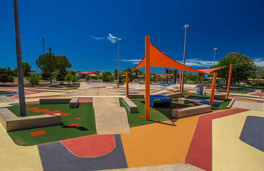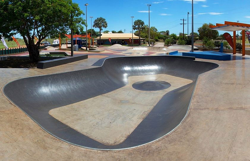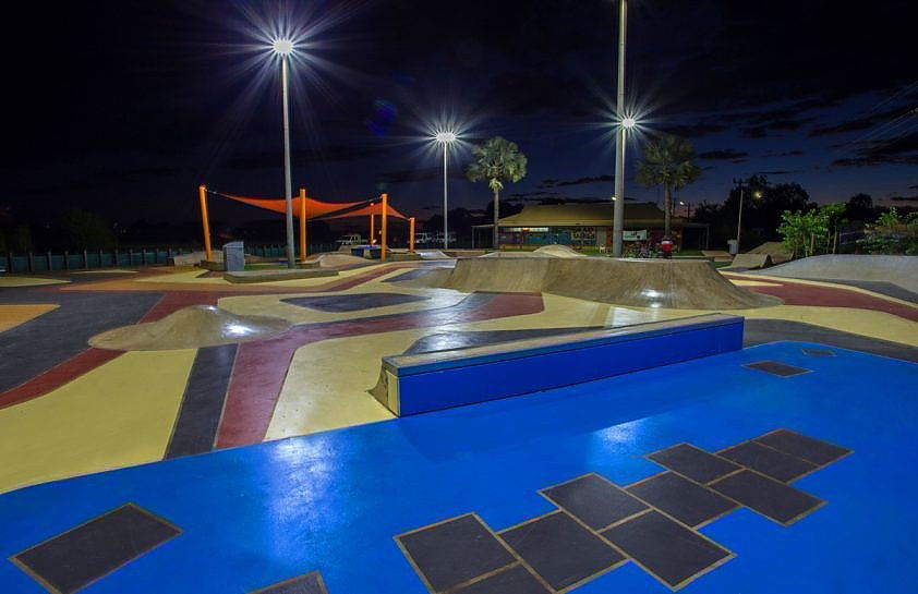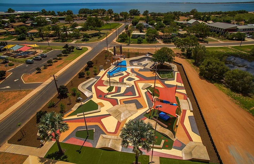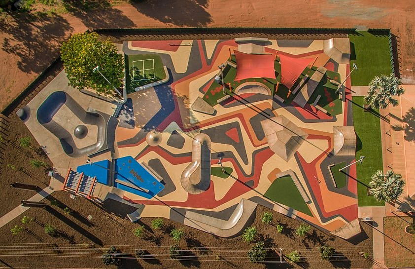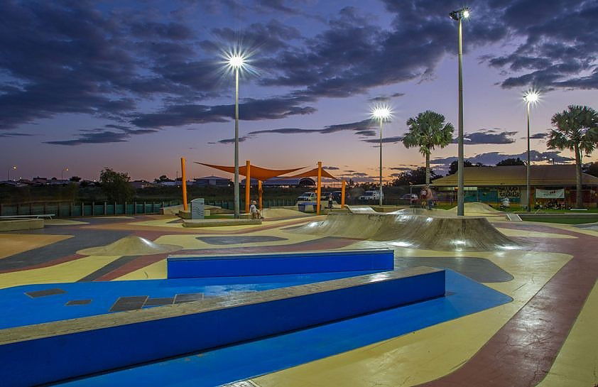The Onslow Skatepark, located in Onslow, Western Australia, was originally built in 2012 as part of the Shire of Ashburton’s effort to create community recreational facilities. The skatepark features an organic-shaped bowl, a pump track, cantilever banks, vert walls, and ledges. It was designed to cater to all skill levels and includes unique elements inspired by the local environment, such as representations of the region’s iconic termite mounds.